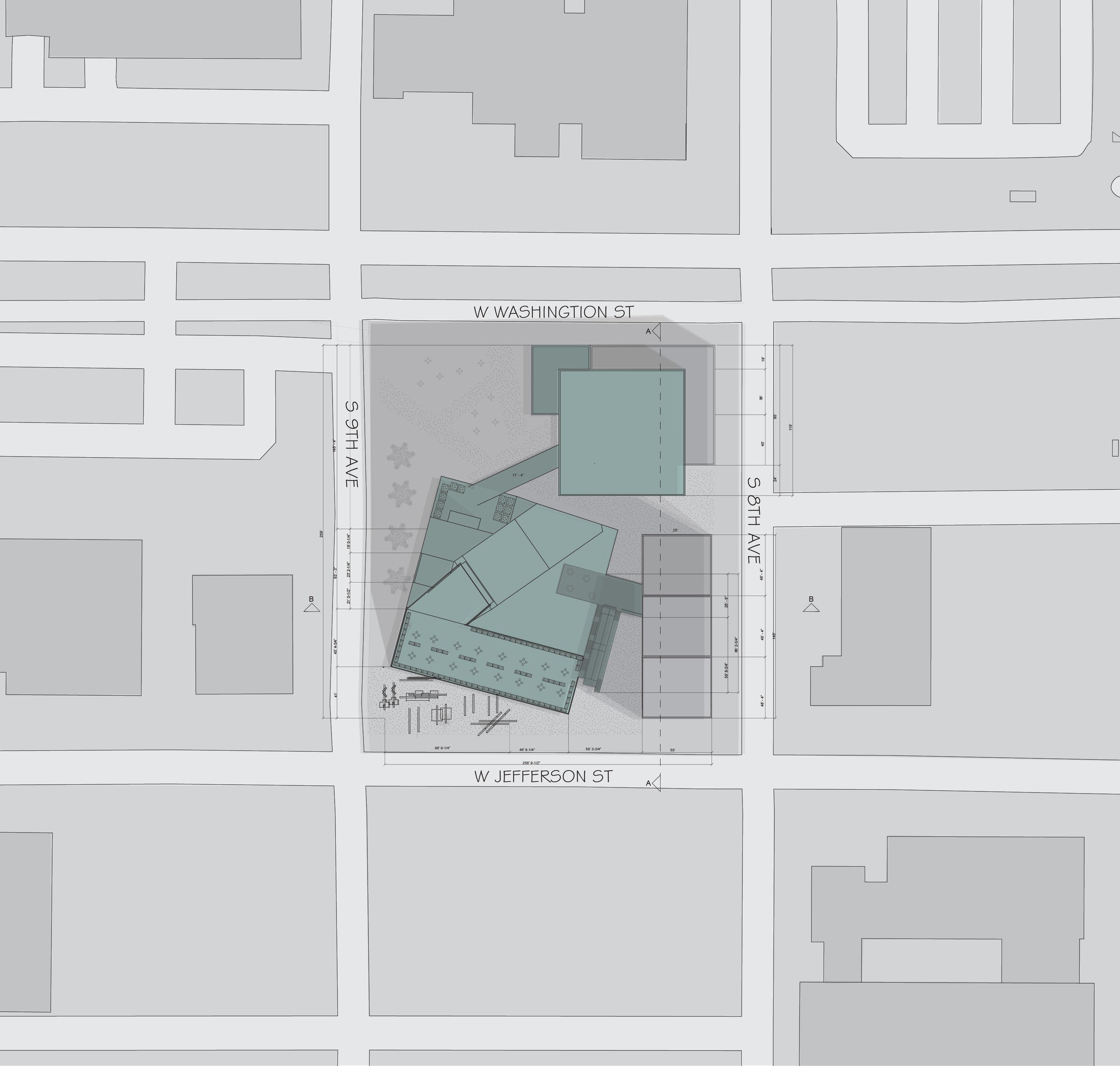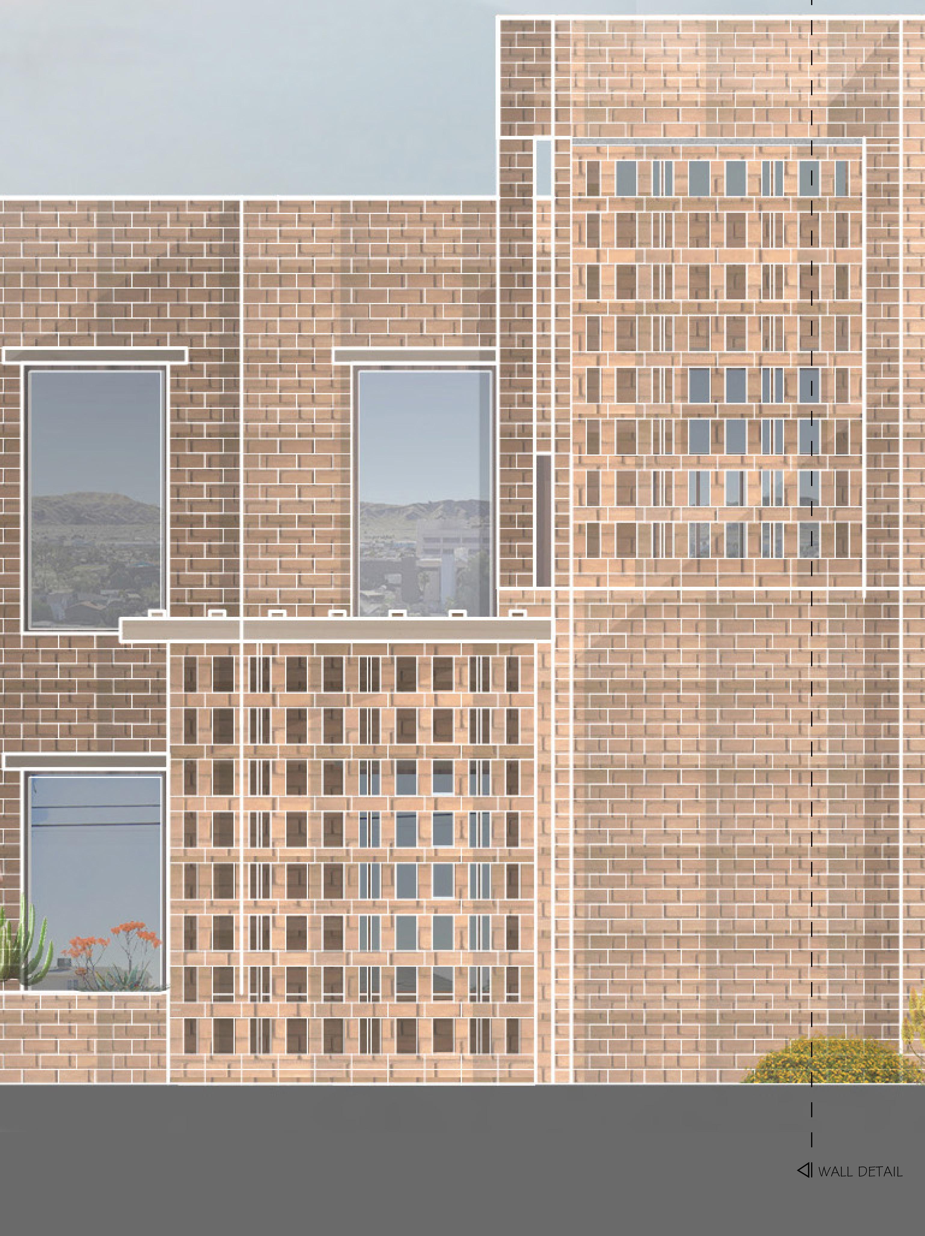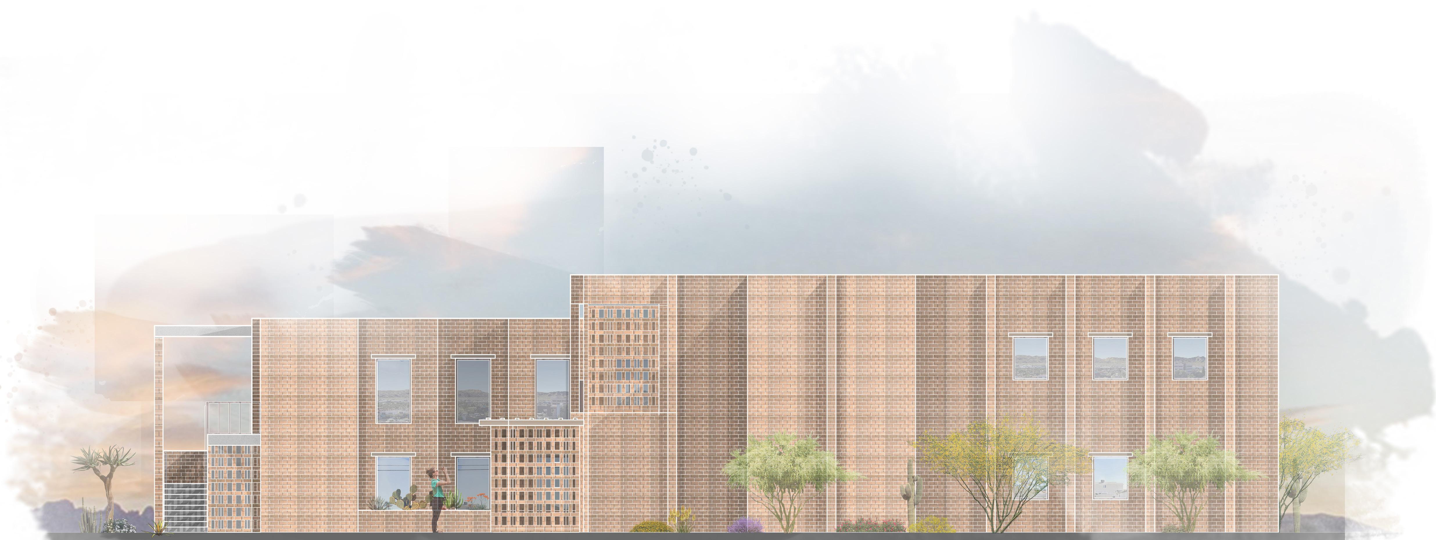 The building follows the CIty of Phoenix and IRC code requirements, utilizing a brick façade to reflect the material character of surrounding structures. The exterior expression is intentionally monolithic, allowing the building and ramp to appear grounded and contextual as if emerging naturally from the fabric of the Warehouse District.