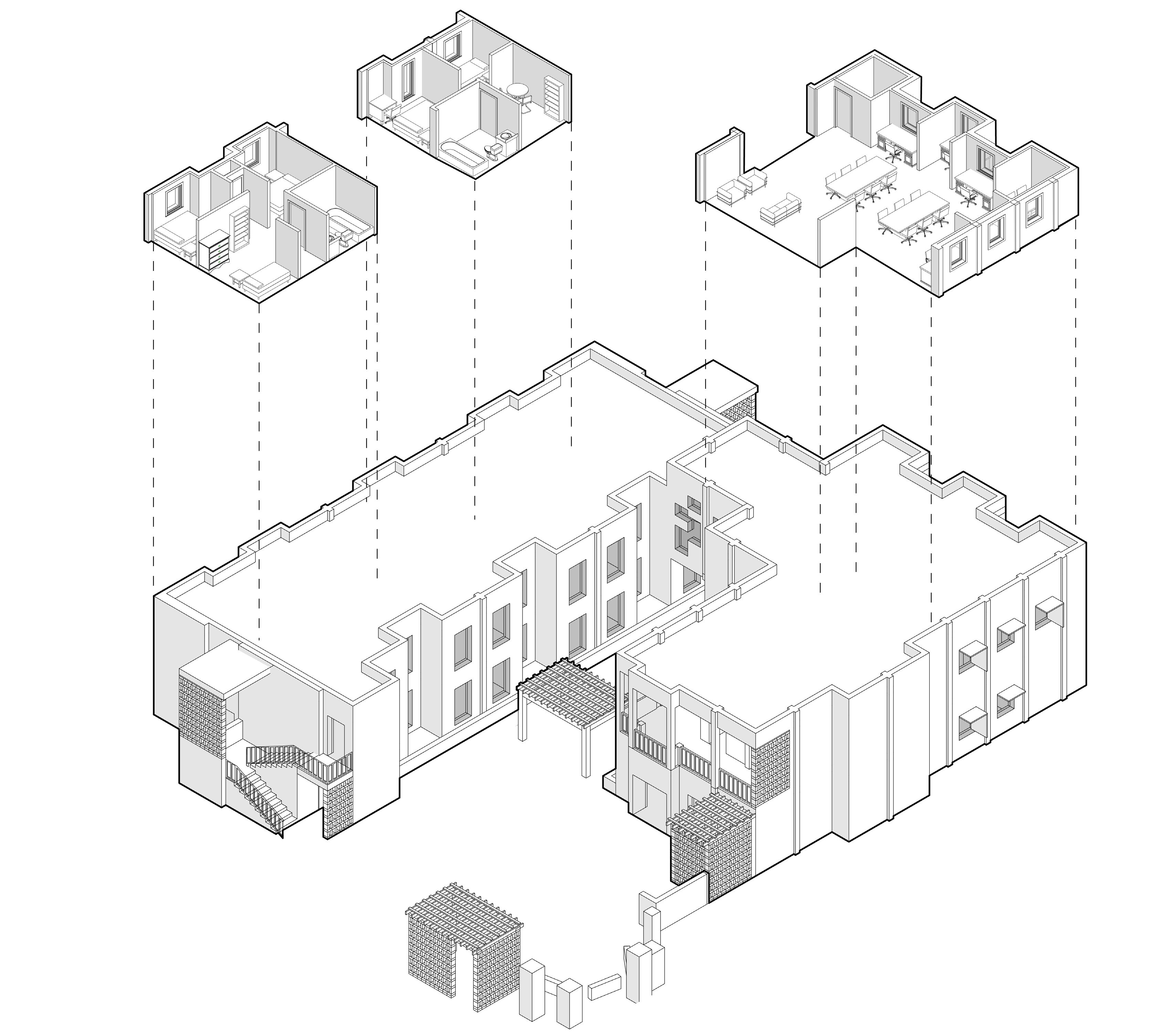 The building form is directly informed by programmatic hierarchy and privacy gradients. Private spaces, including bedrooms and bathrooms, are oriented to the north, while semi-private and public spaces progressively open toward the south. Communal areas such as kitchens, dining spaces, and living rooms are positioned to encourage shared use and social interaction, reinforcing the project’s emphasis on collective living.