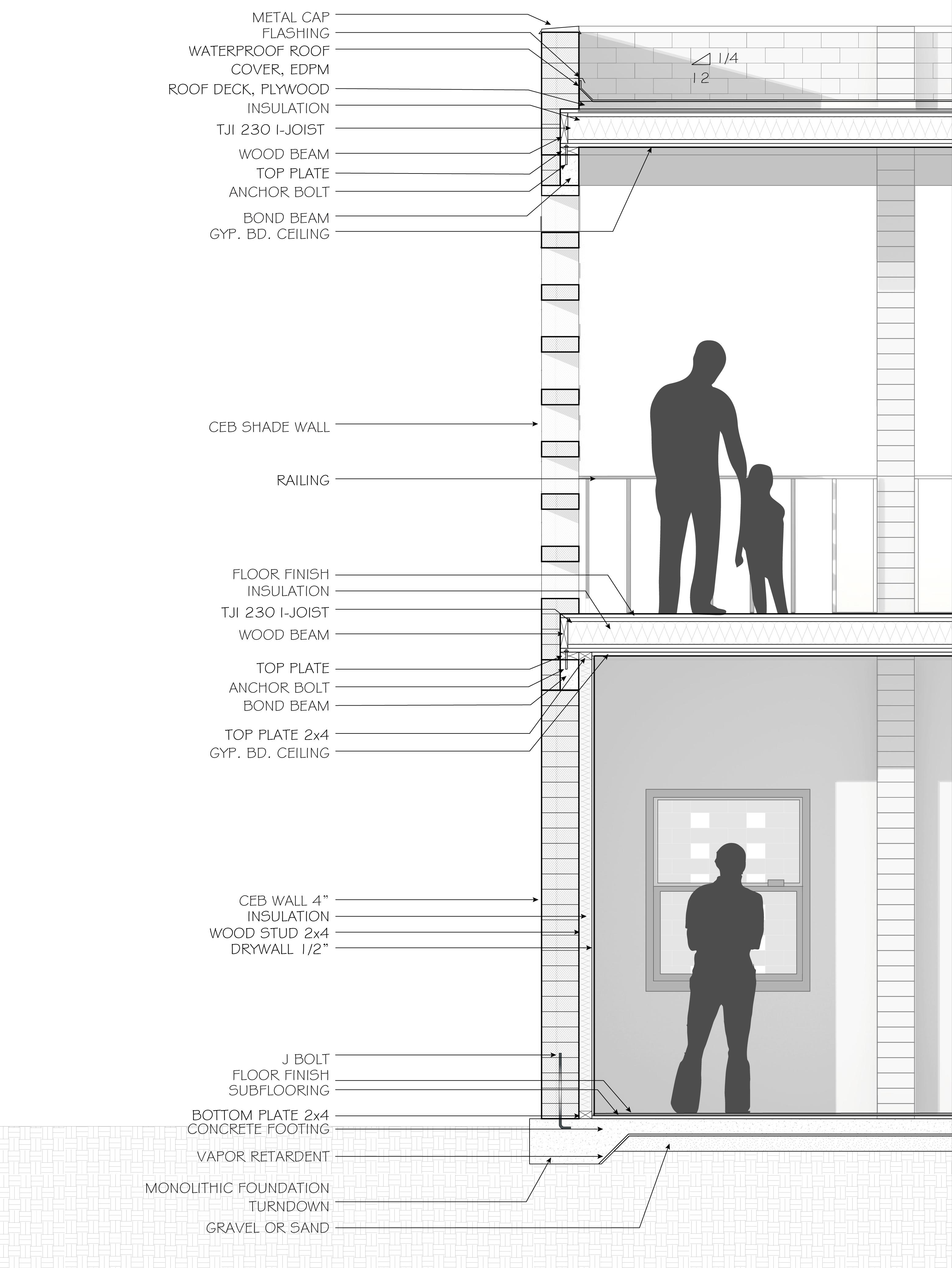 The primary building material is Compressed Earth Block (CEB). An affordable material that is locally available in Arizona and known for its thermal performance. CEB is used throughout the building exterior to enhance durability and passive environmental control. Due to the material’s limitations for integrated services, interior partitions utilize conventional wood framing to accommodate plumbing and electrical systems.