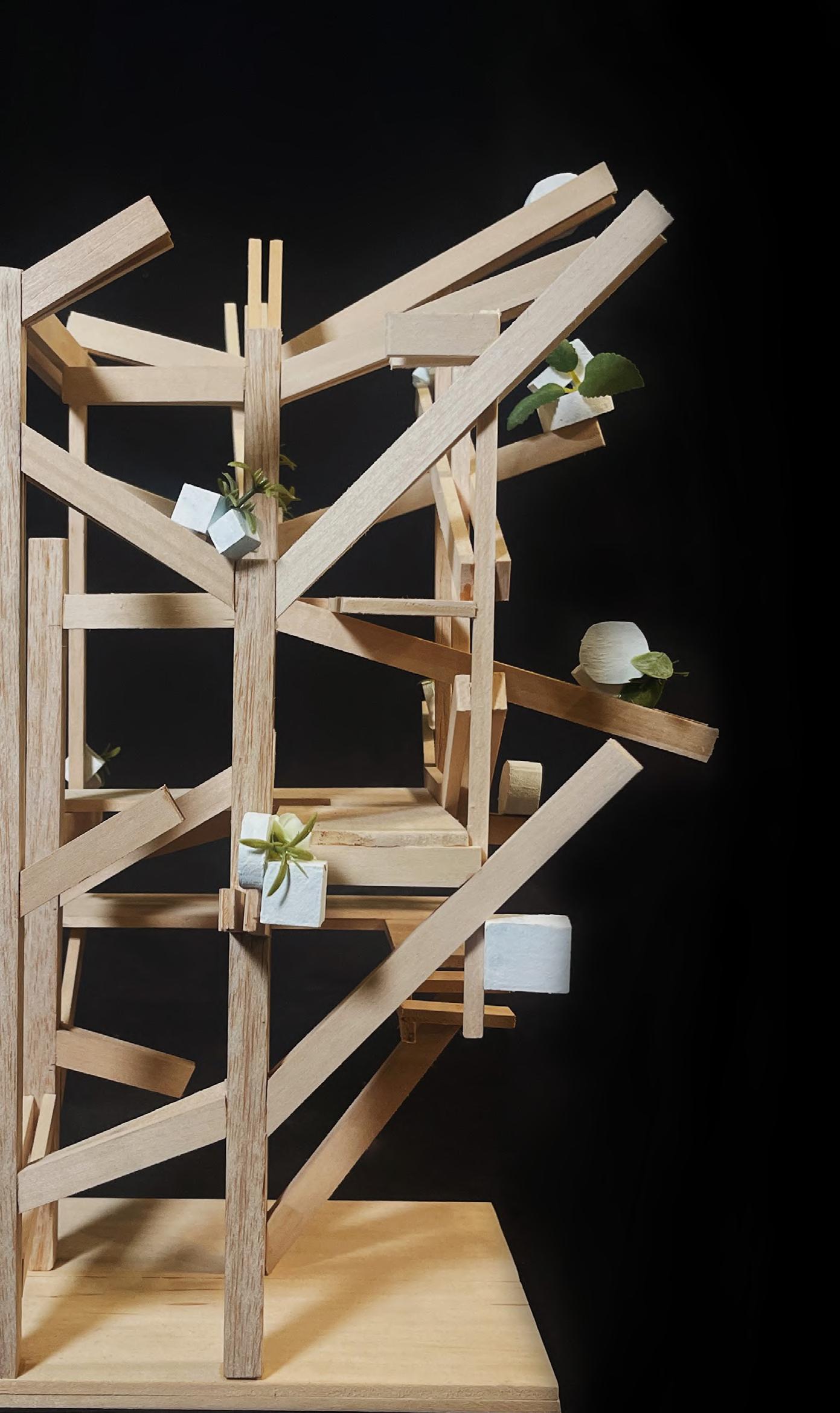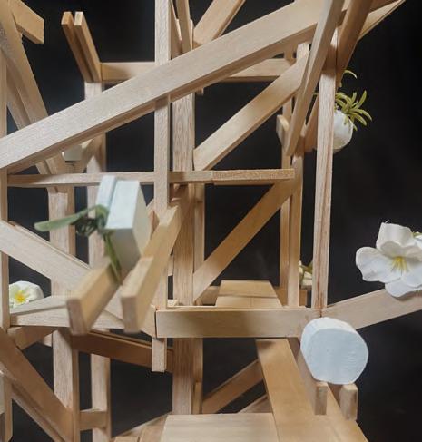 The framing structure extends at various angles, cantilevering well beyond the exterior of the core structure. While many of the vertical elements continue to stay static, the beams break this typical grid, bracing to and through the substructure. The ornament then is attached to these extended branches reimagining the ways plants and food is stored in the original Nest We Grow.