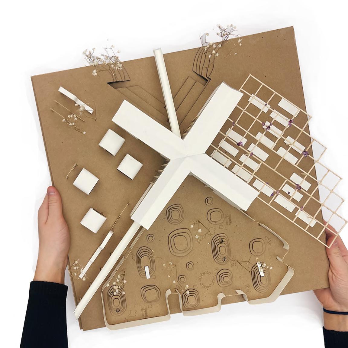 At the center of the X rest is the main program, an Educational Non-Profit women’s center. Like many other resource centers the program is broken down into 2 parts. On the bottom floor rests an educational center, acting as an open forum for debate and discourse. Rather the addendums to the upper levels act as warehouses for women to collect resources.