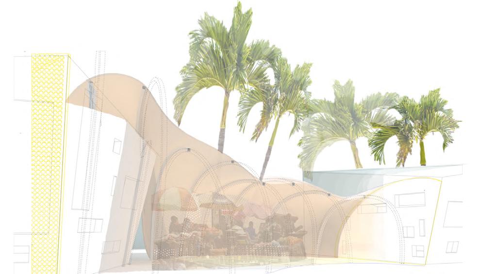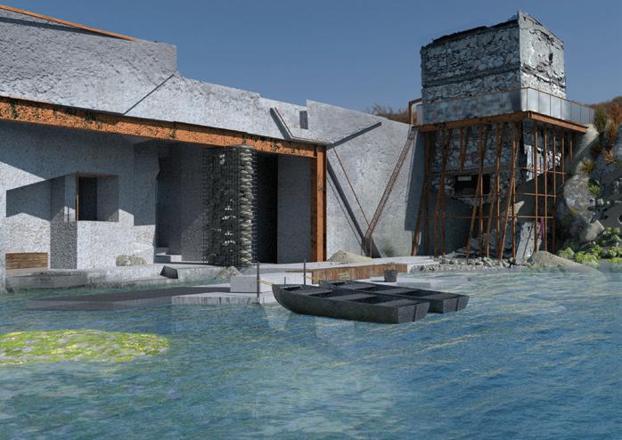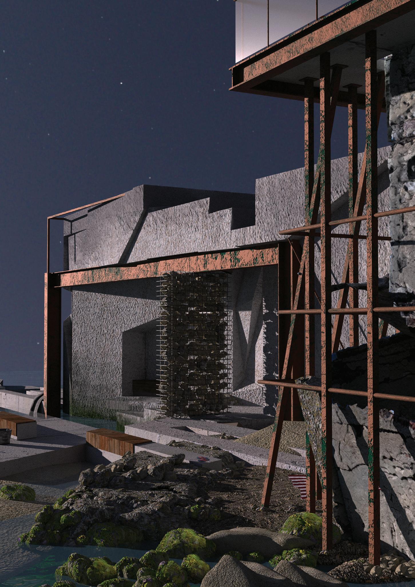 At the pier, while maintaining a monolithic wall on one side, the opposite is used to create narrowing spaces framing back out to Rio Marina for users to explore and occupy for different fishing activities. Located on this side there are a multitude of level changes, allowing the ocean to over occupy and submerge programs and create small baths in the pier when the water levels are high enough. This allows both program and land to be at rest during moments of high tide.