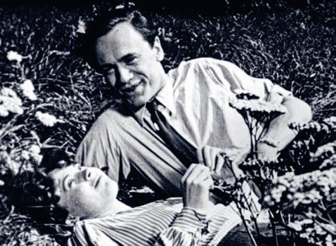 Stillfoto fra Drømmen om i Morgen. Filmens unge modstandsmand Svend (Bendt Rothe) har allerede kort efter befrielsen tabt fremtidstroen, men Karen (Karin Hasselbalch) viser ham vejen til en lysende socialdemokratisk fremtid med fællesskab, boliger – og atomdrevne biler. Filmen var instrueret af Peter Lind med manuskript af redaktør Harald Engberg og Poul Hansen, sekretær i Arbejderbevægelsens Informations Central (AIC), og musik af arbejderdigteren Oskar Hansen. Socialdemokratiet.