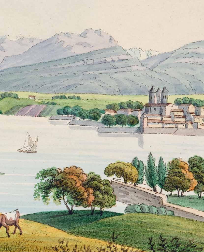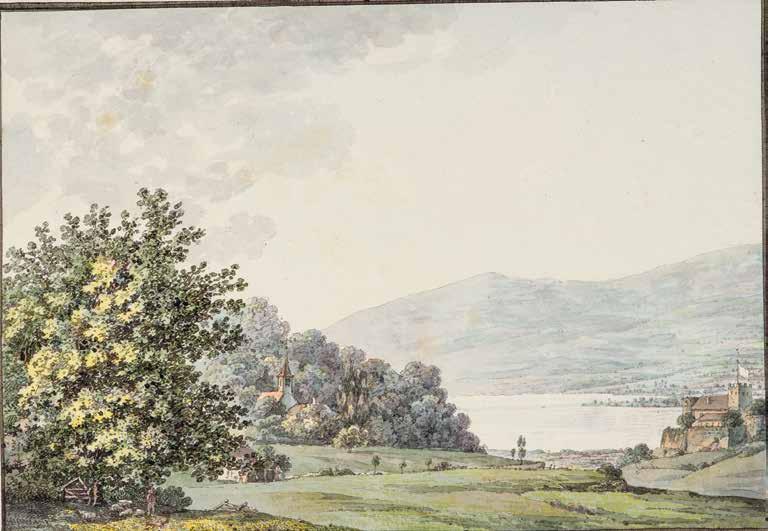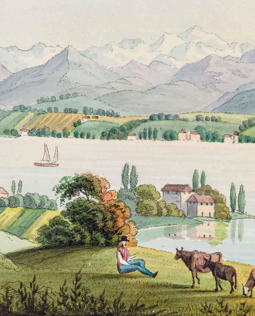 Vandkoloreret tegning af et idyllisk alpelandskab, signeret den 29. september 1818, hvor hertug Christian August II og hans bror, prins Frederik, var i Schweiz. En af deres engelske venner berigede hertugens stambog med tegningen. Udpegning og gengivelser af det naturskønne, seværdige landskab var en måde at lære sig turisme på.