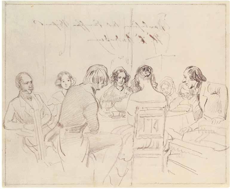 Digteren H.C. Andersen besøgte ofte den hertugelige familie. Her læser han op en dag ved tebordet i november 1845, hvor prinsernes tegnelærer Carl Hartmann fangede situationen. Tilhørerne er blandt andre hertugen til venstre, prinsesse Louise, hertuginden og prinsesse Amalie samt prins Frederik med ryggen til.