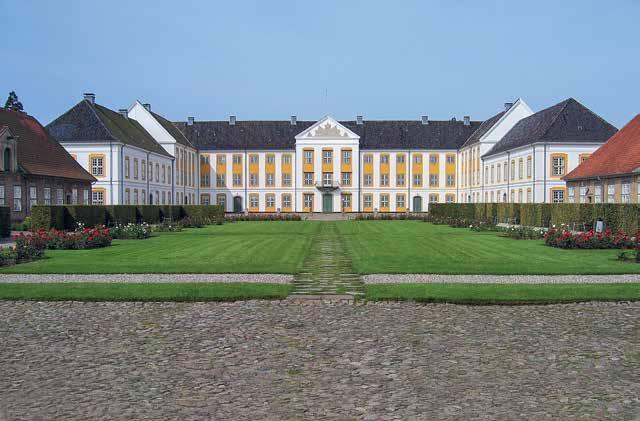 En rejse begynder og slutter hjemme, og det var for hertugfamilien indtil 1848 de to slotte Augustenborg og Gråsten i Sønderjylland. Her hovedsædet Augustenborg Slot, set fra gårdsiden, som det stod færdig fra 1770’erne. I midten indgang til havesalen, i højre fløj slotskirken. Udlængerne til højre rummede ridehus, godskontor og det hertugelige bibliotek, til venstre var herskabsstalden, og anlægget sluttedes på kameraets position med porthus og vognporte.