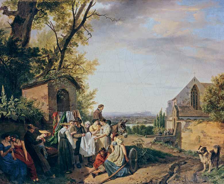 En stor del af turismens etablerede oplevelser var fra begyndelsen folkeliv som denne scene på en vej i 1814, antagelig i Genèves omegn, malet af schweizeren Wolfgang-Adam Töpffer. Kræmmeren falbyder sine varer, hunden ser til, og en ung mand sidder på bjergegnenes praktiske ridedyr, et æsel, som også Schweiz-turister hurtigt fandt ud af at værdsætte.