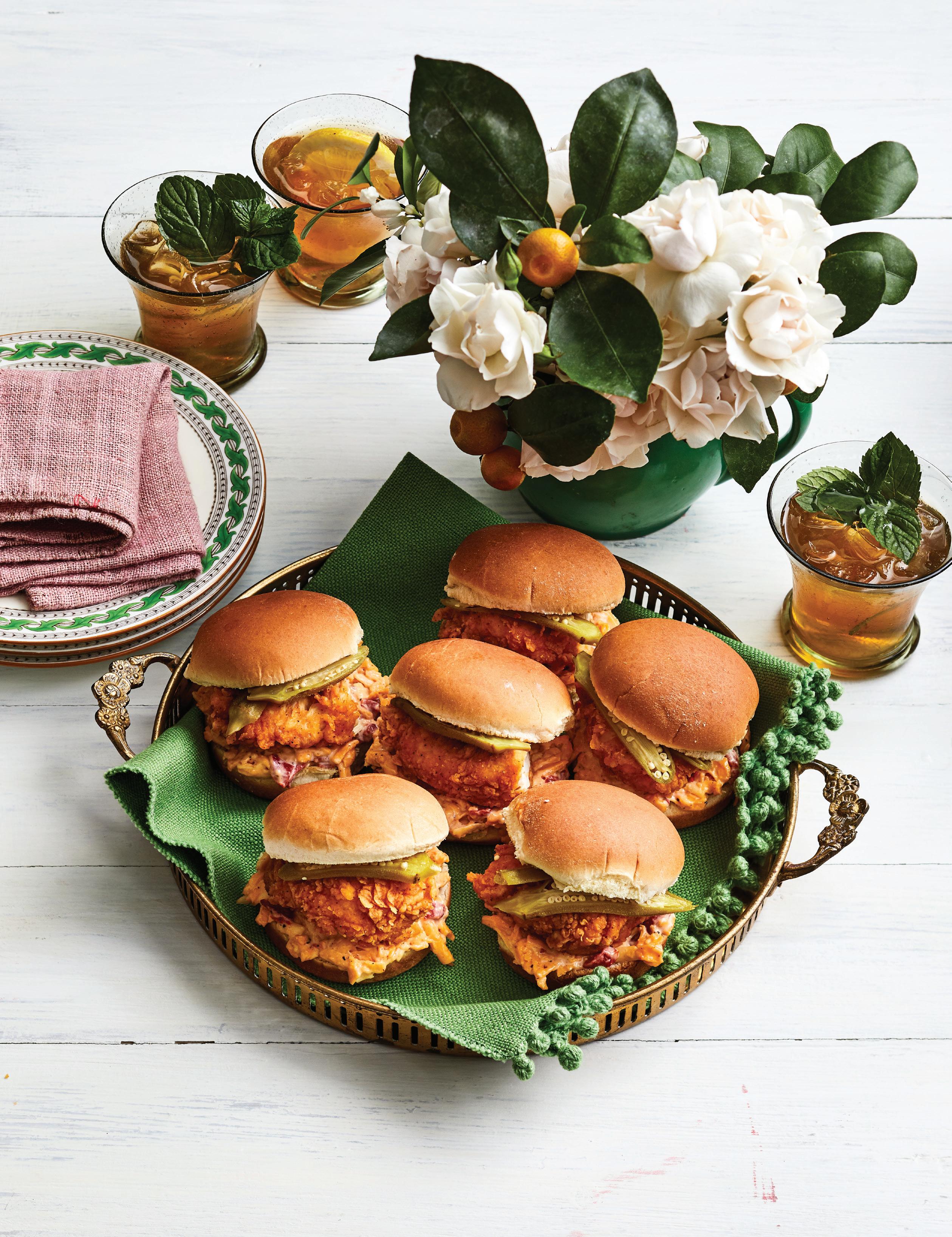 I grew up watching the Masters with my grandparents, and the picturesque scenes of pink and white flowers, the sounds of golf claps and hushed announcers, and the taste of my nana’s pimiento cheese fill my head every April. My pimiento cheese recipe differs from both the famous Augusta National recipe and the one Nana made, because I gussy it up with Gouda cheese, Worcestershire sauce, sweet onion and paprika. I like to serve it on slider buns with fried chicken tenders and pickled okra, topped with toothpicks fashioned after the iconic Augusta yellow tee flag. They’re so good that your guests will want to stay long after the Green Jacket ceremony ends. Spread about ¼ cup (62g) of pimiento cheese on bottom half of each bun.