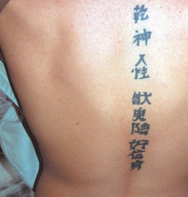 This time,permanentblack scars come courtesy of Jules (second year,journalism). These Japanese calligraphy or ‘kanji’ tattoos were imprinted on his flesh by Simon @ Oriental Arts. They read (from top down): "Heaven, God, human, animal, demon, Hell, love, faith, devotion” . So,if anyone can read Japanese and they actually say "salmon sushi special" or "half price dumplings",please let him know.