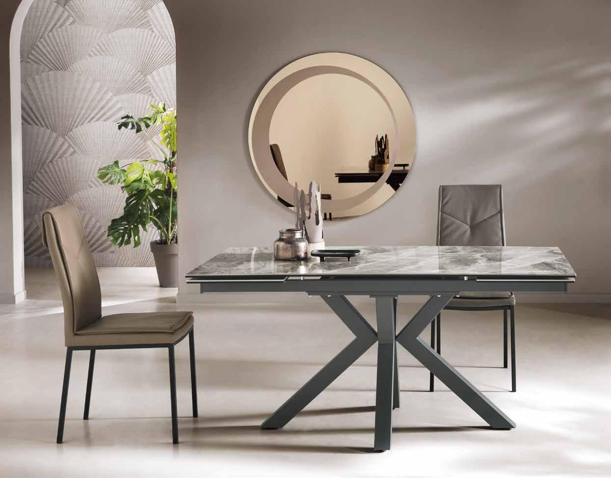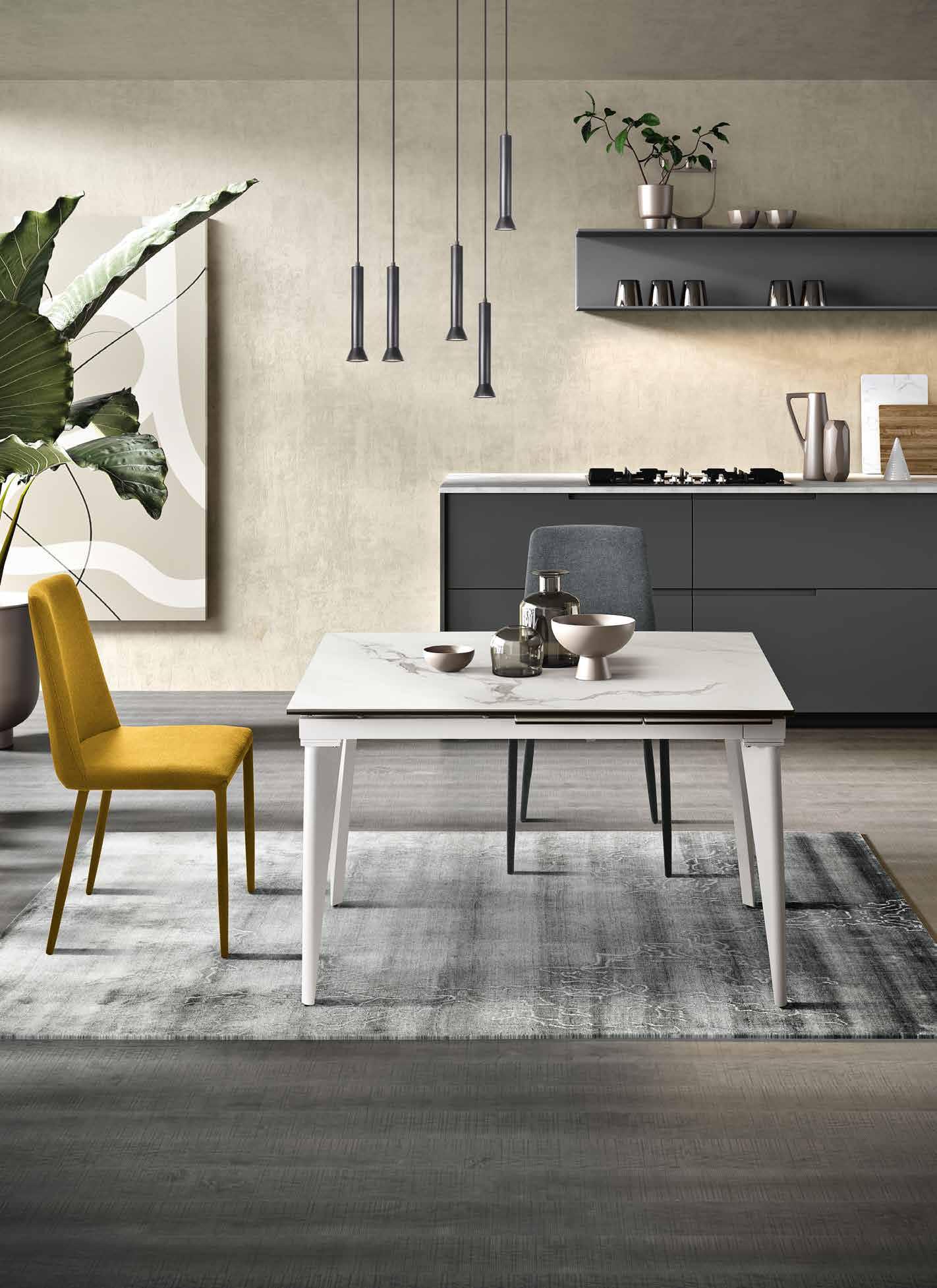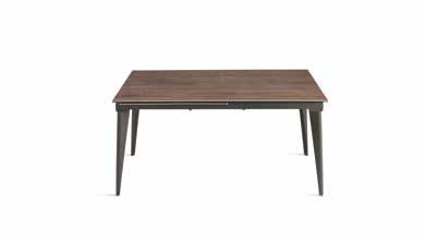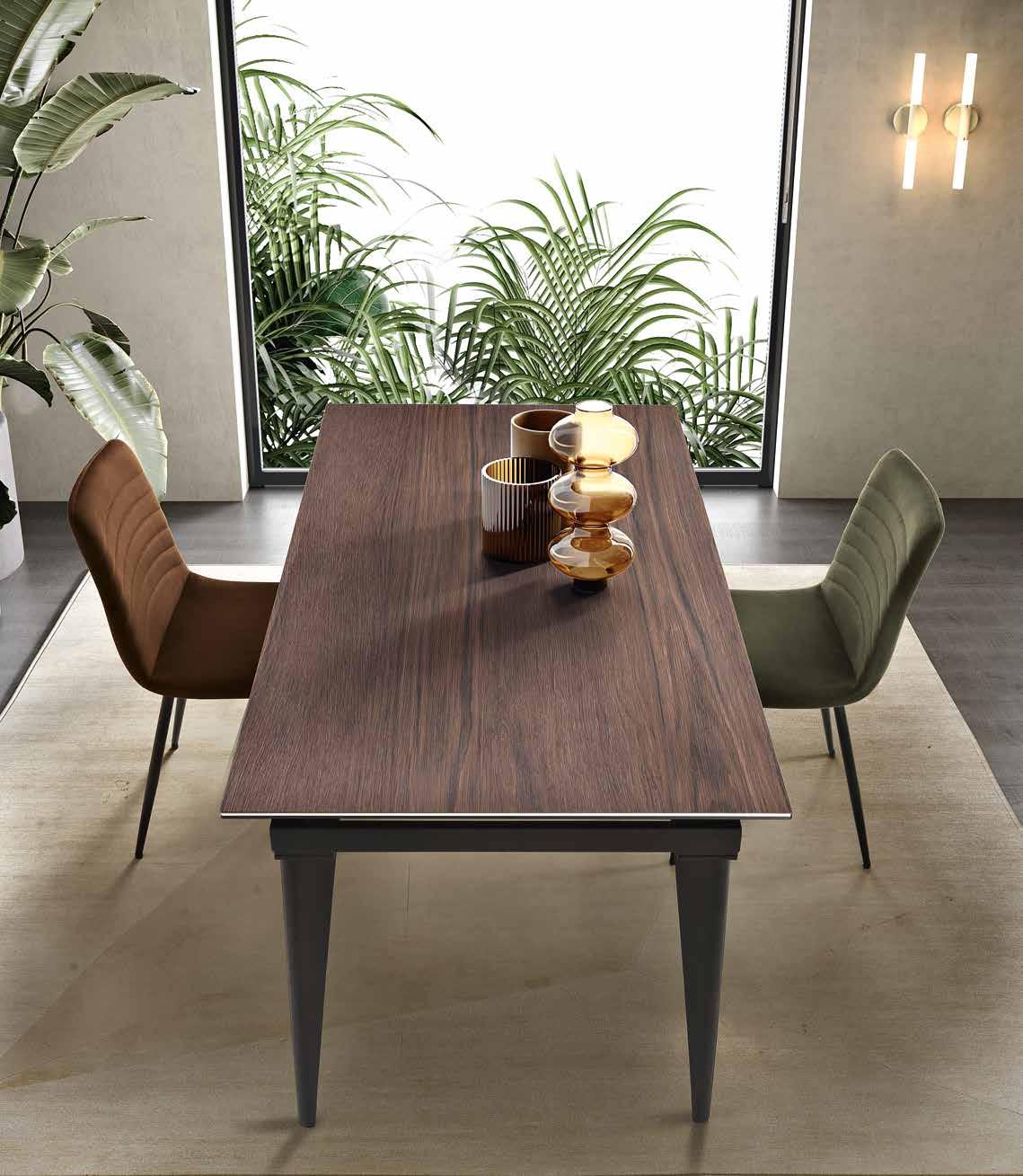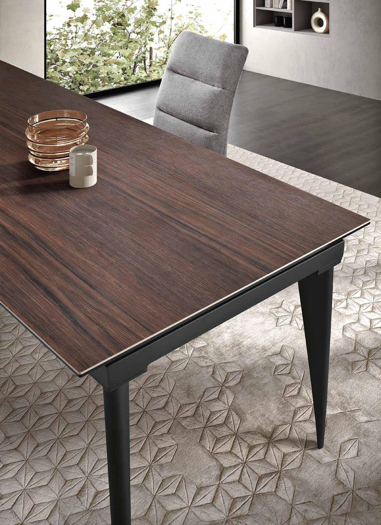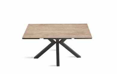 Tavolo allungabile con due allunghe laterali da 40 cm; base in metallo verniciato e piano in grès porcellanato effetto marmo ed effetto legno. Disponibile in diversi colori.