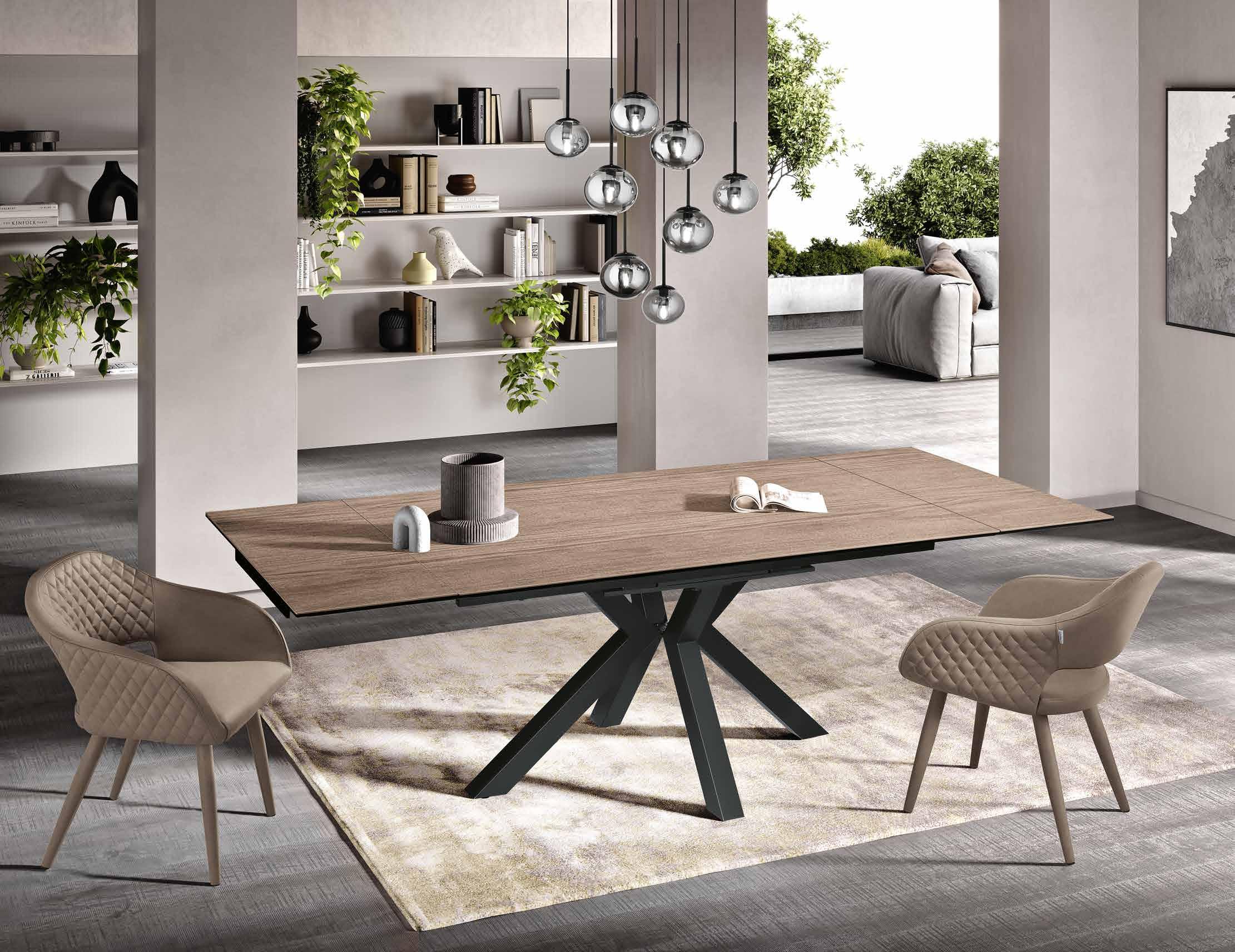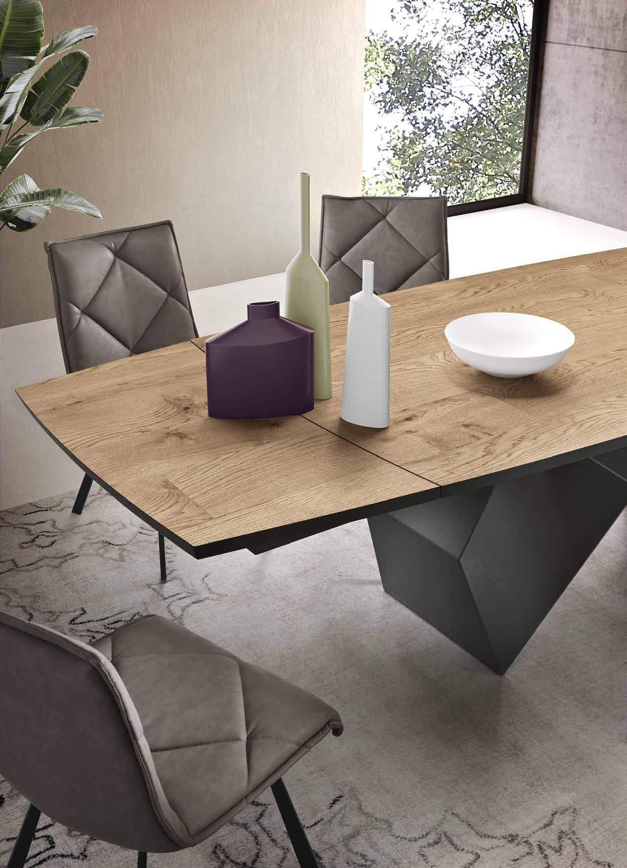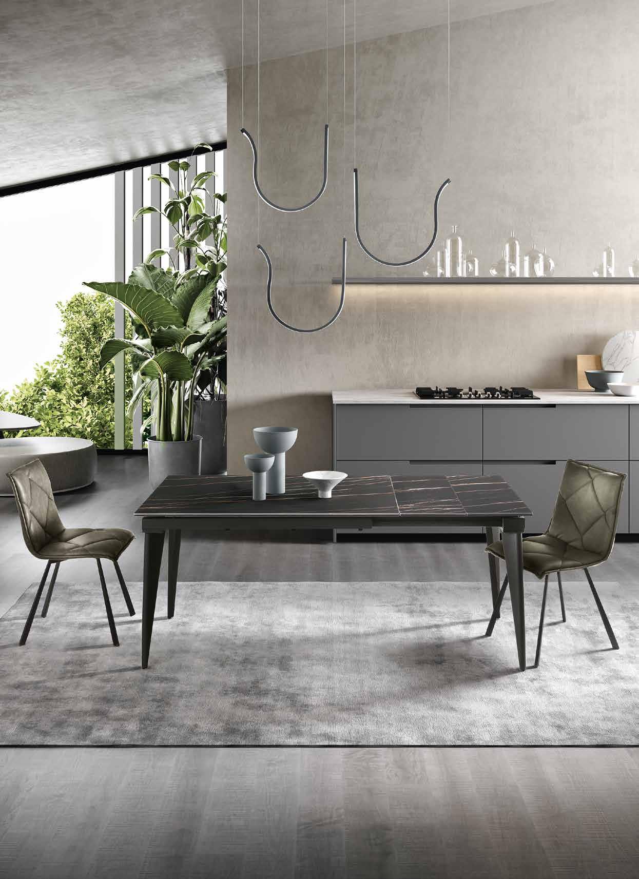 Tavolo allungabile con due allunghe laterali da 40 cm; base in metallo verniciato e piano in grès porcellanato effetto marmo ed effetto legno. Disponibile in diversi colori.