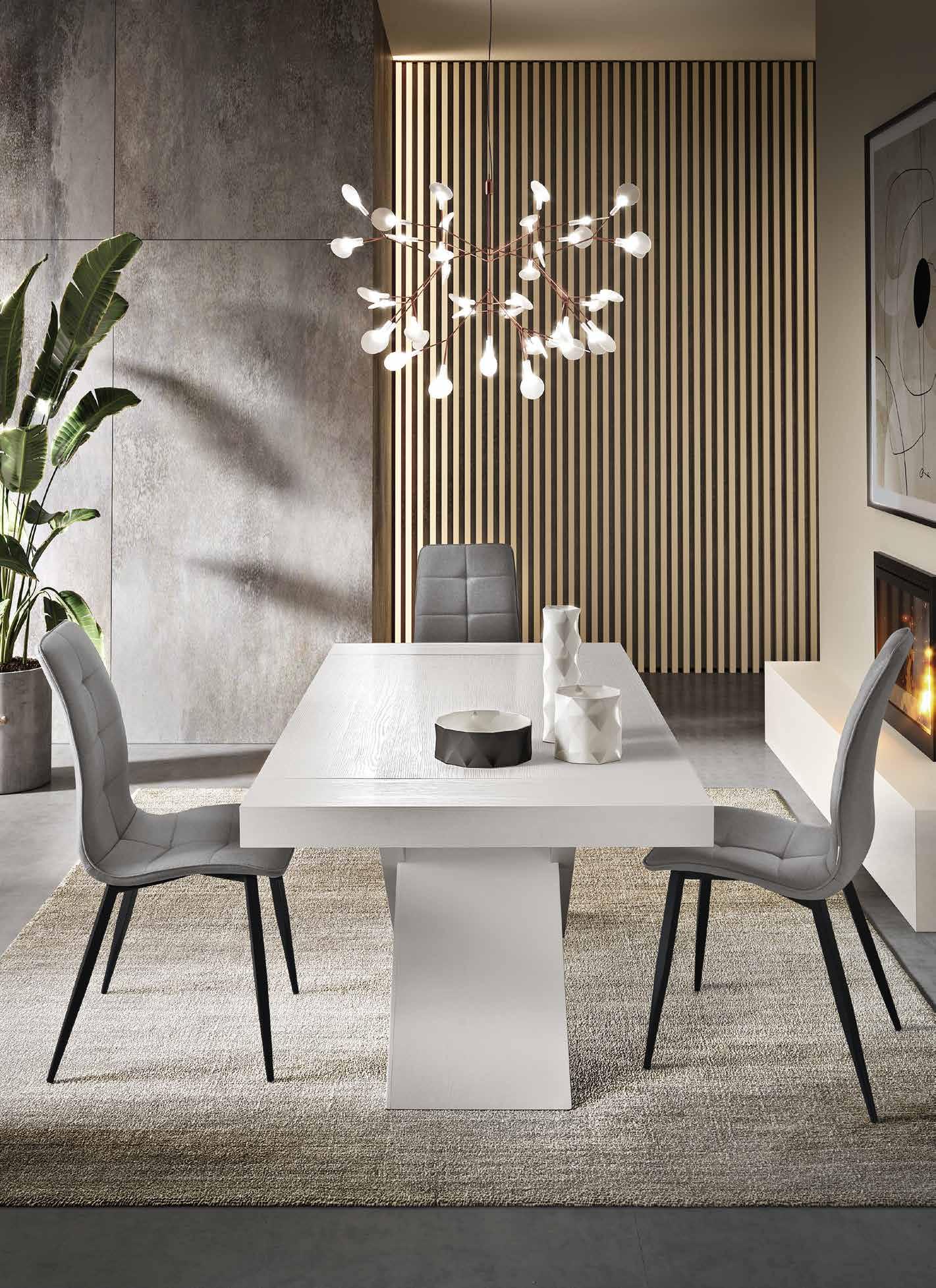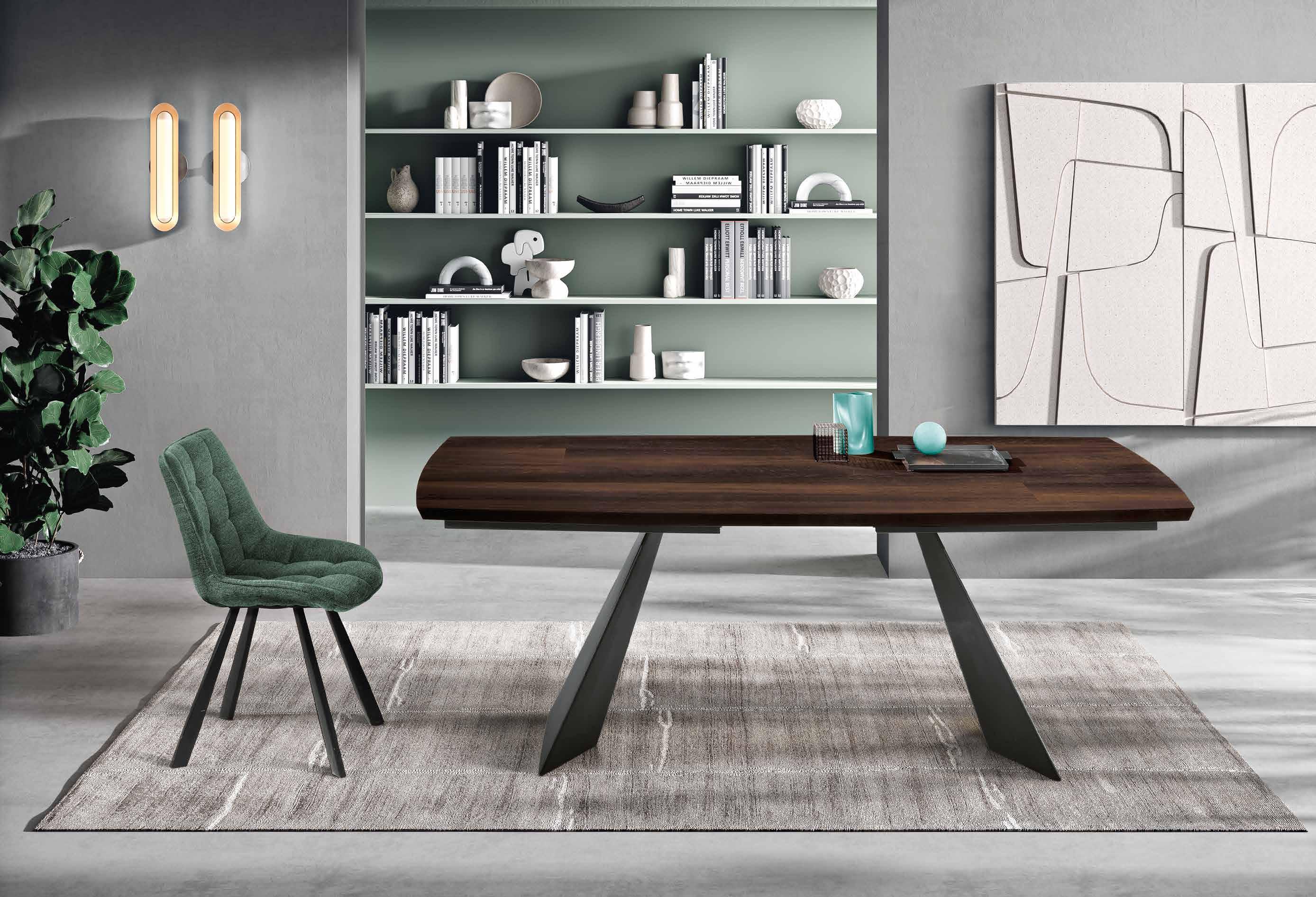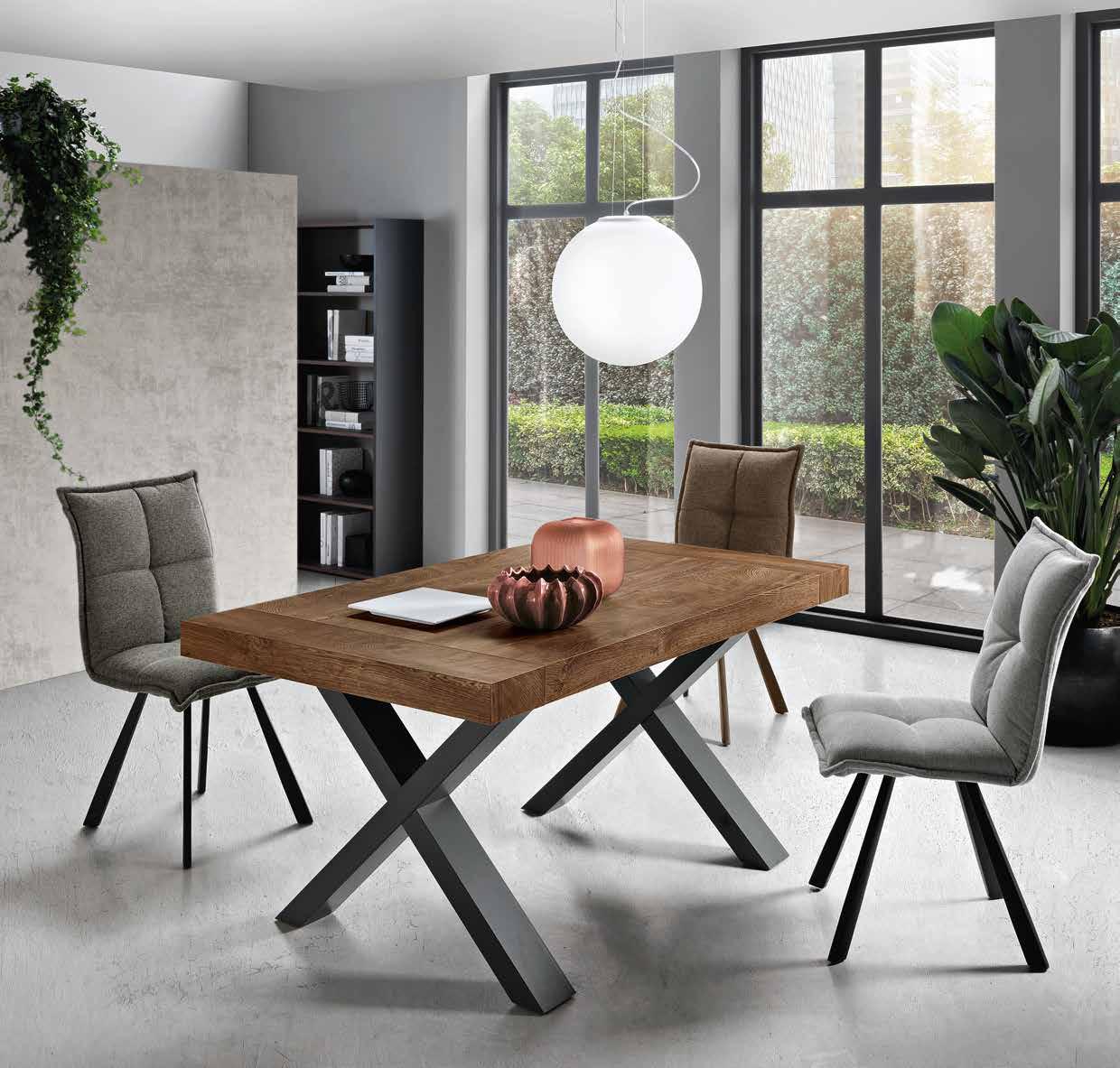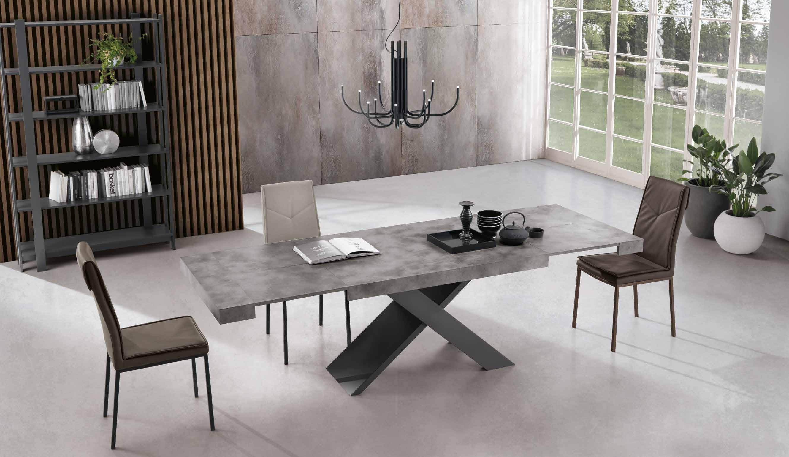 Tavolo allungabile con due allunghe laterali da 40 cm; base in metallo verniciato e piano in grès porcellanato effetto marmo ed effetto legno. Disponibile in diversi colori.