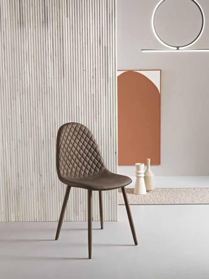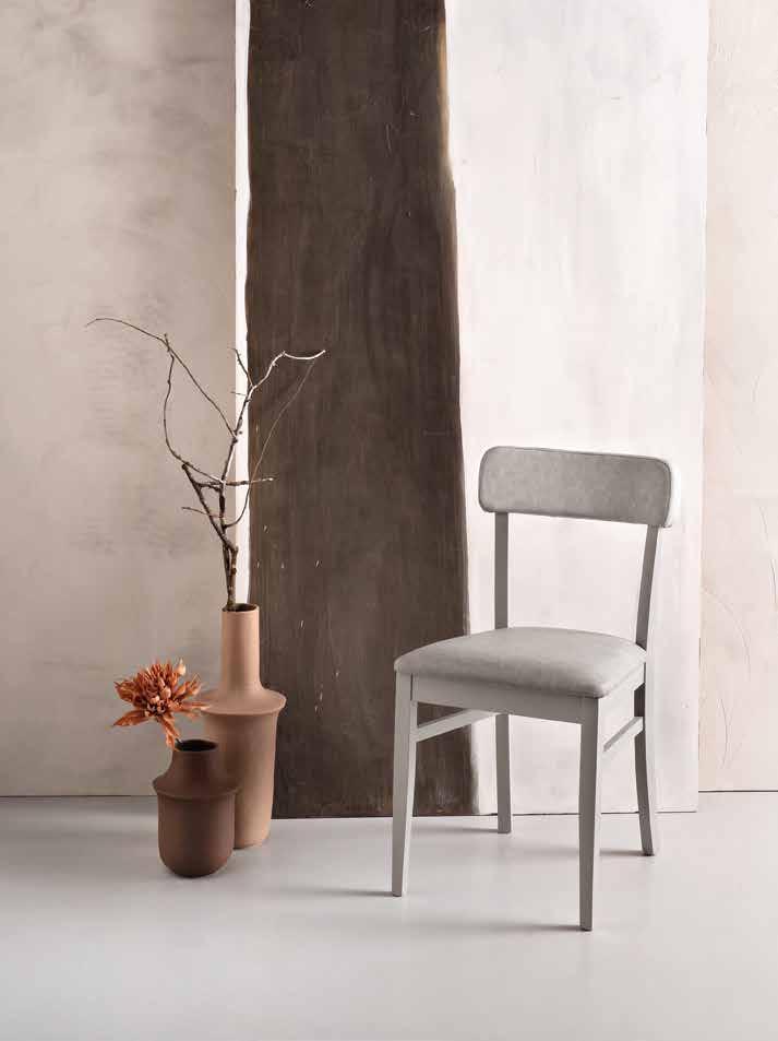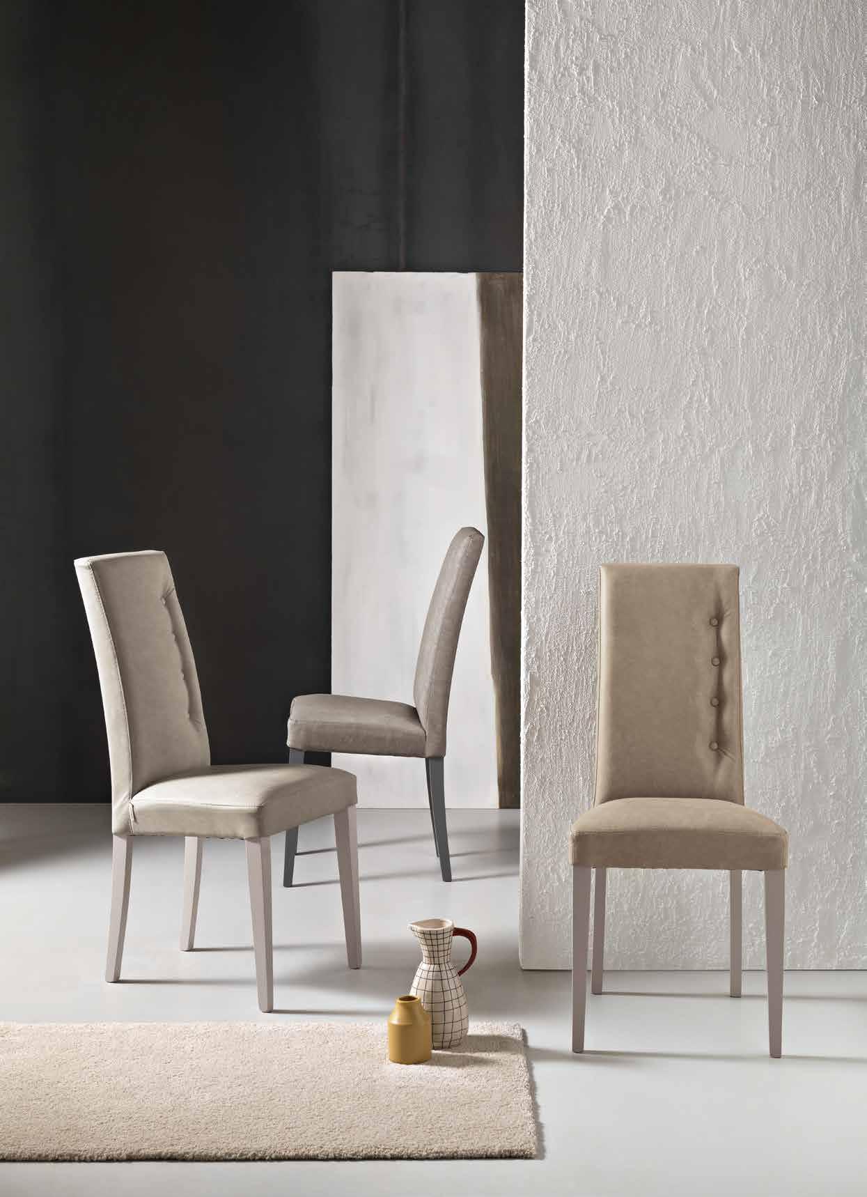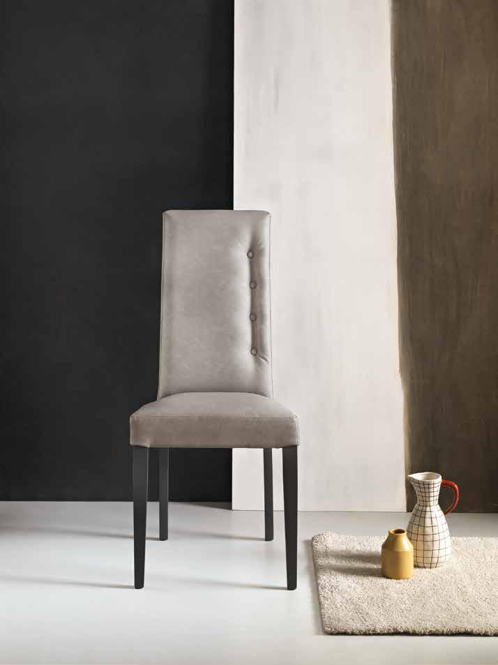 Sedia in tessuto alcantara con gambe in legno; schienale capitonnè.