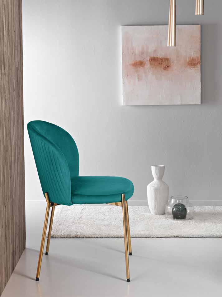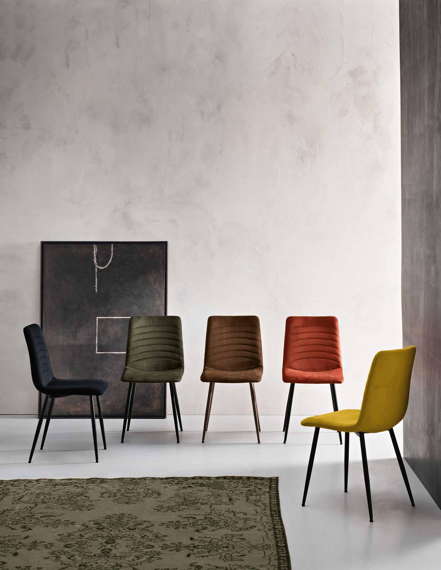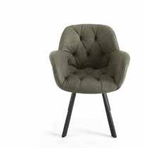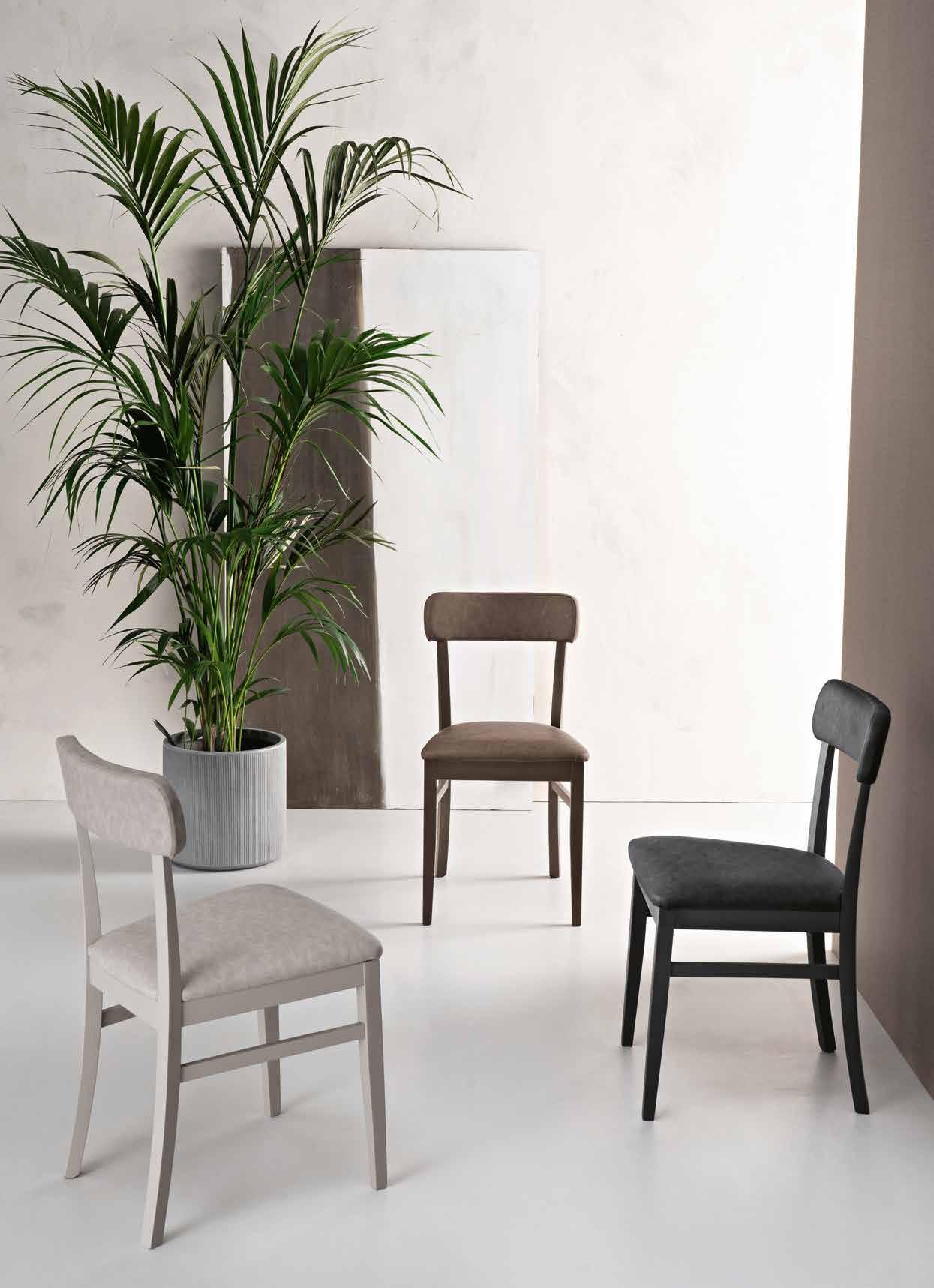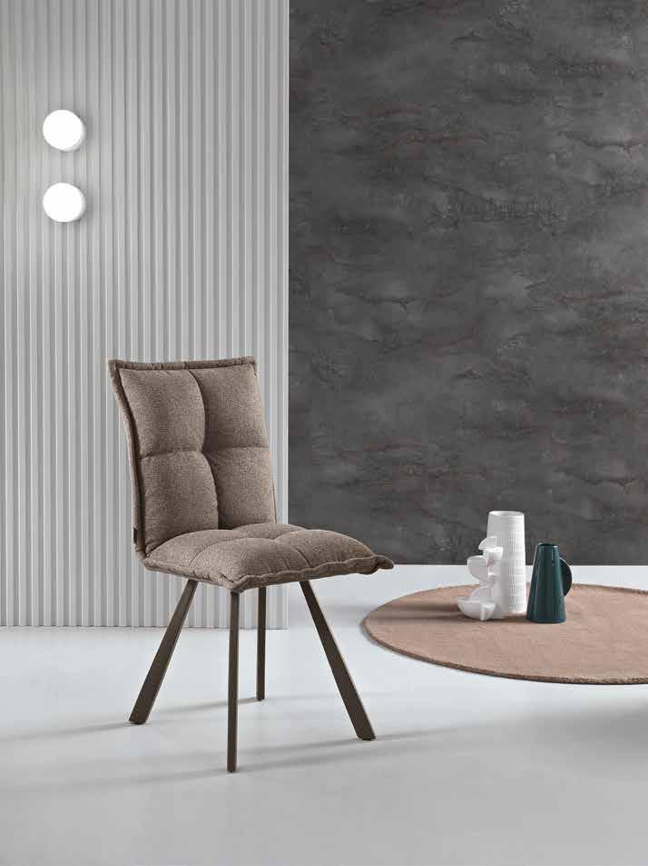 Sedia in tessuto alcantara con gambe in legno; schienale capitonnè.