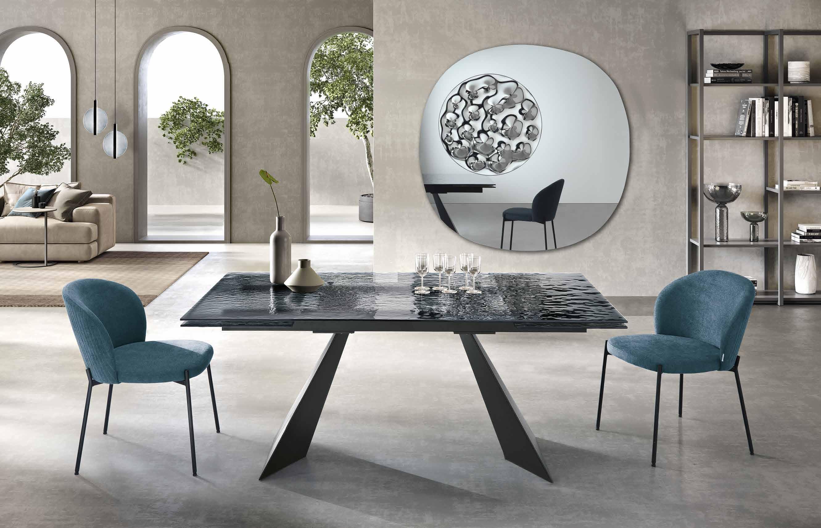 Tavolo WATERS 160 (+40 +40) x 90 cm vetro martellato blu trasparente, base in metallo nero - Sedia NELLI