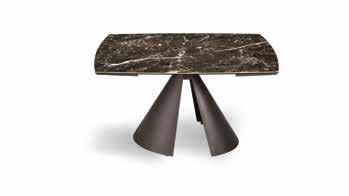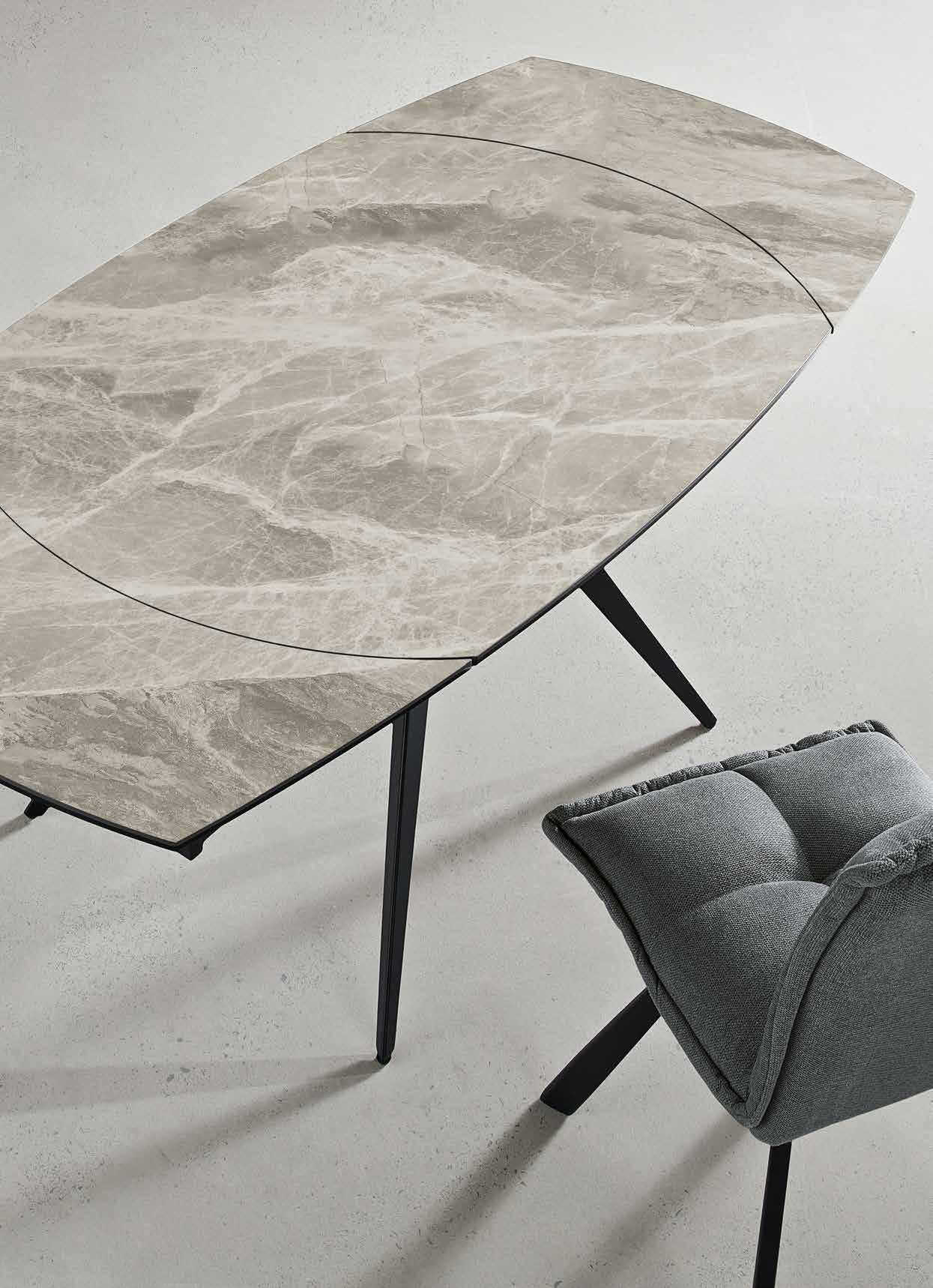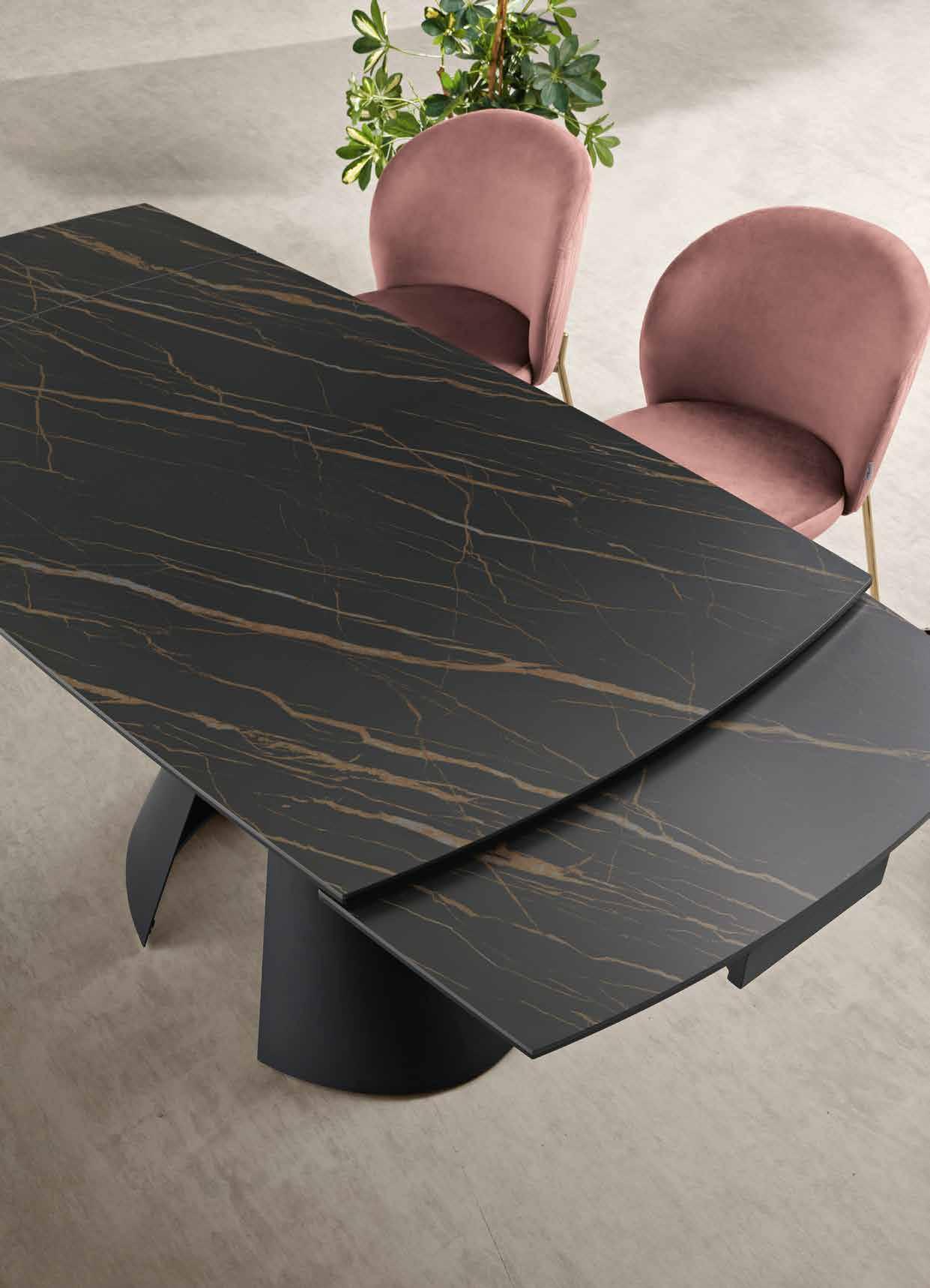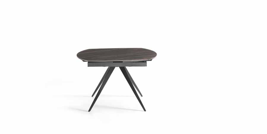 Tavolo allungabile con meccanismo a rotazione, due allunghe laterali da 30 cm; base in metallo verniciato e piano in grès porcellanato effetto marmo Disponibile in diversi colori.