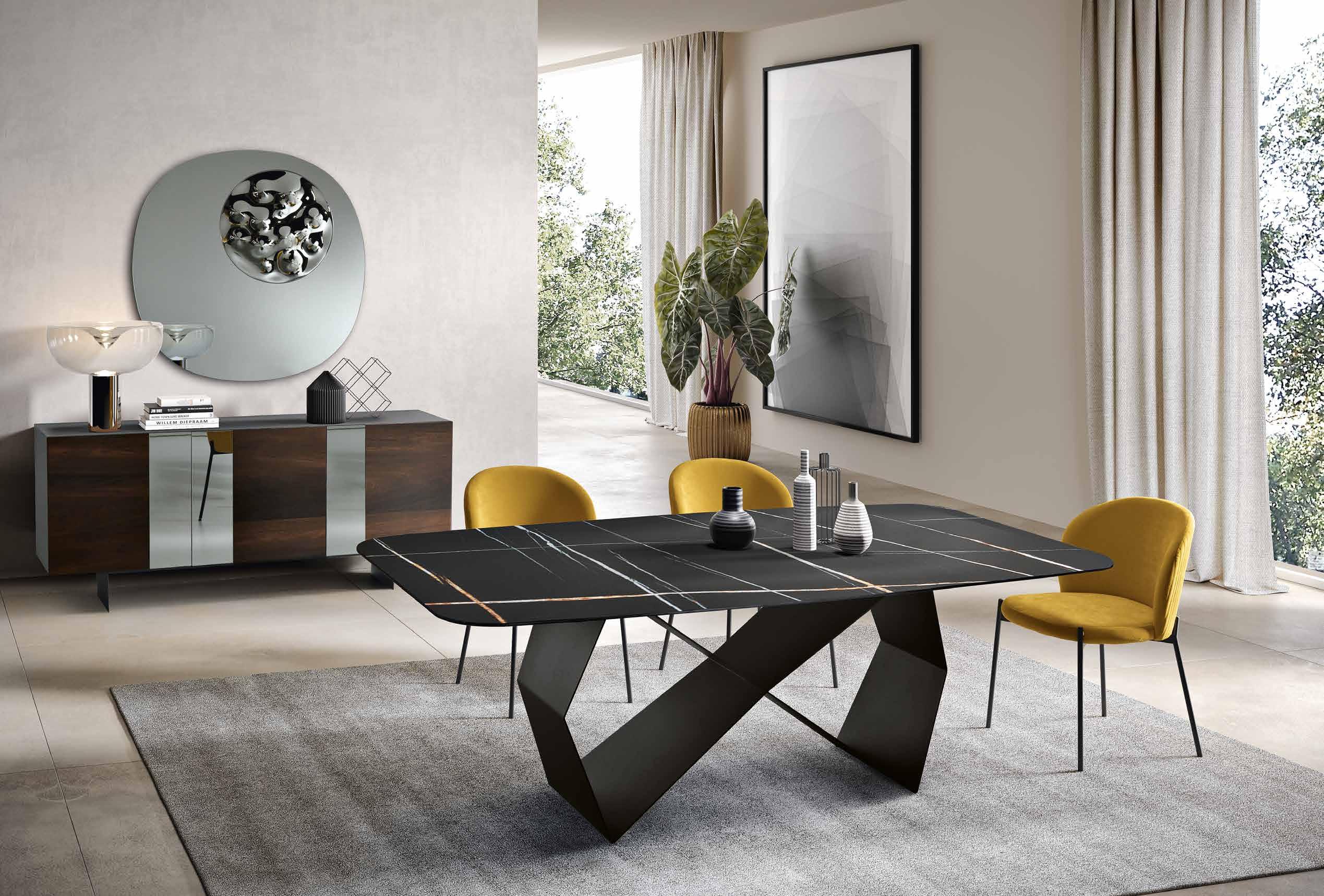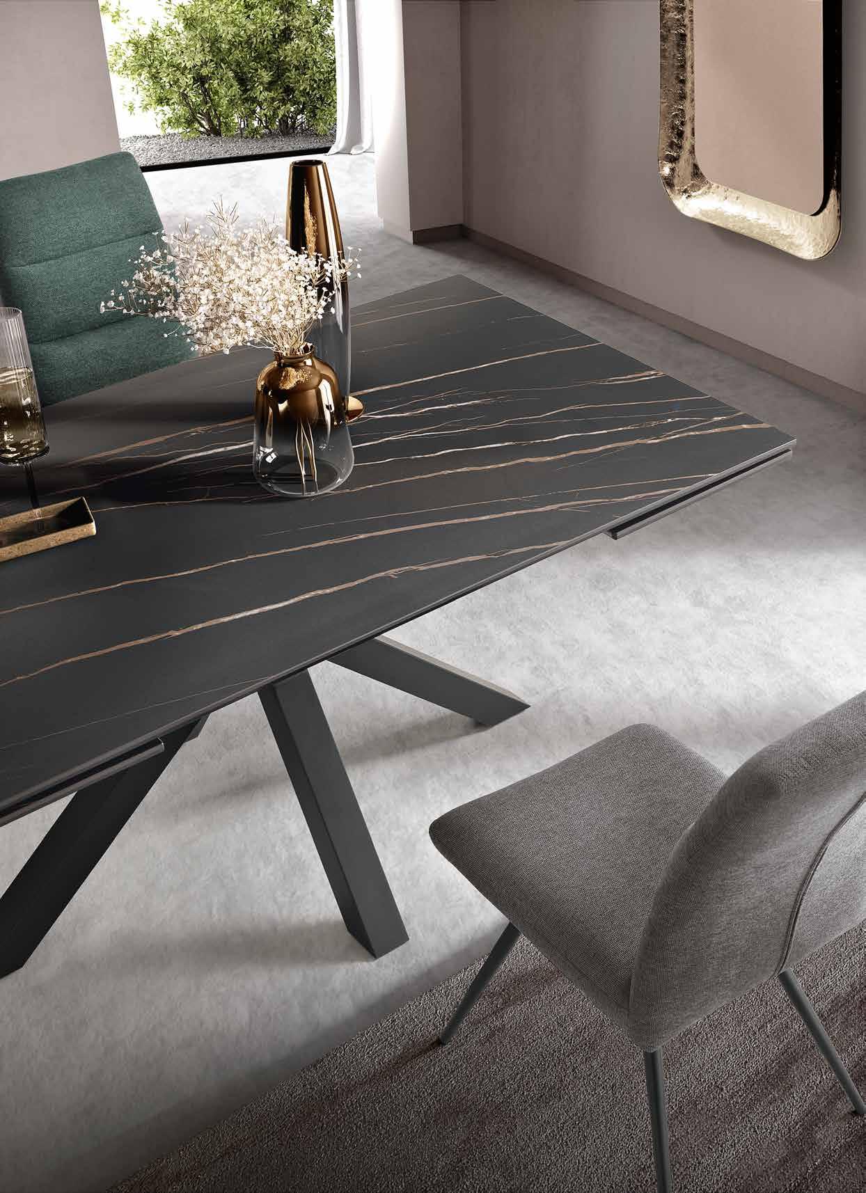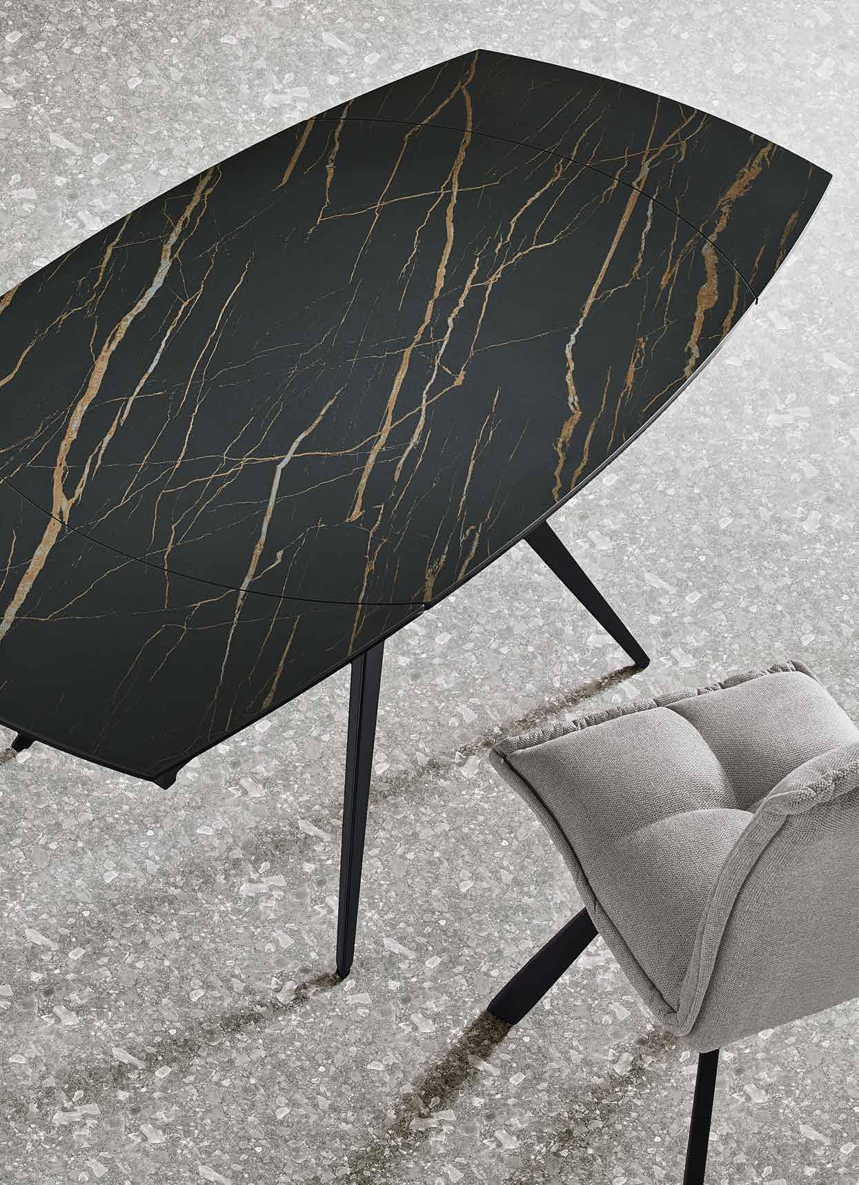 Tavolo KARL 210 x 110 cm in ceramica effetto marmo Sahara Noir lucido, base in metallo nero - Sedie MEGGIE / KARL table 210 x 110 cm with marble effect