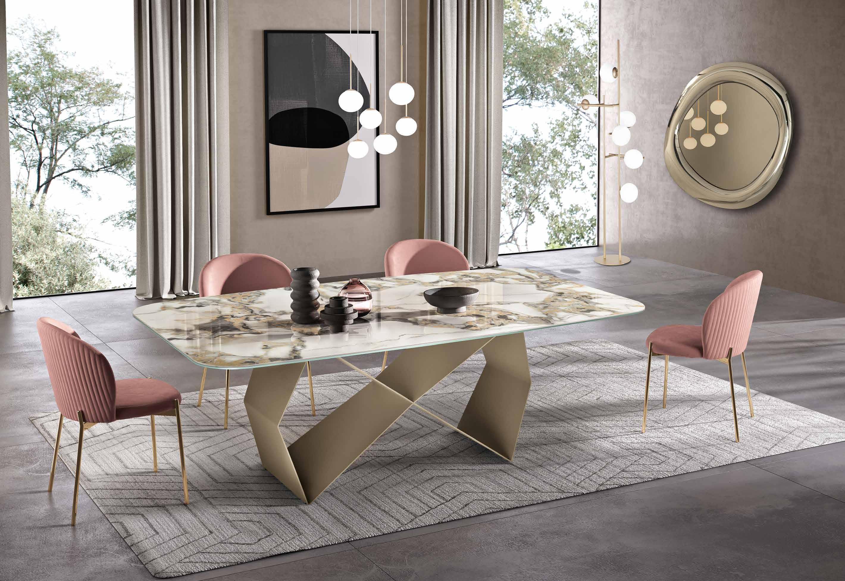 Tavolo KARL 210 x 110 cm in ceramica effetto marmo symphonie oro lucido, base in metallo perla beige - Sedia MEGAN / KARL table 210 x 110 cm with marble effect glossy symphonie oro ceramic, pearl beige metal base - MEGAN chair