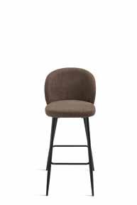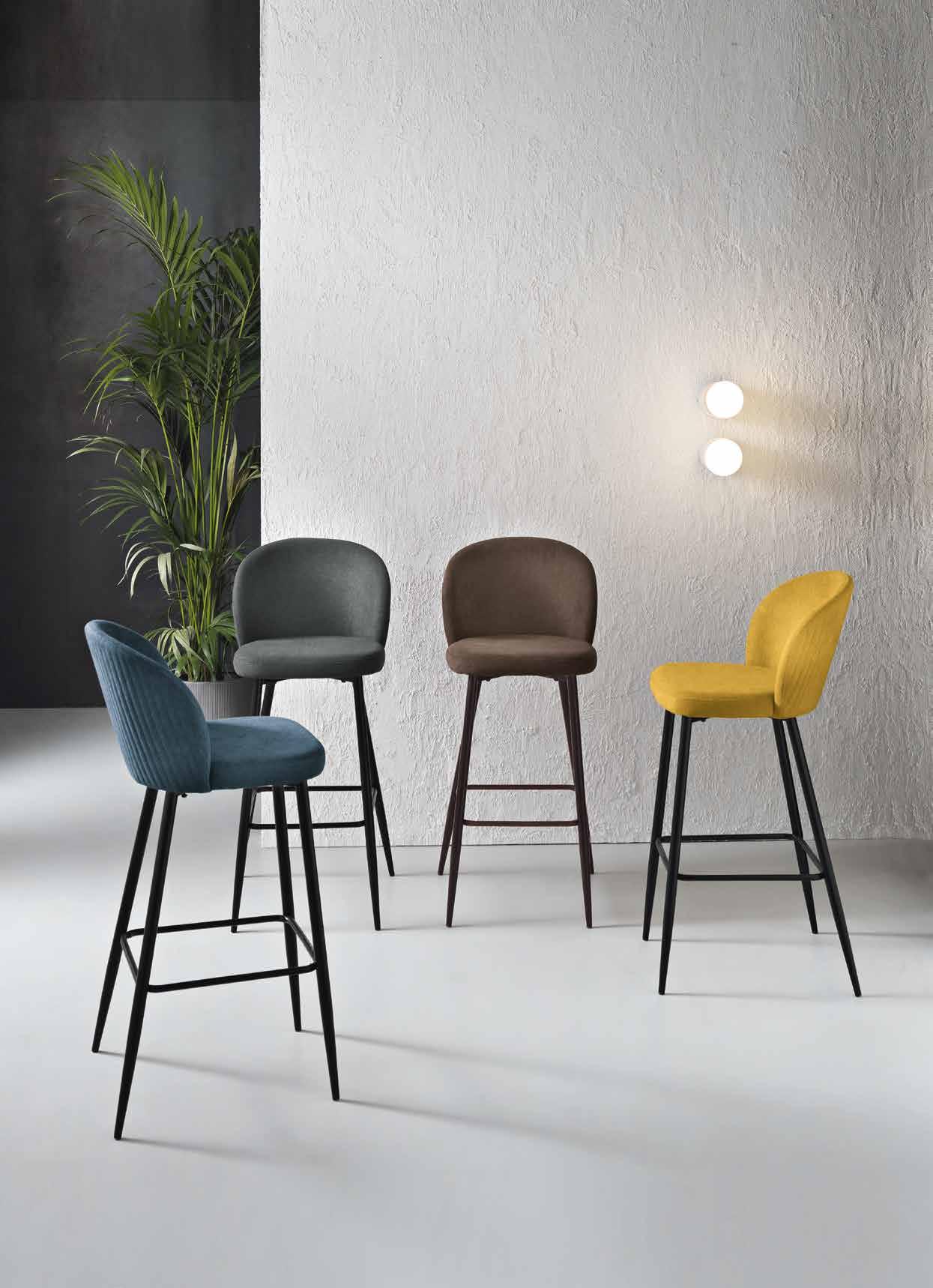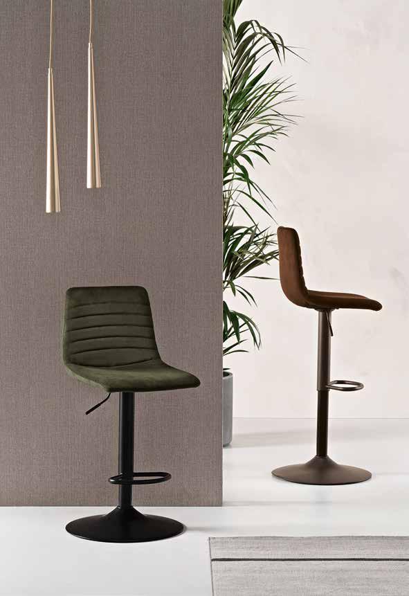 Sgabello con struttura in metallo verniciato e seduta in tessuto imbottito.
