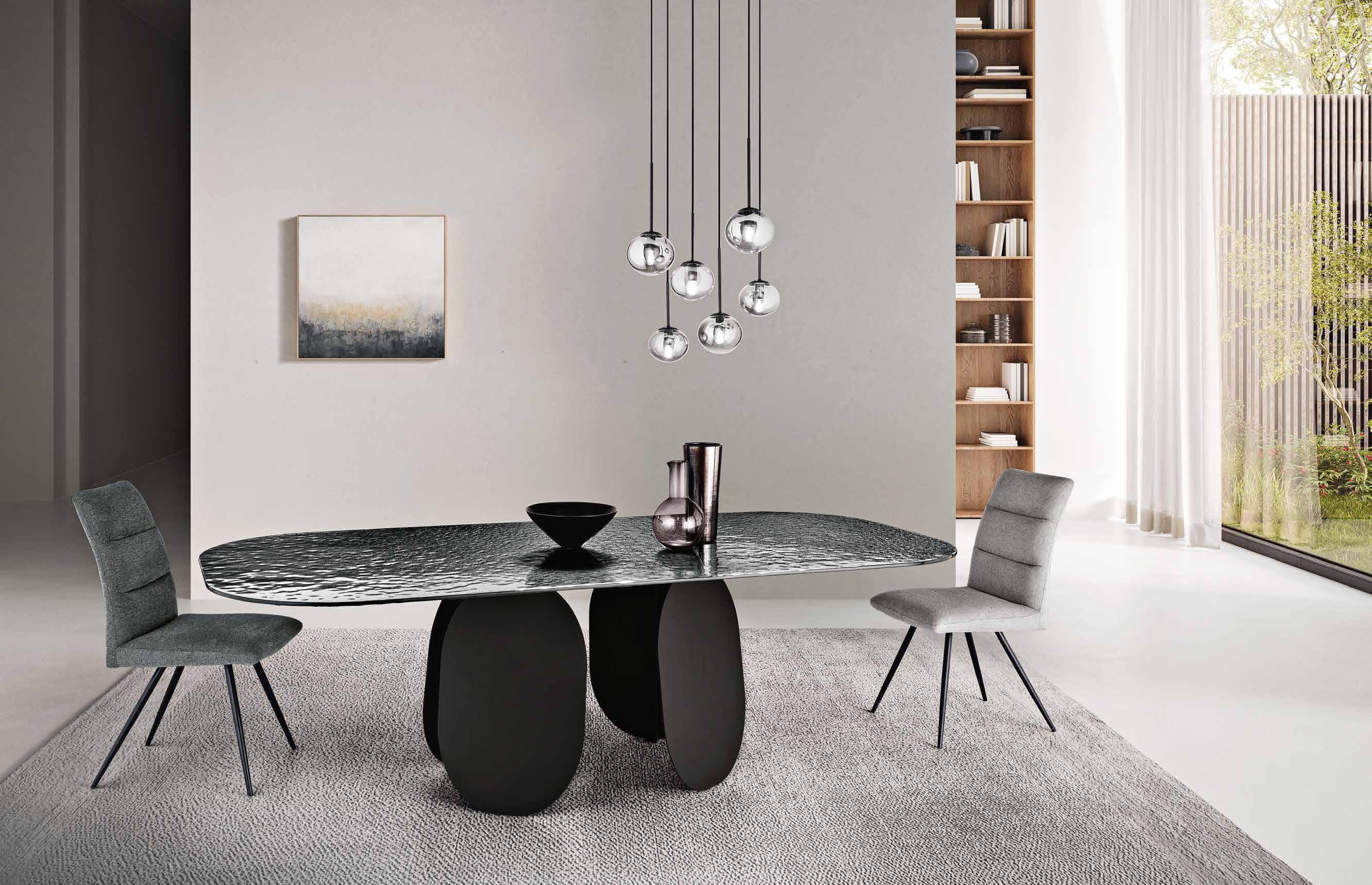 Tavolo KARL 210 x 110 cm con vetro martellato fumè retroargentato, base in metallo nero - Sedia CELIA / KARL table 210 x 110 cm with smoky painted