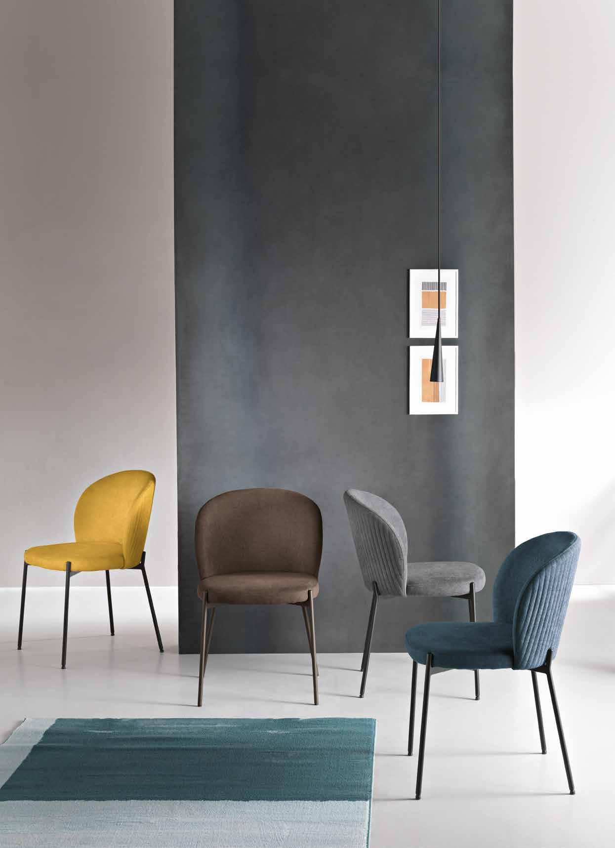 Sedia imbottita in tessuto bouclé écru. Disponibile in diversi colori. Chair upholstered in bouclé écru. Available in different colours.