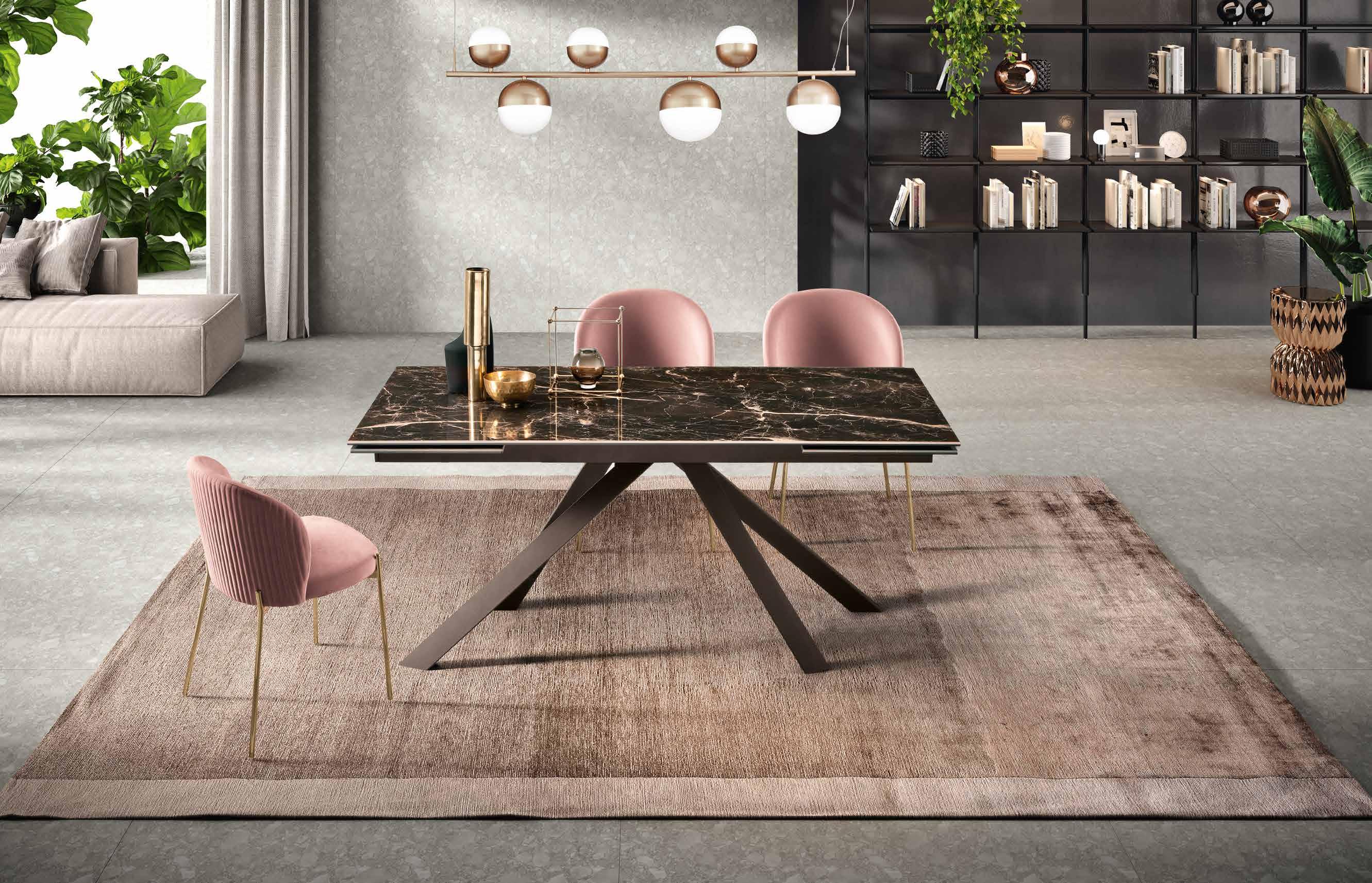 Tavolo allungabile con due allunghe laterali da 30 cm; base in metallo verniciato e piano in grès porcellanato effetto marmo. Disponibile in diversi colori.