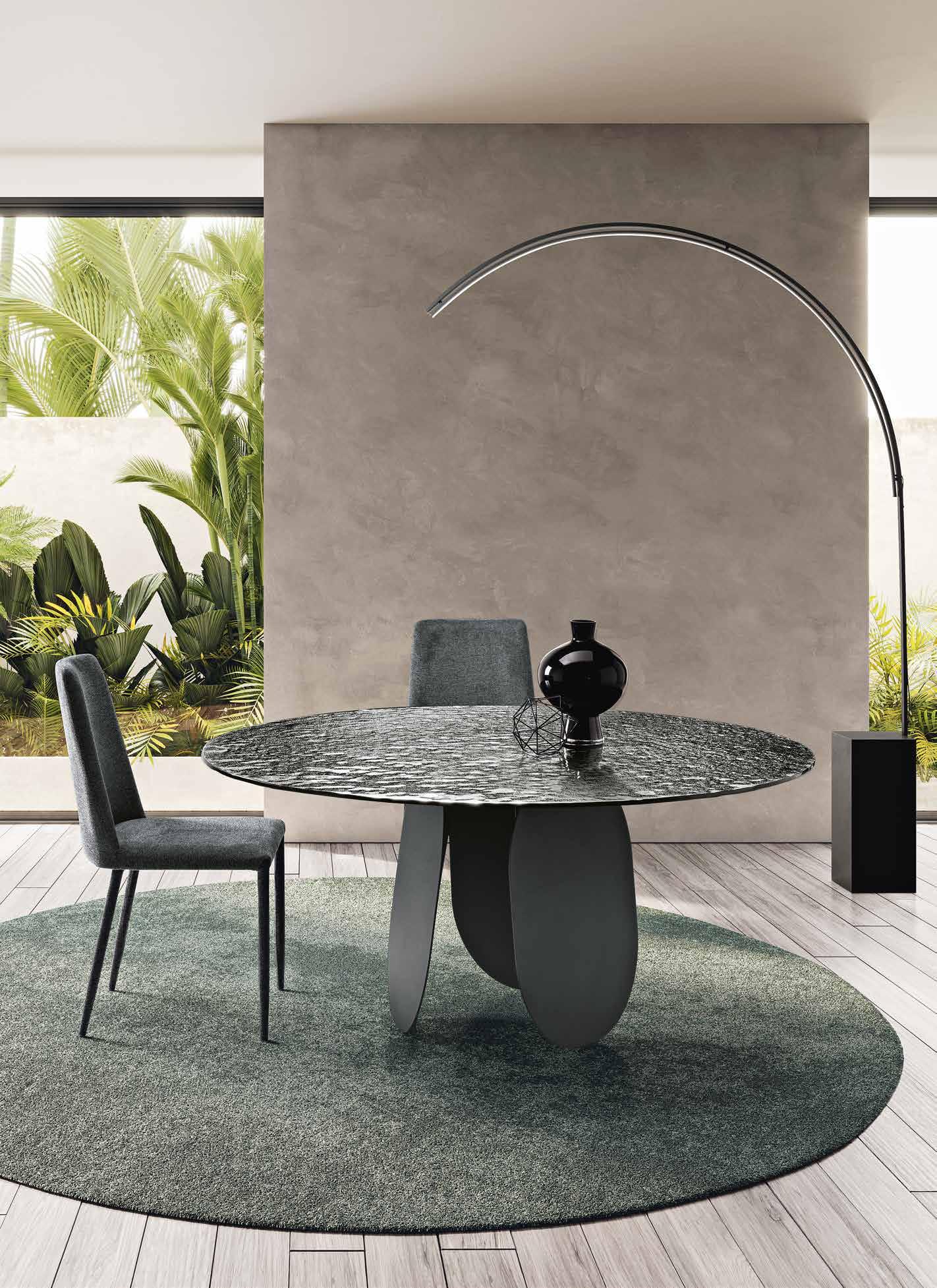 Tavolo MAYA Ø 140 cm vetro martellato fumè retroargentato, base in metallo nero - Sedia ETTORE MAYA Ø 140 cm table with smoky painted hammered glass, black metal base - ETTORE chair