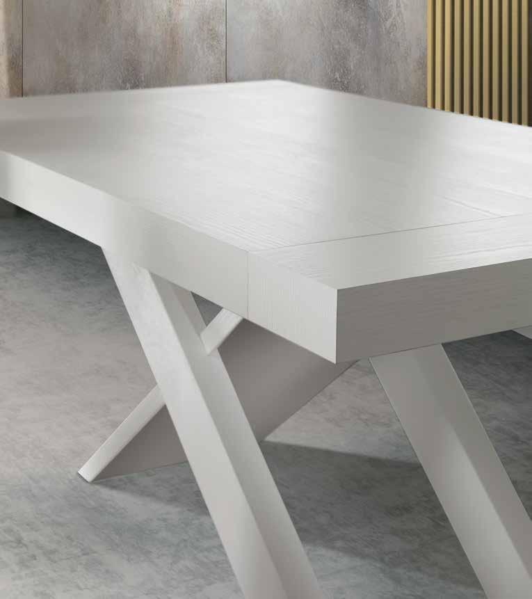 Extendable table with frame, top and extensions in wood effect laminate. Two side extensions of 50 cm. The arrangment of the legs cam be modified to obtain different configurations. Available in different colours.