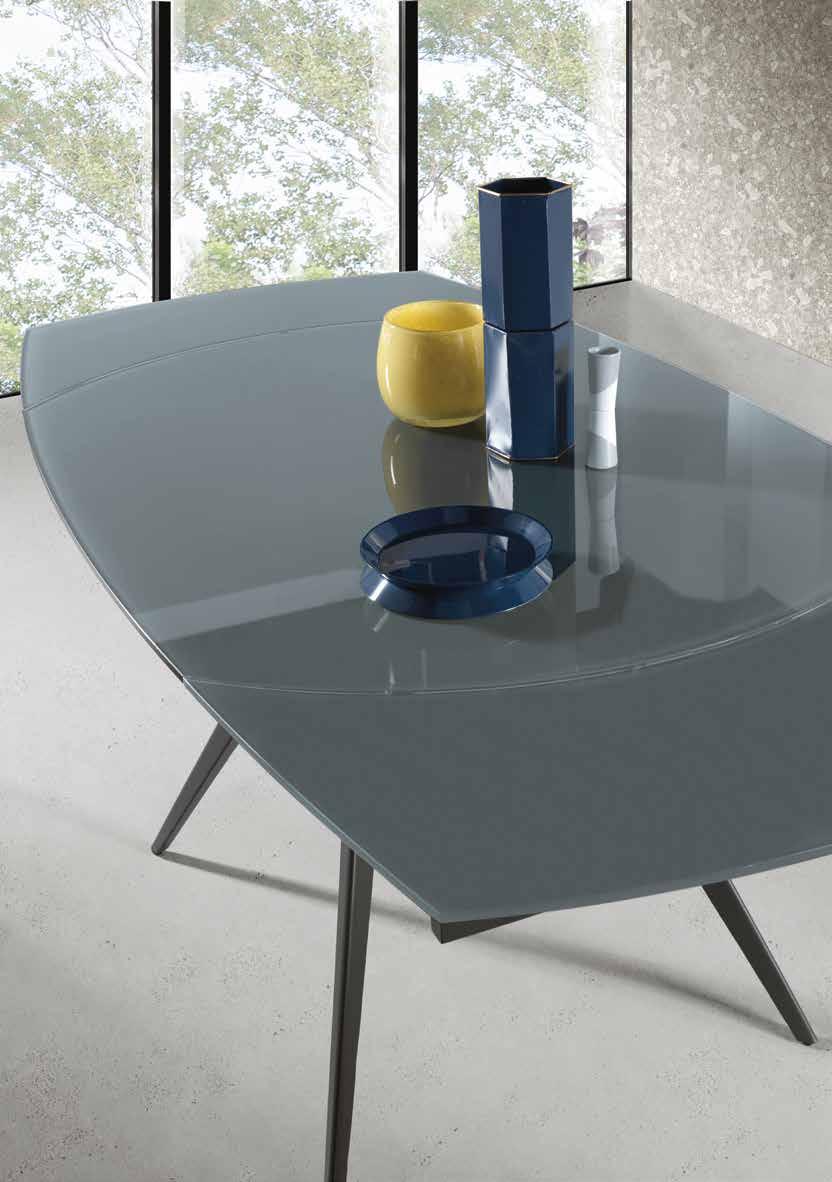 Tavolo con base in metallo verniciato. Piano in due versioni: vetro martellato o ceramica effetto marmo stratificata su vetro.