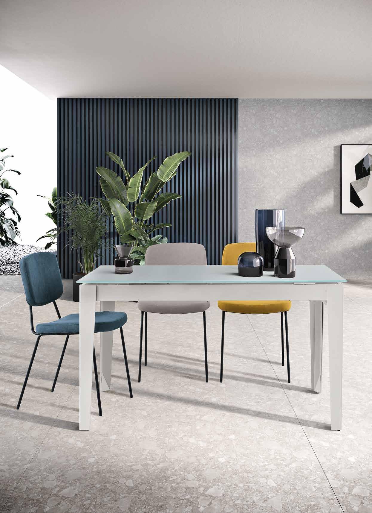 Tavolo allungabile con piano in vetro e quattro allunghe da 60 cm in nobilitato; base in metallo verniciato. Disponibile in diversi colori.