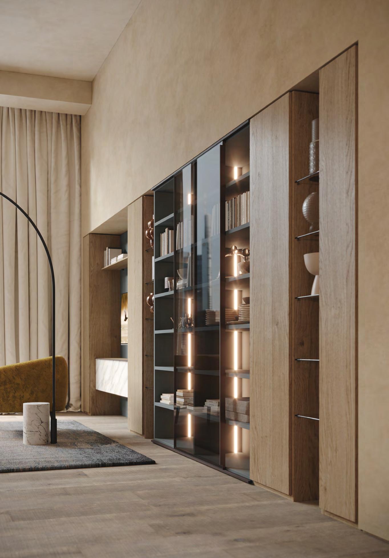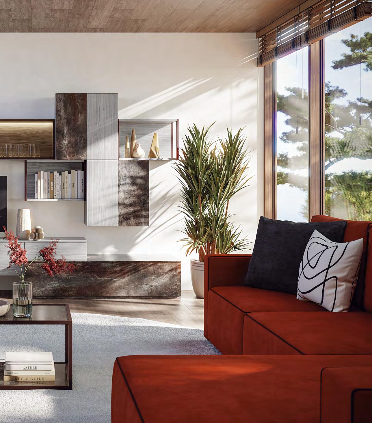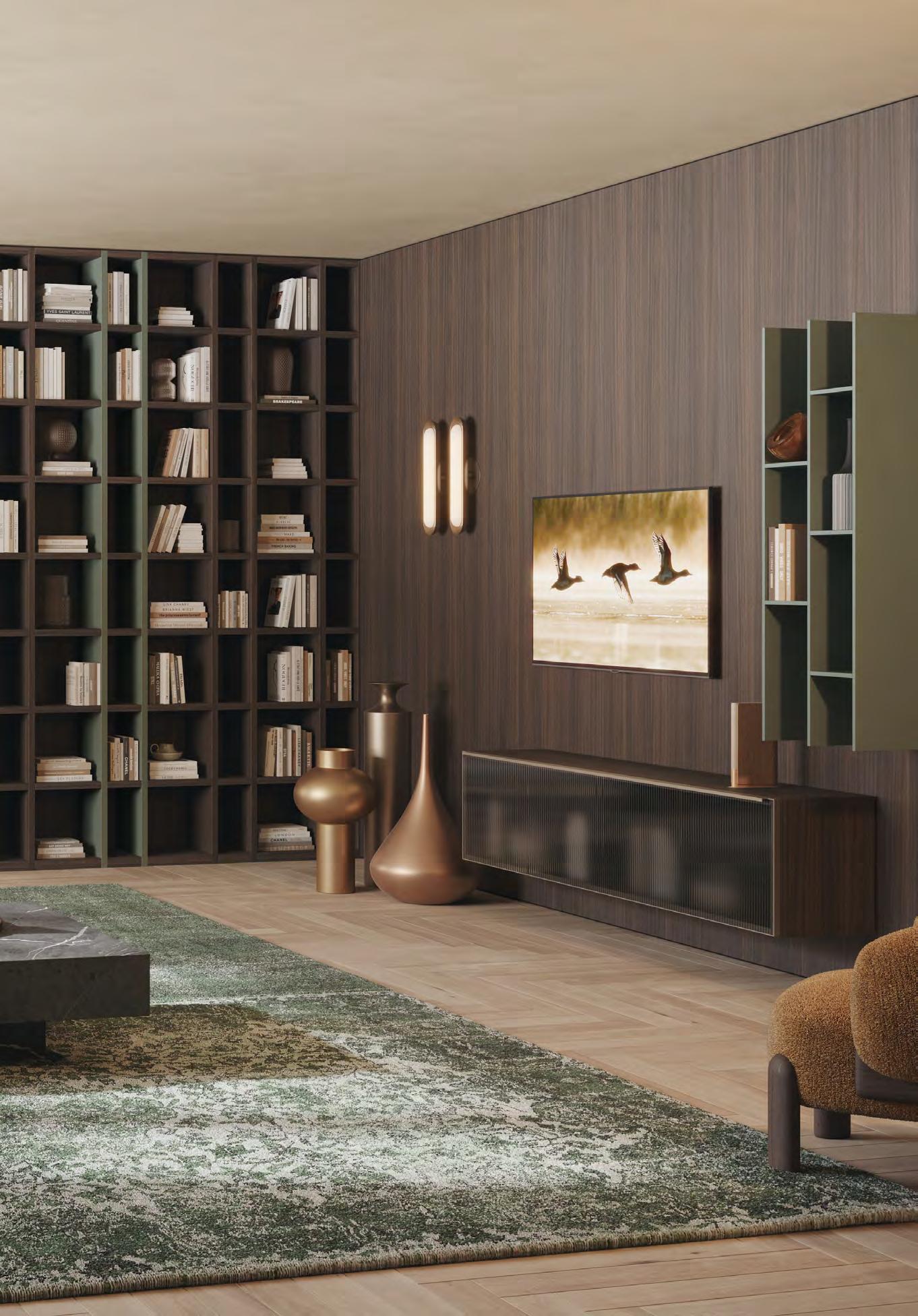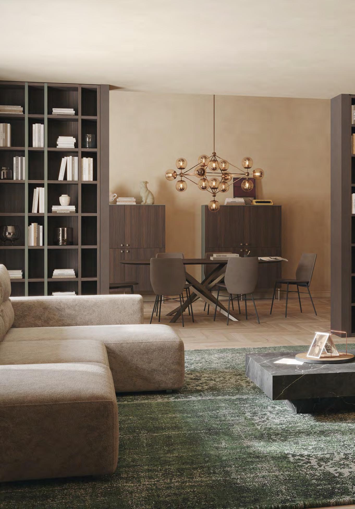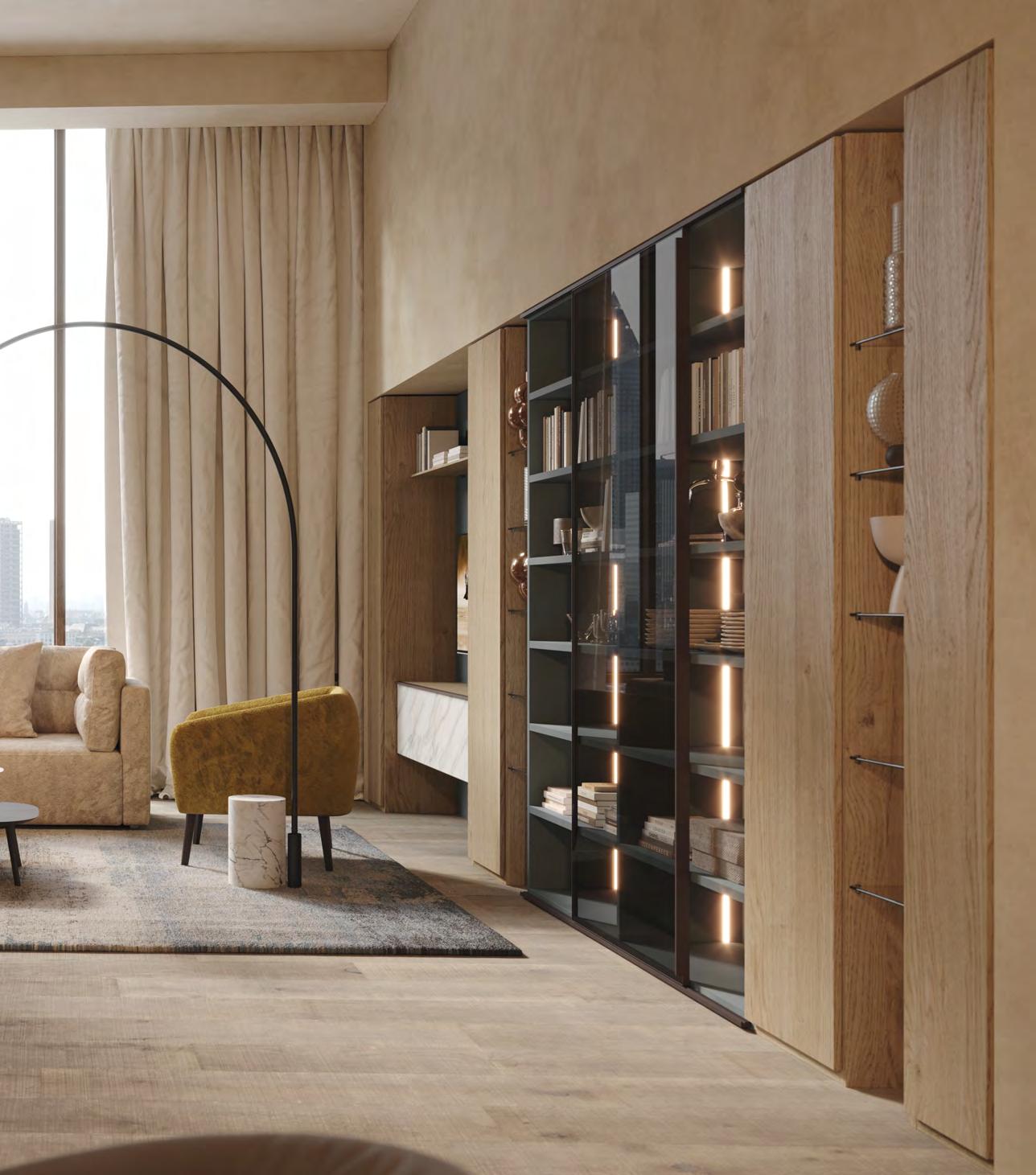 Ma il Living 2024 si impreziosisce soprattutto di finiture e colori: una palette di laccati più ispirata alla natura, che evoca sensazioni di tranquillità e pace; diverse nuove finiture vetro a scelta tra gli eleganti Canova e Sahara Noir effetto marmo, il Bronzo satinato dall’aspetto caldo e vellutato ed il cannettato Flutes Grigio scuro; tra i nuovi nobilitati introdotti spiccano invece Michelangelo e Marquinia che richiamano l’eleganza del marmo ed il Corten effetto ruggine; infine il nuovo color Rame introdotto per tutti gli accessori metallici che, affiancandosi ai preesistenti Brown e Champagne, aggiunge una nota di calore alle trame dei nostri vissuti.