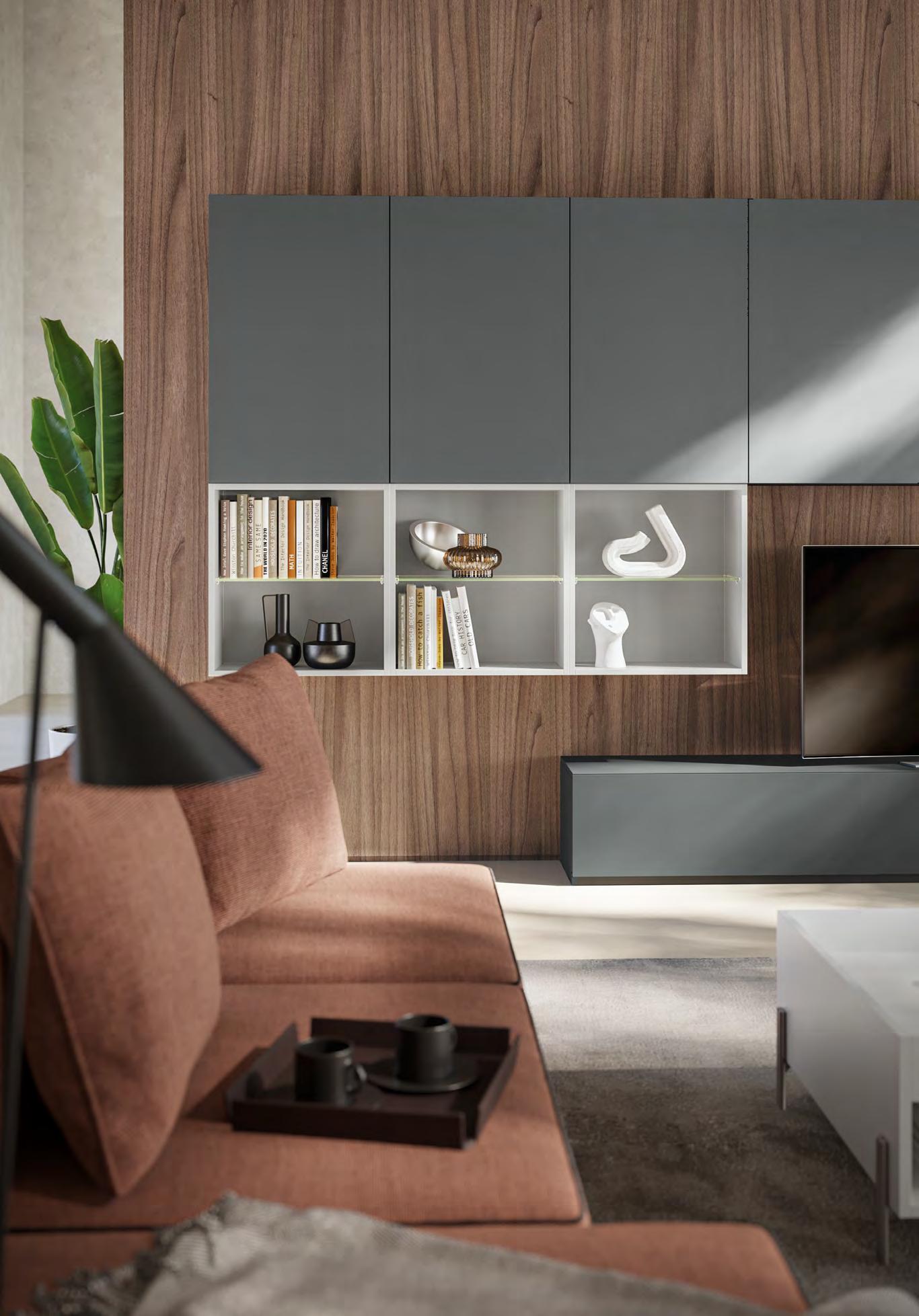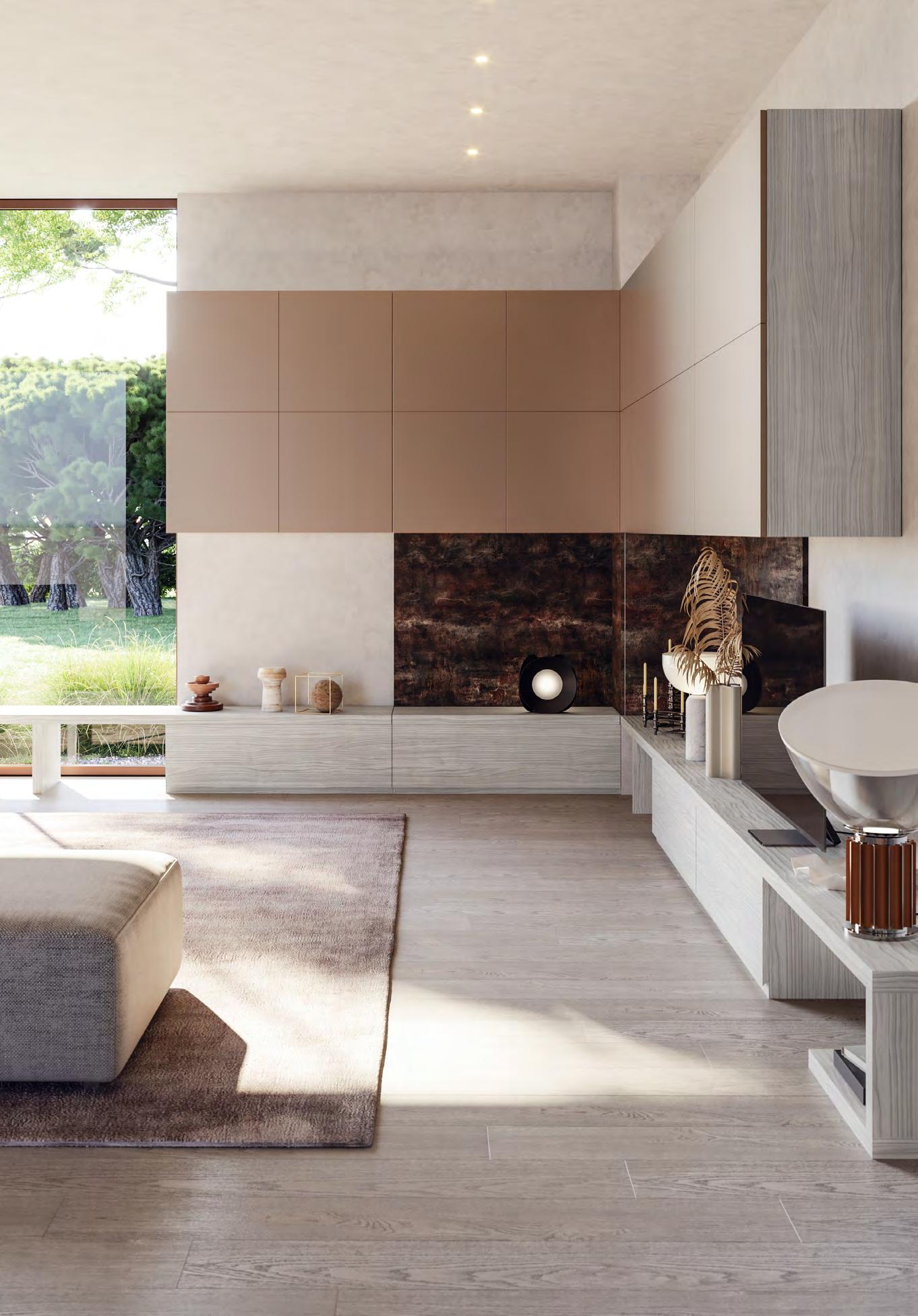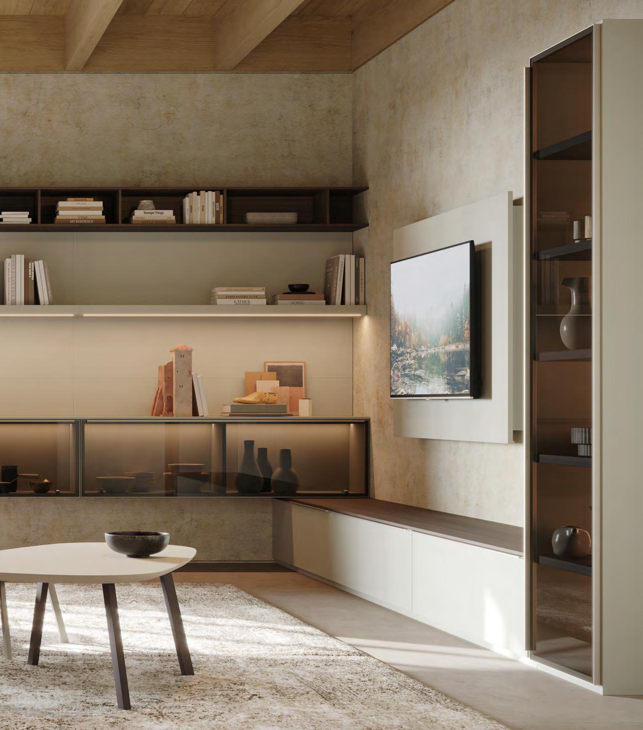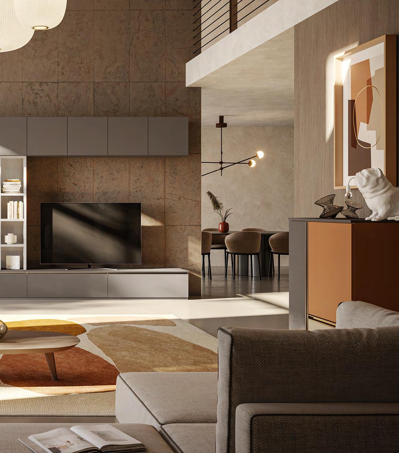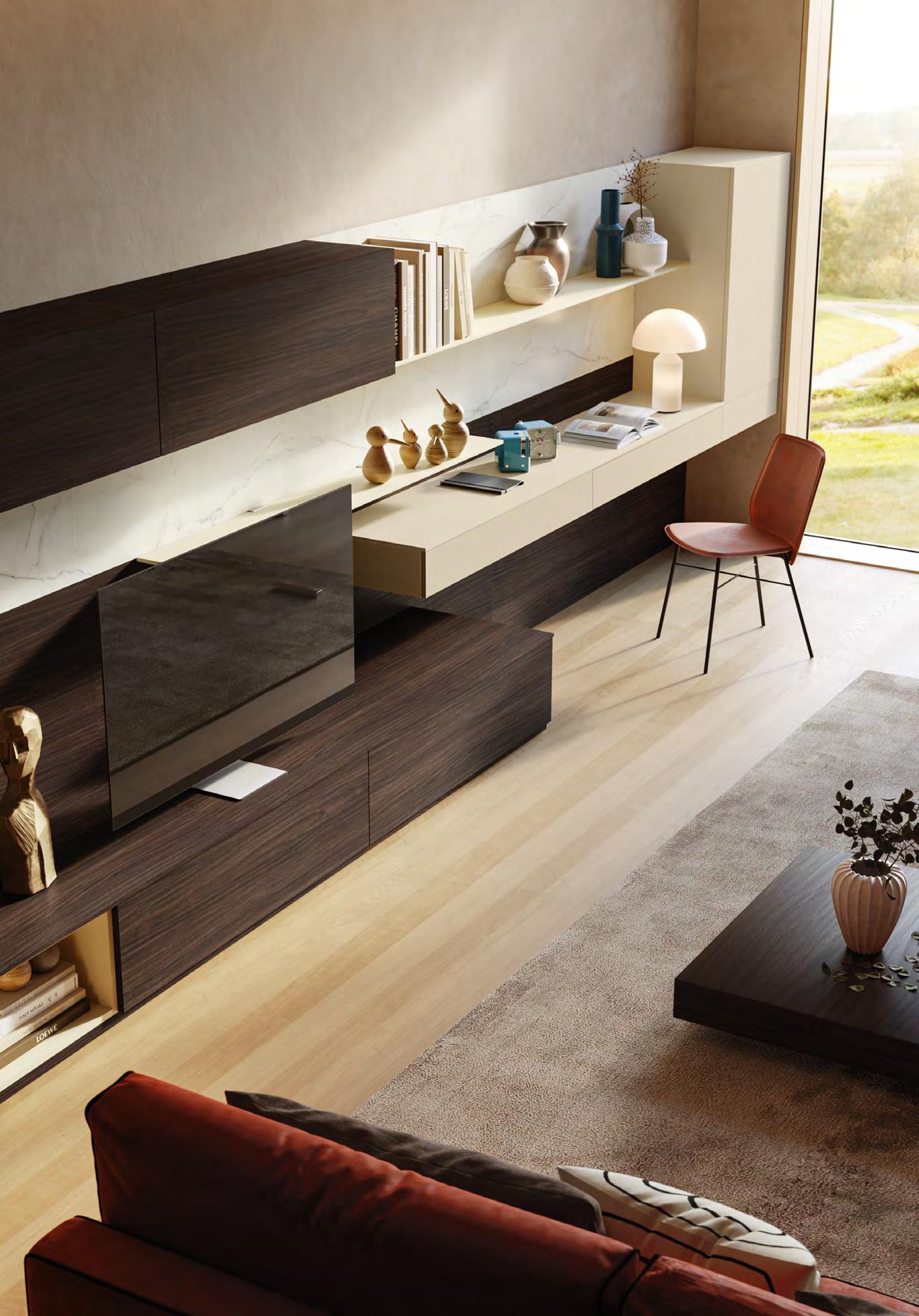 Ma il Living 2024 si impreziosisce soprattutto di finiture e colori: una palette di laccati più ispirata alla natura, che evoca sensazioni di tranquillità e pace; diverse nuove finiture vetro a scelta tra gli eleganti Canova e Sahara Noir effetto marmo, il Bronzo satinato dall’aspetto caldo e vellutato ed il cannettato Flutes Grigio scuro; tra i nuovi nobilitati introdotti spiccano invece Michelangelo e Marquinia che richiamano l’eleganza del marmo ed il Corten effetto ruggine; infine il nuovo color Rame introdotto per tutti gli accessori metallici che, affiancandosi ai preesistenti Brown e Champagne, aggiunge una nota di calore alle trame dei nostri vissuti.