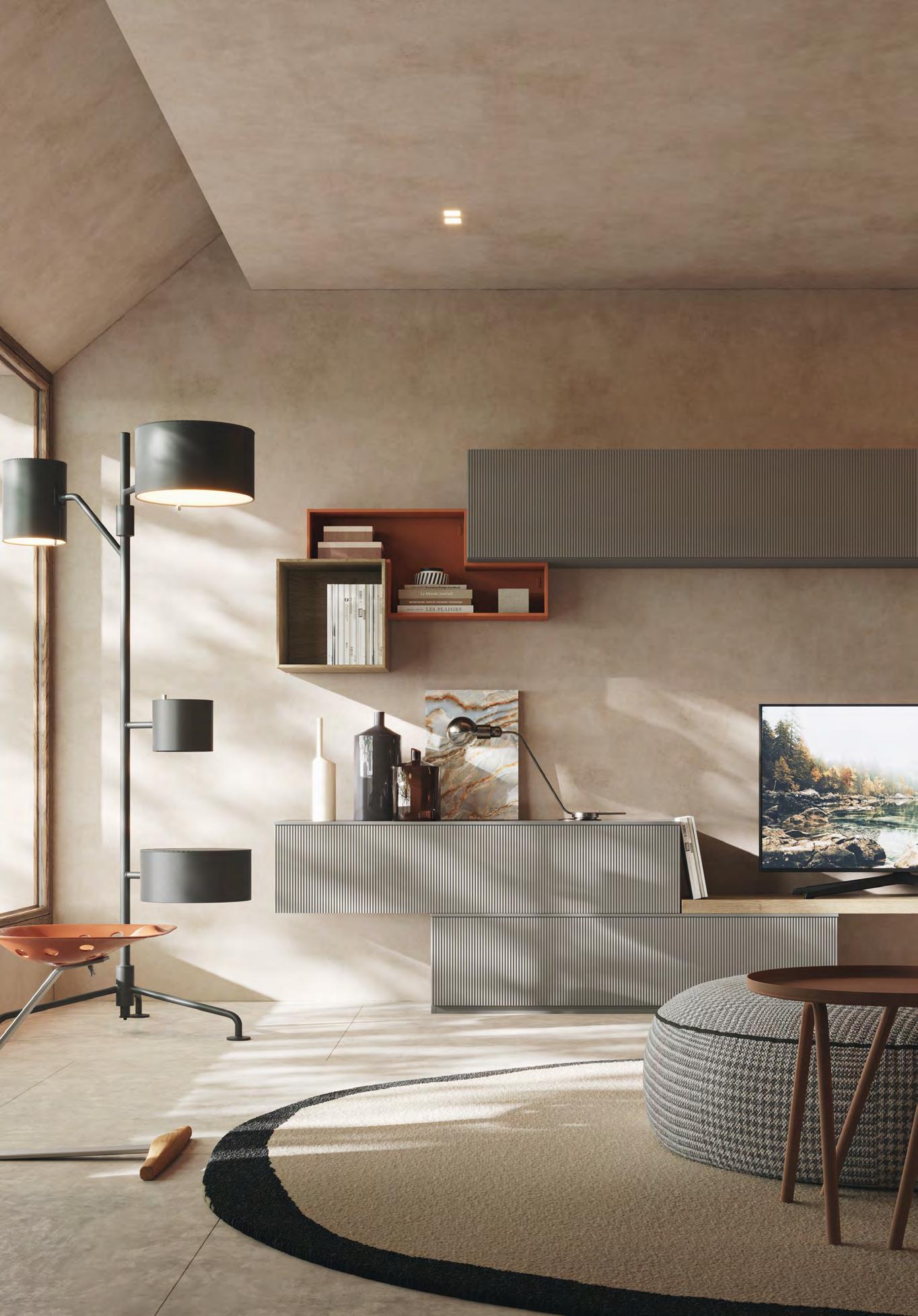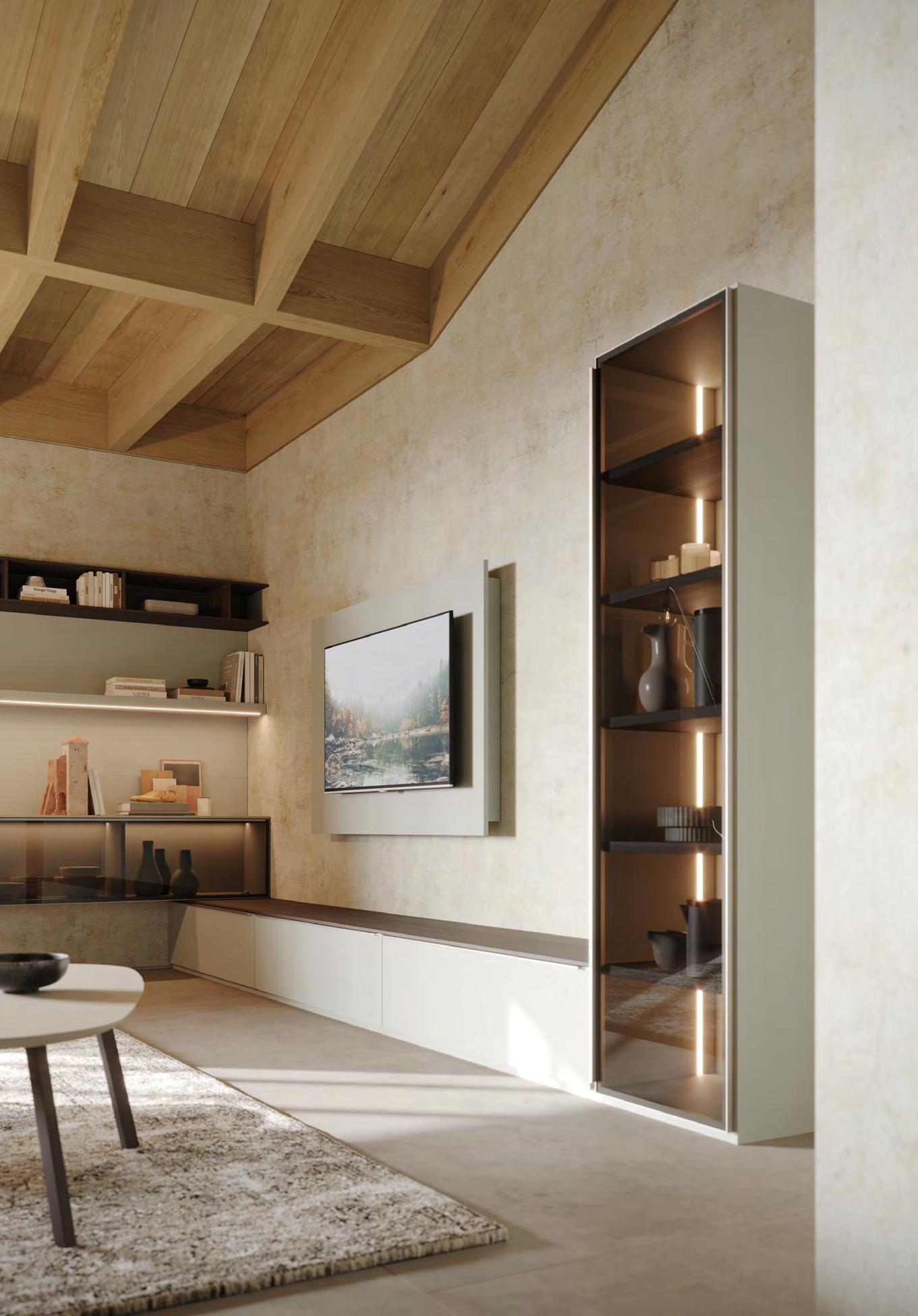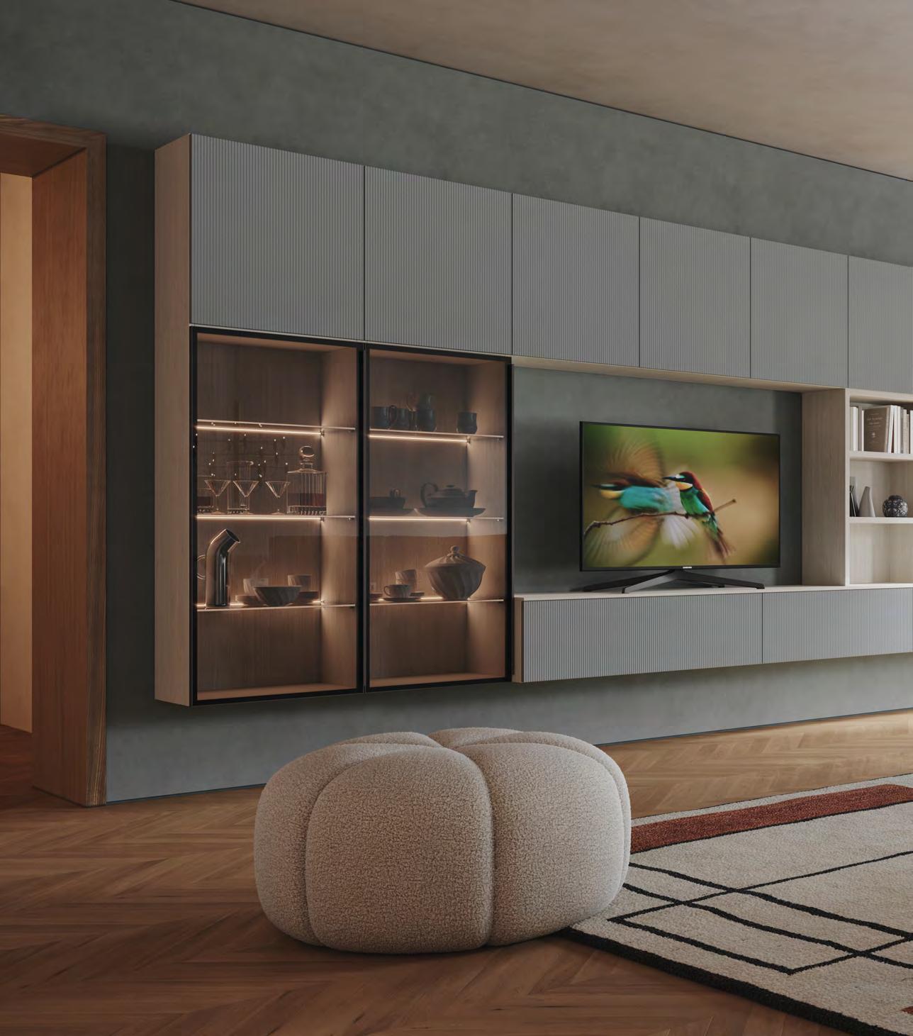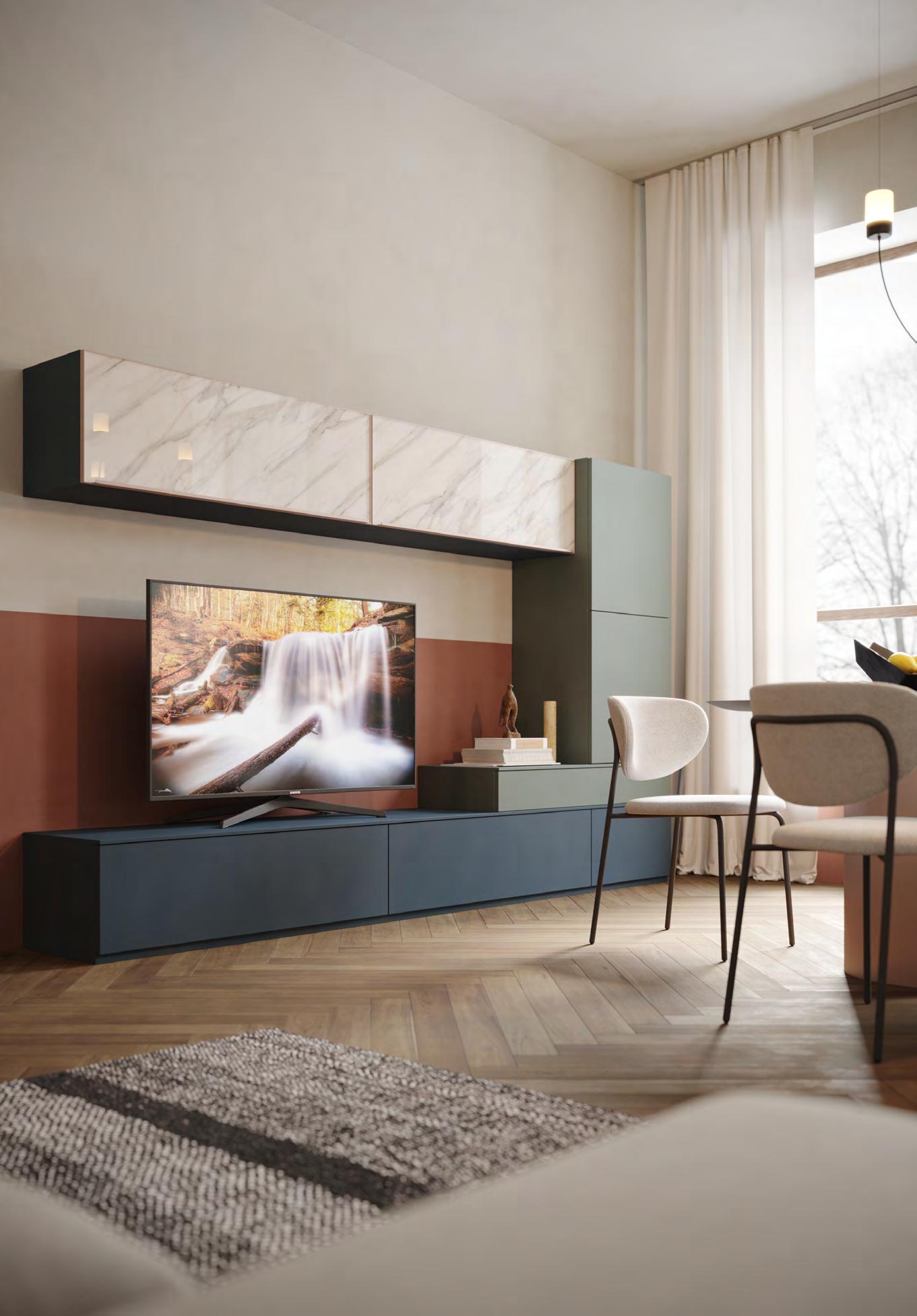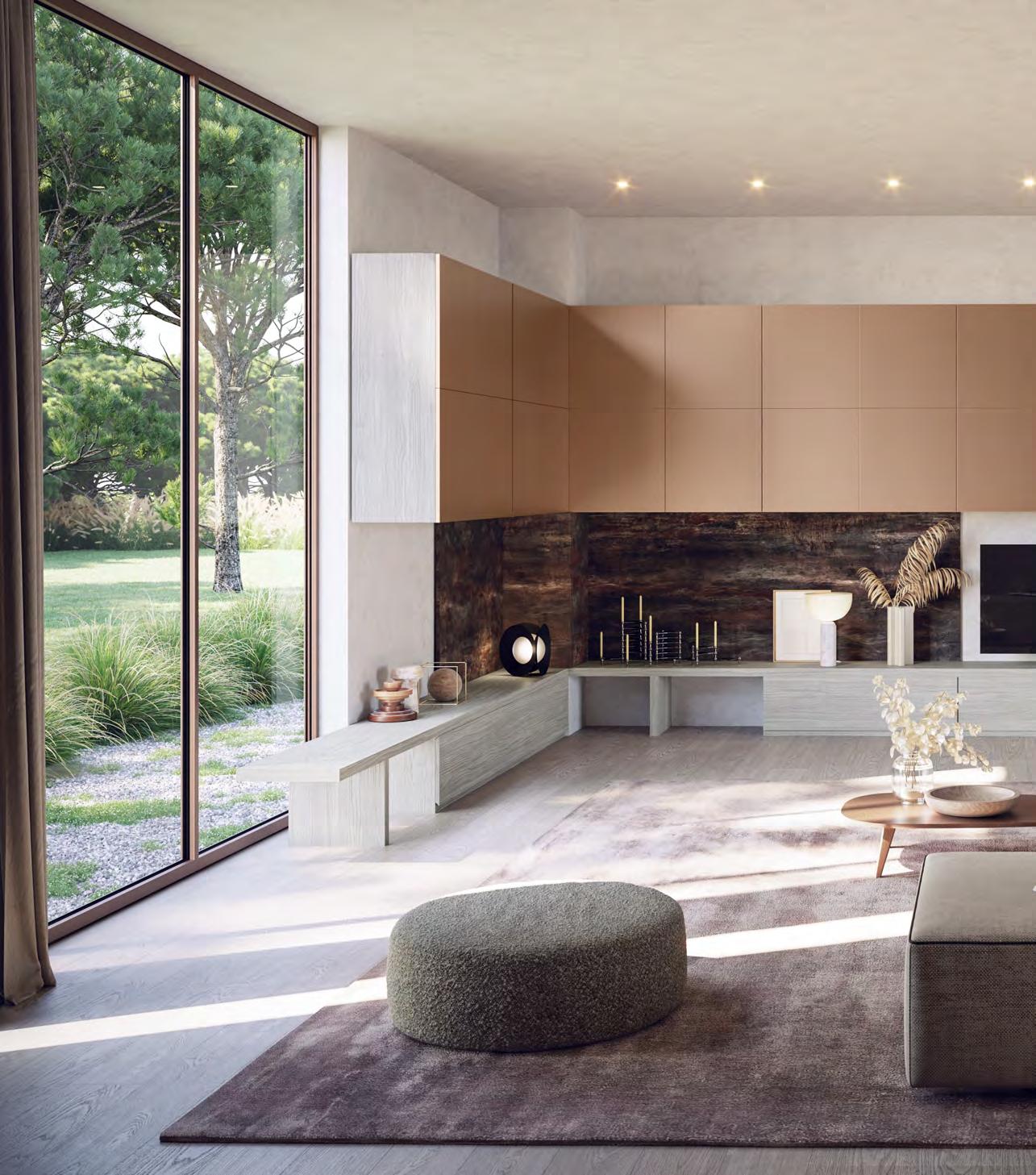 Ma il Living 2024 si impreziosisce soprattutto di finiture e colori: una palette di laccati più ispirata alla natura, che evoca sensazioni di tranquillità e pace; diverse nuove finiture vetro a scelta tra gli eleganti Canova e Sahara Noir effetto marmo, il Bronzo satinato dall’aspetto caldo e vellutato ed il cannettato Flutes Grigio scuro; tra i nuovi nobilitati introdotti spiccano invece Michelangelo e Marquinia che richiamano l’eleganza del marmo ed il Corten effetto ruggine; infine il nuovo color Rame introdotto per tutti gli accessori metallici che, affiancandosi ai preesistenti Brown e Champagne, aggiunge una nota di calore alle trame dei nostri vissuti.
