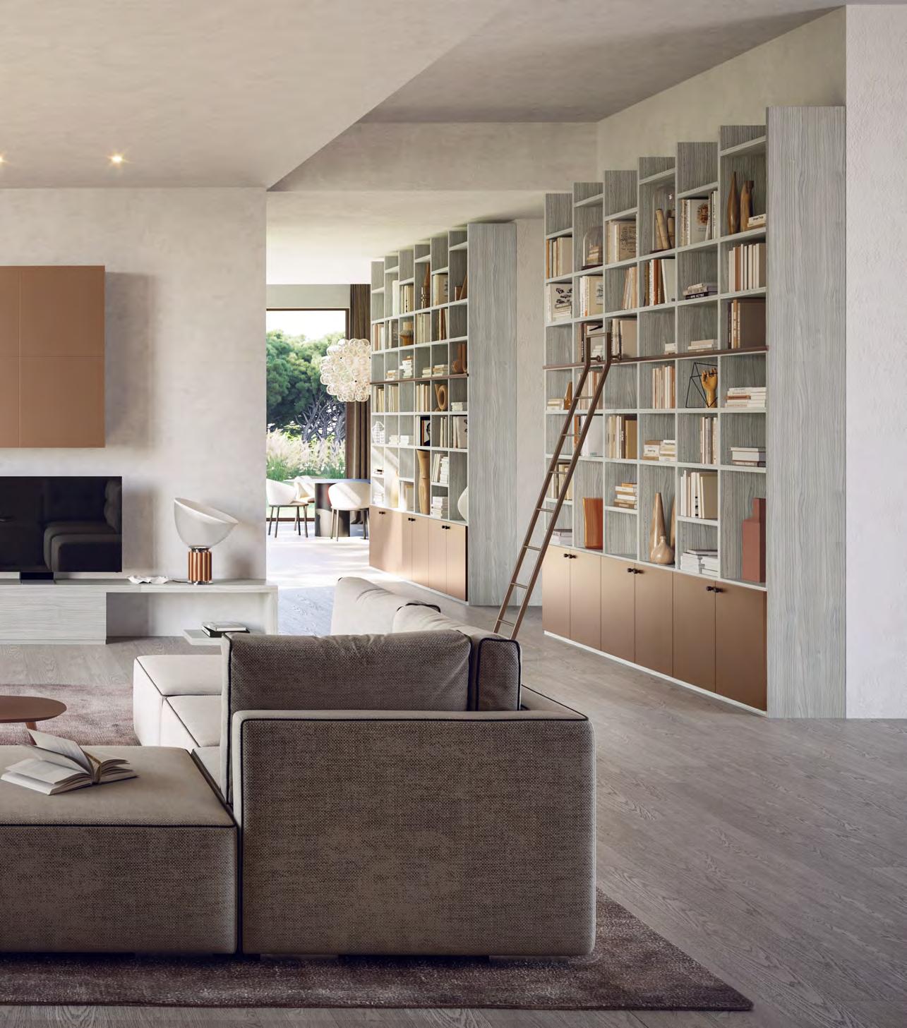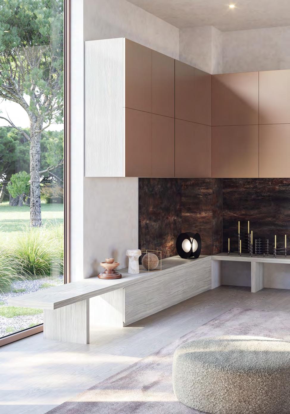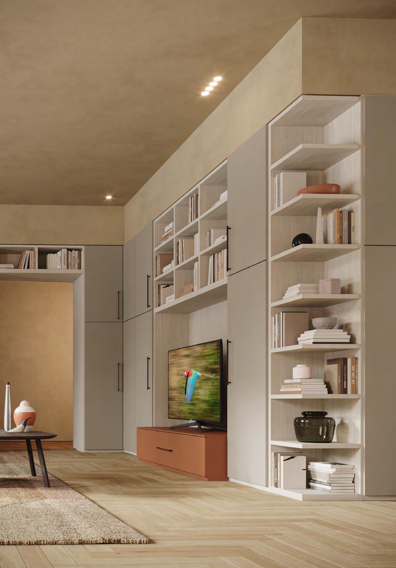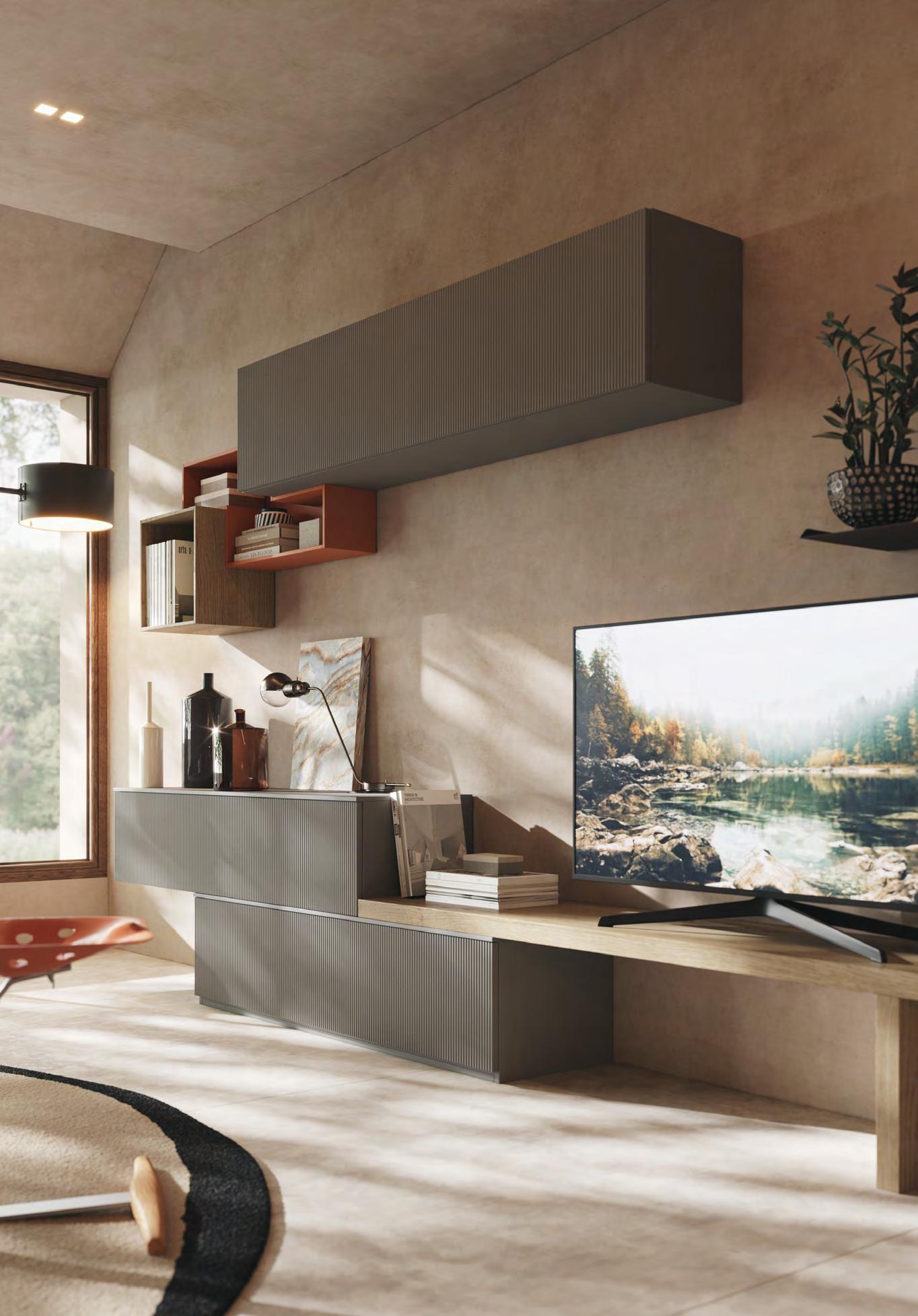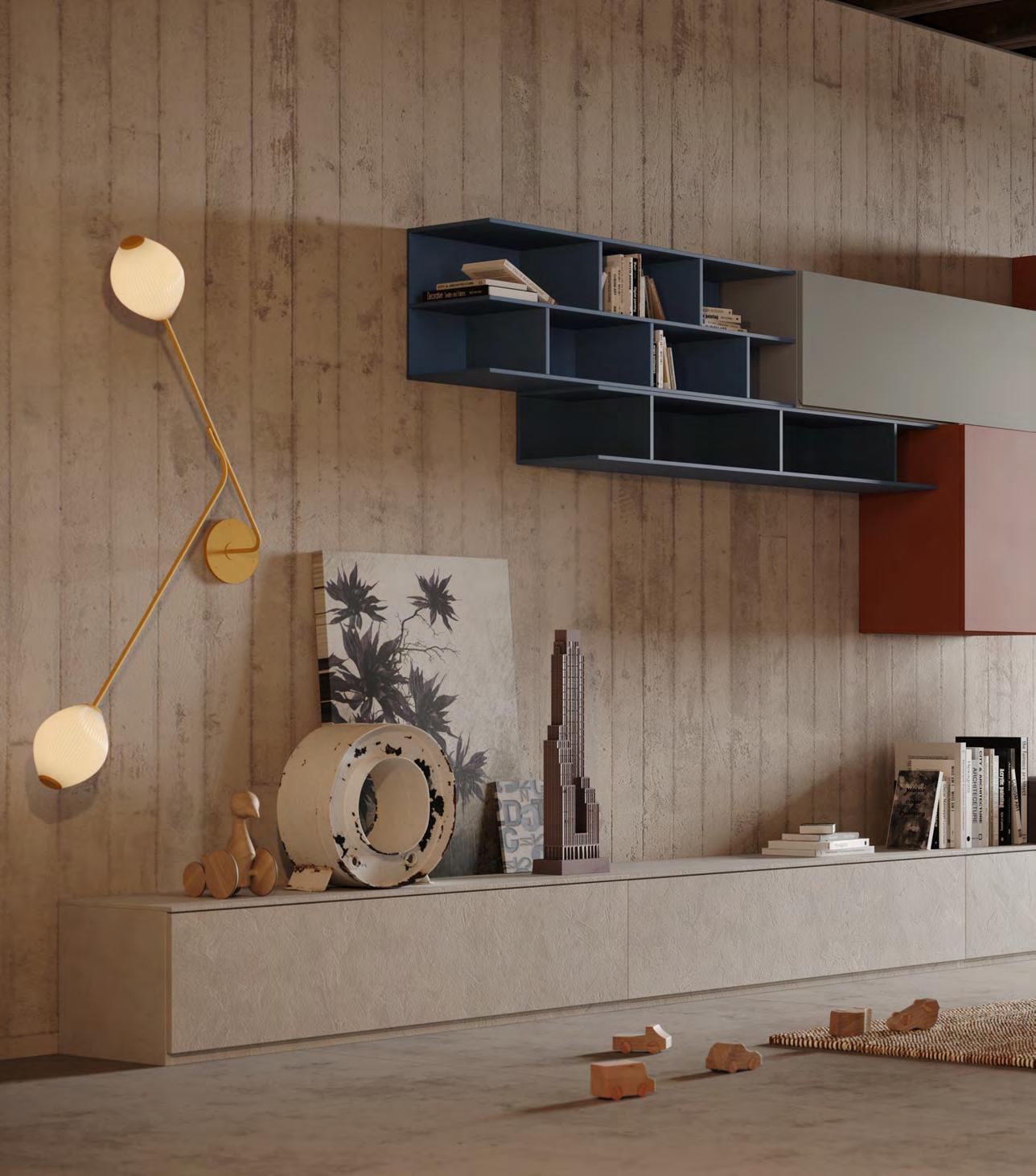 Ma il Living 2024 si impreziosisce soprattutto di finiture e colori: una palette di laccati più ispirata alla natura, che evoca sensazioni di tranquillità e pace; diverse nuove finiture vetro a scelta tra gli eleganti Canova e Sahara Noir effetto marmo, il Bronzo satinato dall’aspetto caldo e vellutato ed il cannettato Flutes Grigio scuro; tra i nuovi nobilitati introdotti spiccano invece Michelangelo e Marquinia che richiamano l’eleganza del marmo ed il Corten effetto ruggine; infine il nuovo color Rame introdotto per tutti gli accessori metallici che, affiancandosi ai preesistenti Brown e Champagne, aggiunge una nota di calore alle trame dei nostri vissuti.