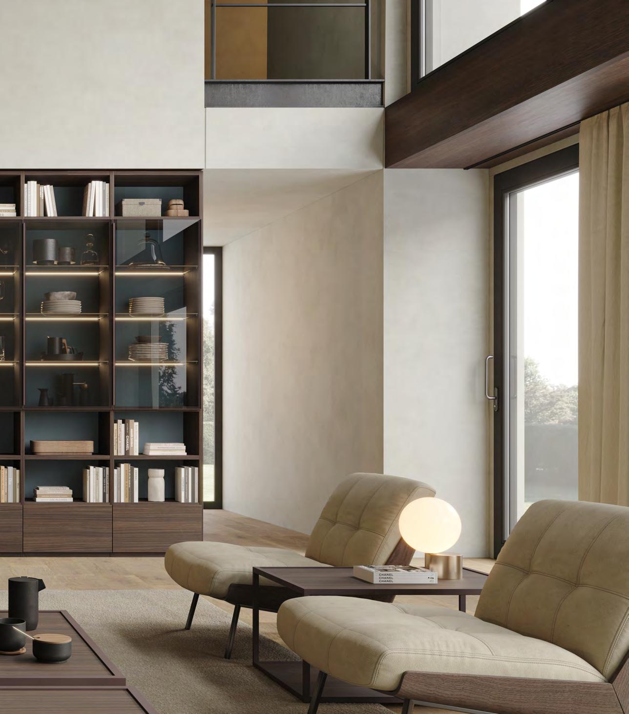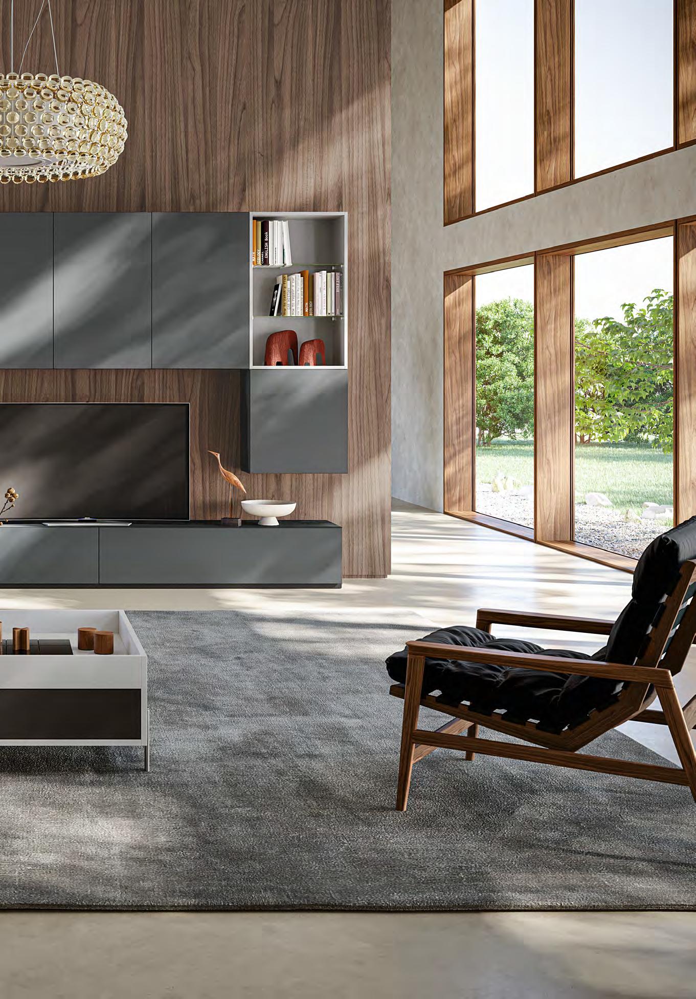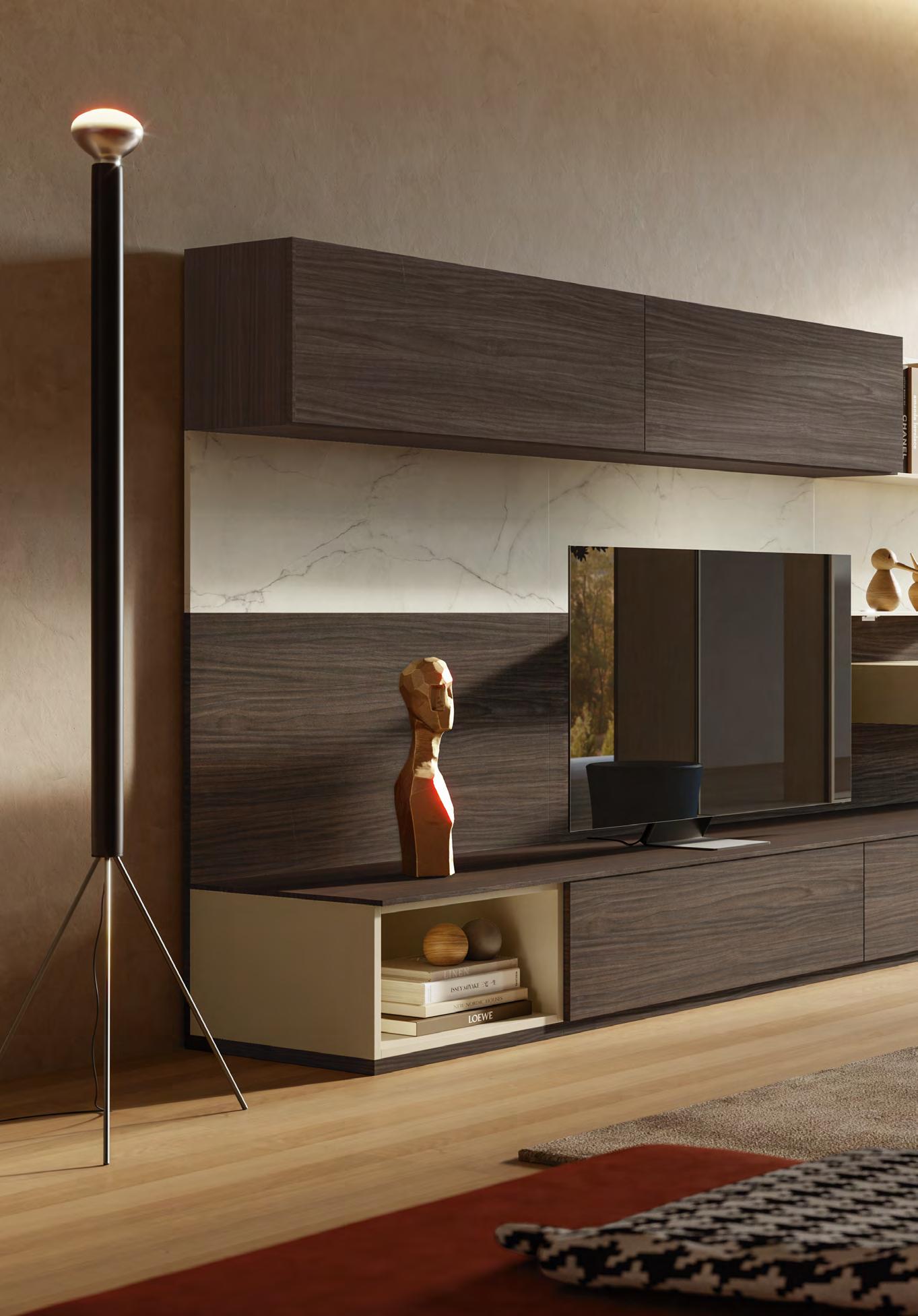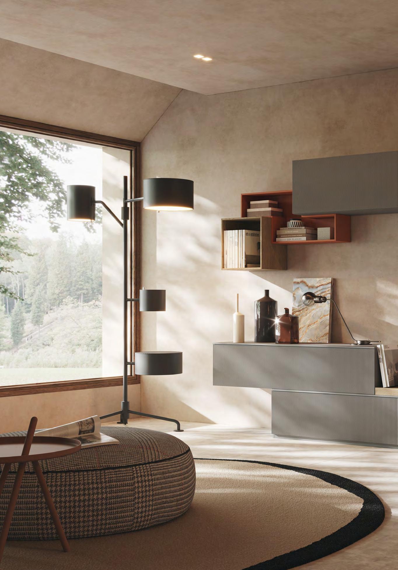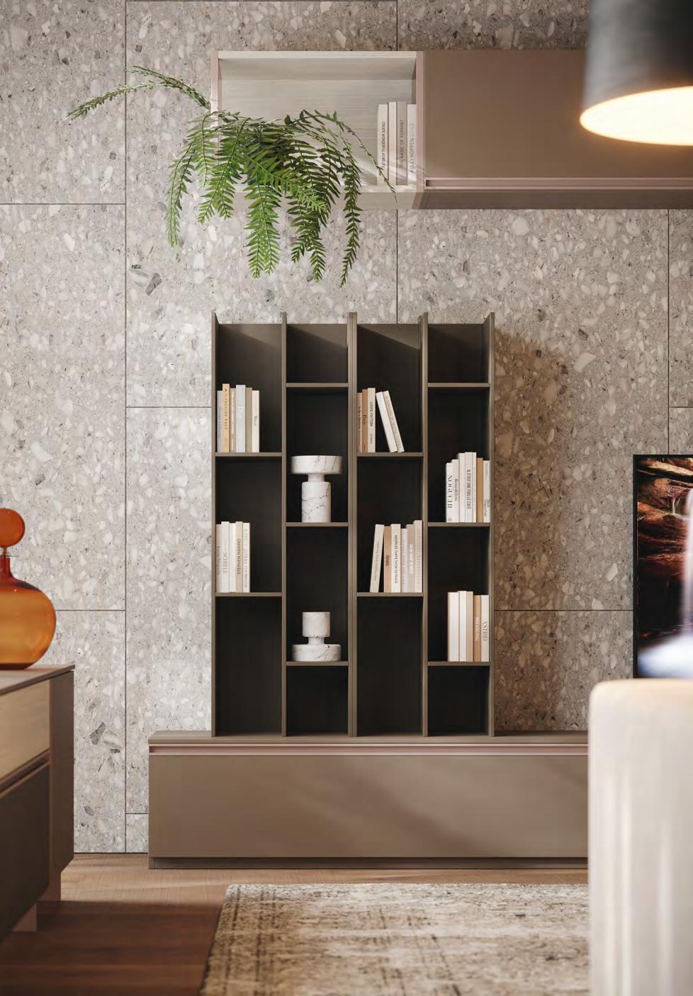 Ma il Living 2024 si impreziosisce soprattutto di finiture e colori: una palette di laccati più ispirata alla natura, che evoca sensazioni di tranquillità e pace; diverse nuove finiture vetro a scelta tra gli eleganti Canova e Sahara Noir effetto marmo, il Bronzo satinato dall’aspetto caldo e vellutato ed il cannettato Flutes Grigio scuro; tra i nuovi nobilitati introdotti spiccano invece Michelangelo e Marquinia che richiamano l’eleganza del marmo ed il Corten effetto ruggine; infine il nuovo color Rame introdotto per tutti gli accessori metallici che, affiancandosi ai preesistenti Brown e Champagne, aggiunge una nota di calore alle trame dei nostri vissuti.