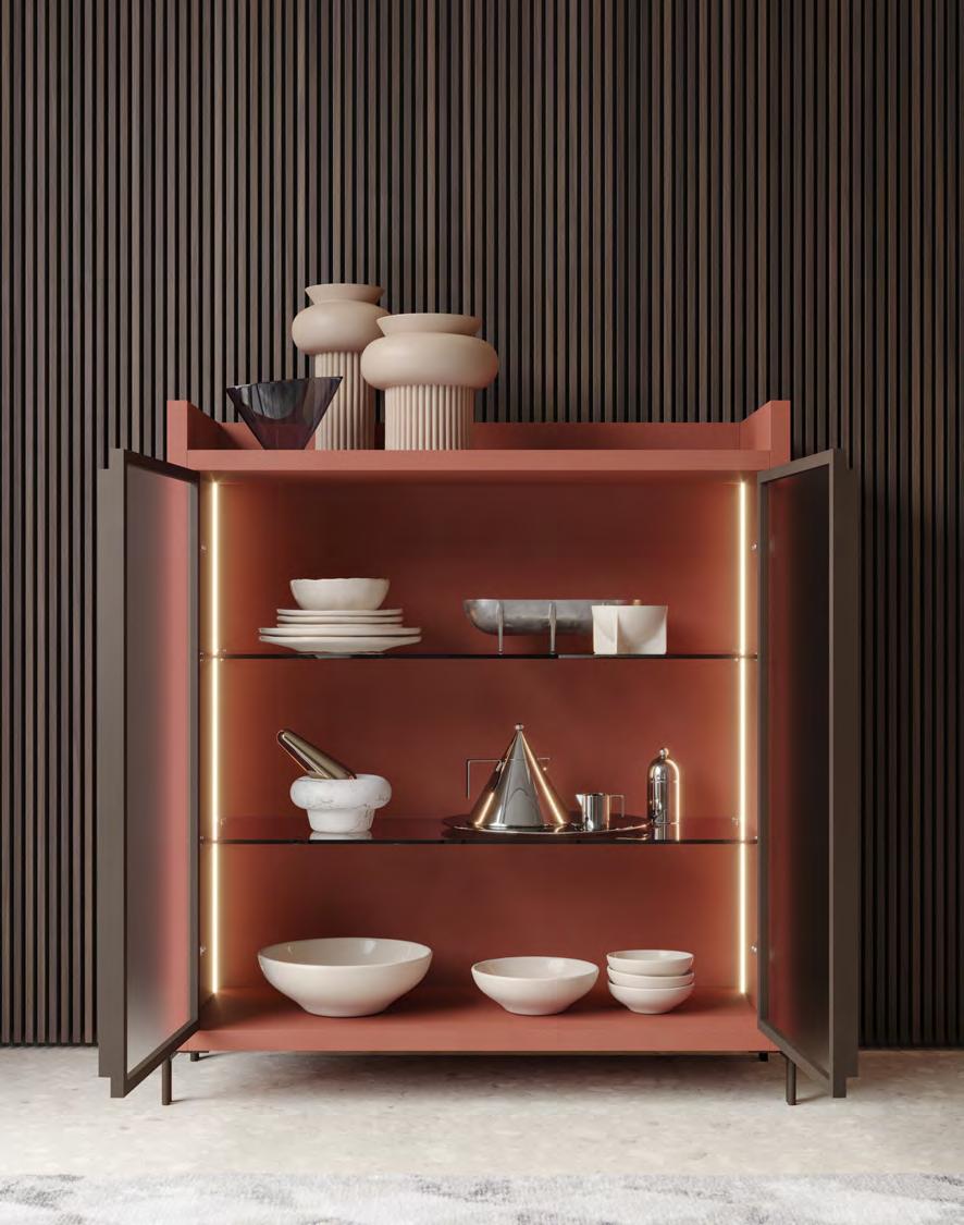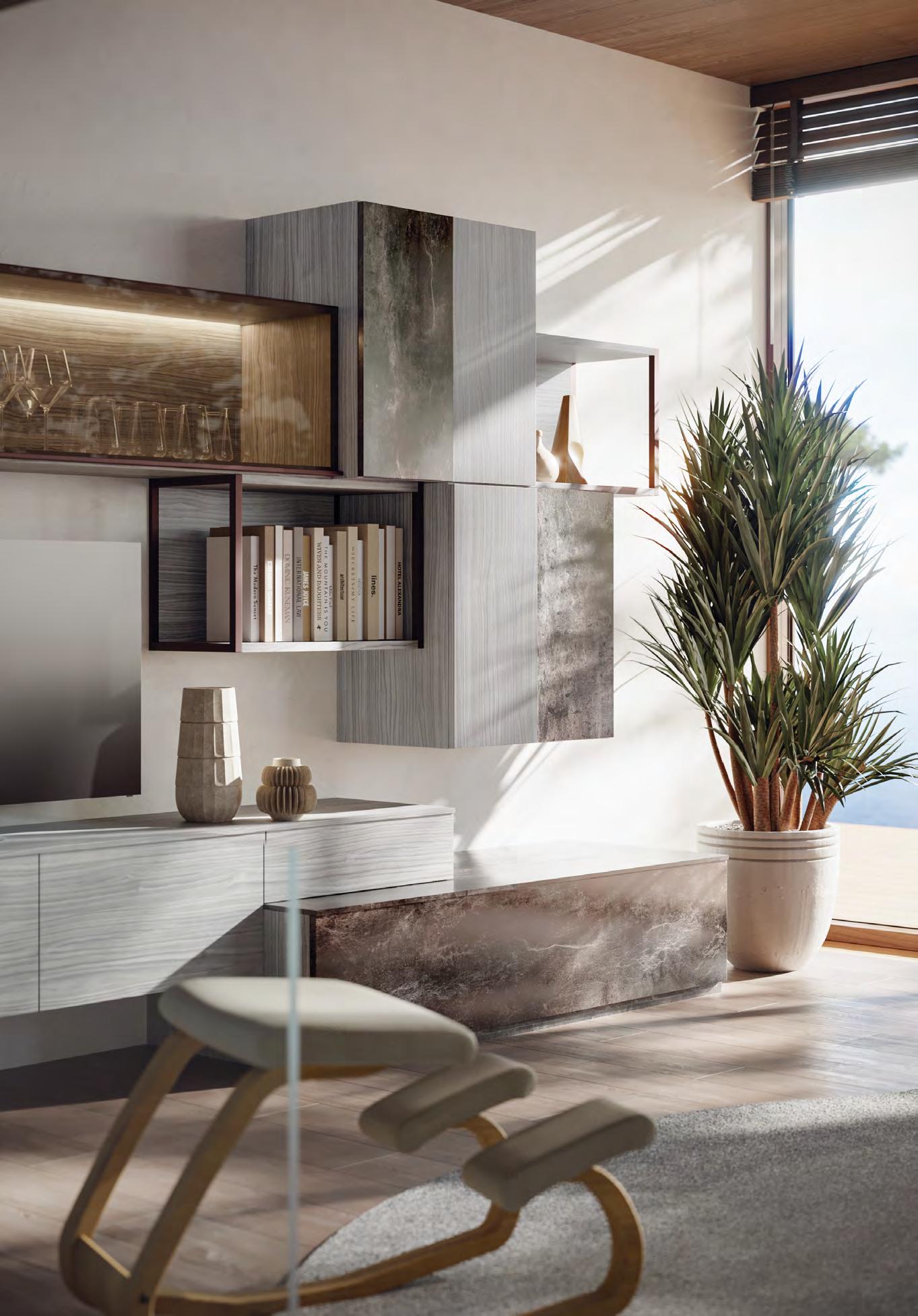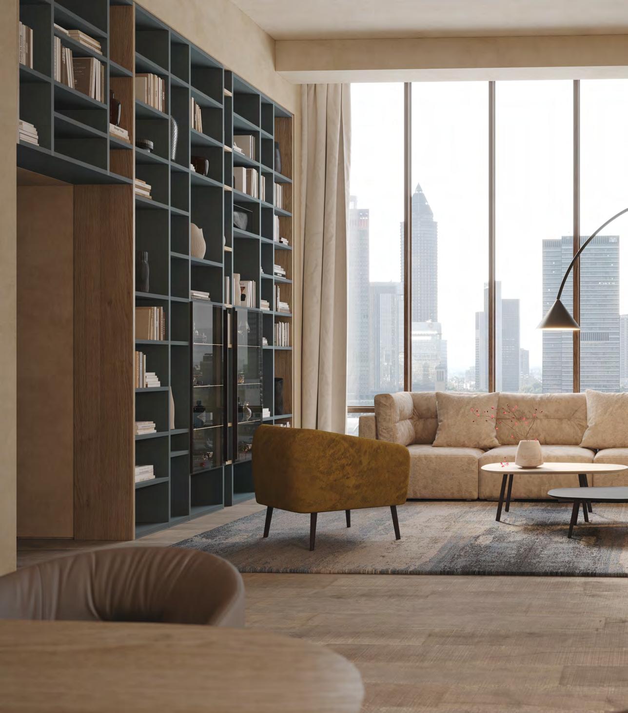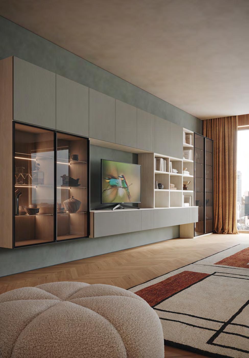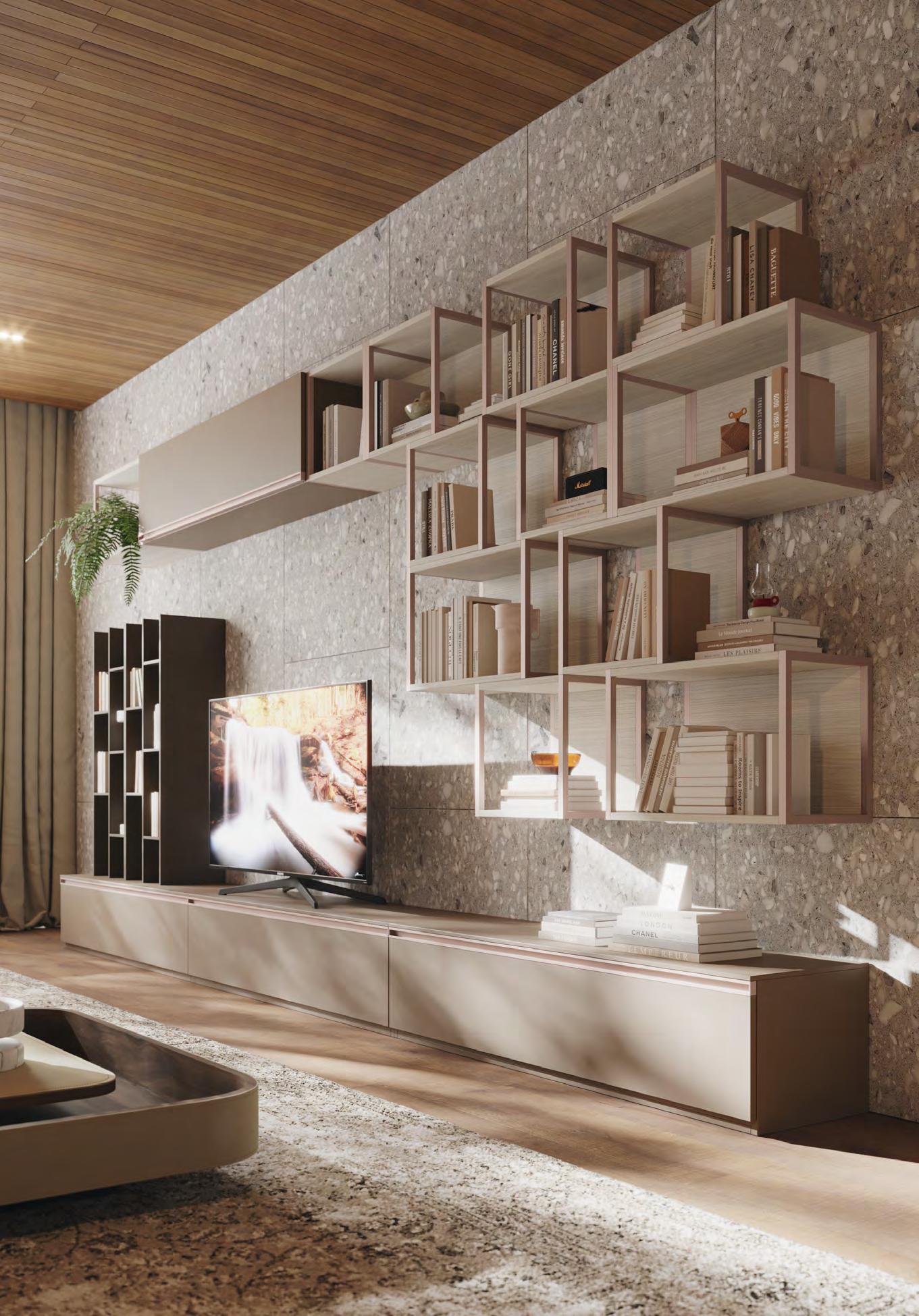 Ma il Living 2024 si impreziosisce soprattutto di finiture e colori: una palette di laccati più ispirata alla natura, che evoca sensazioni di tranquillità e pace; diverse nuove finiture vetro a scelta tra gli eleganti Canova e Sahara Noir effetto marmo, il Bronzo satinato dall’aspetto caldo e vellutato ed il cannettato Flutes Grigio scuro; tra i nuovi nobilitati introdotti spiccano invece Michelangelo e Marquinia che richiamano l’eleganza del marmo ed il Corten effetto ruggine; infine il nuovo color Rame introdotto per tutti gli accessori metallici che, affiancandosi ai preesistenti Brown e Champagne, aggiunge una nota di calore alle trame dei nostri vissuti.