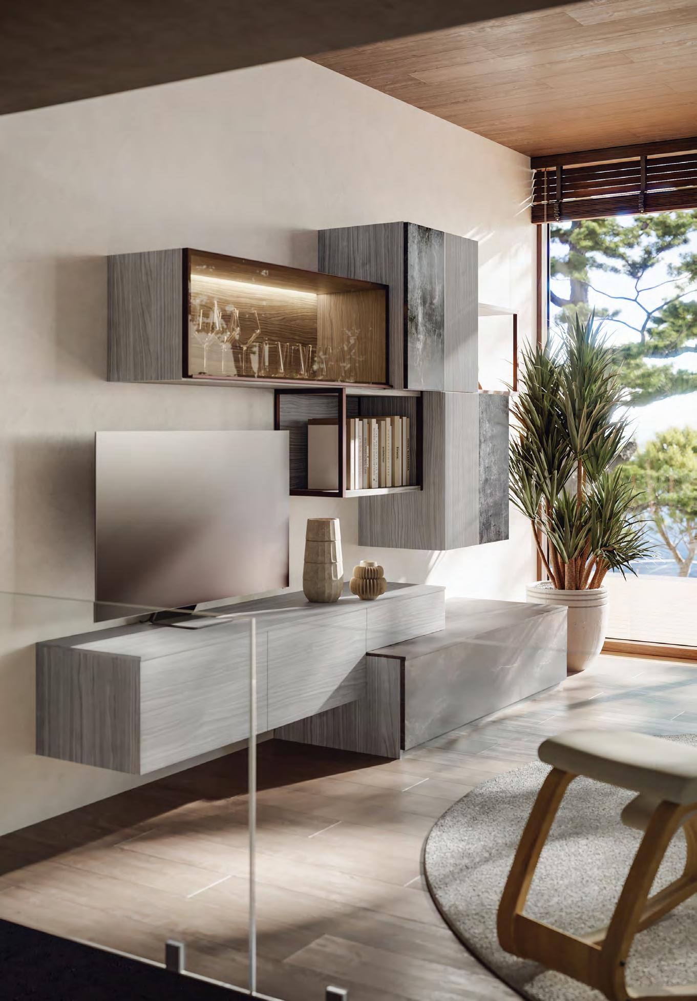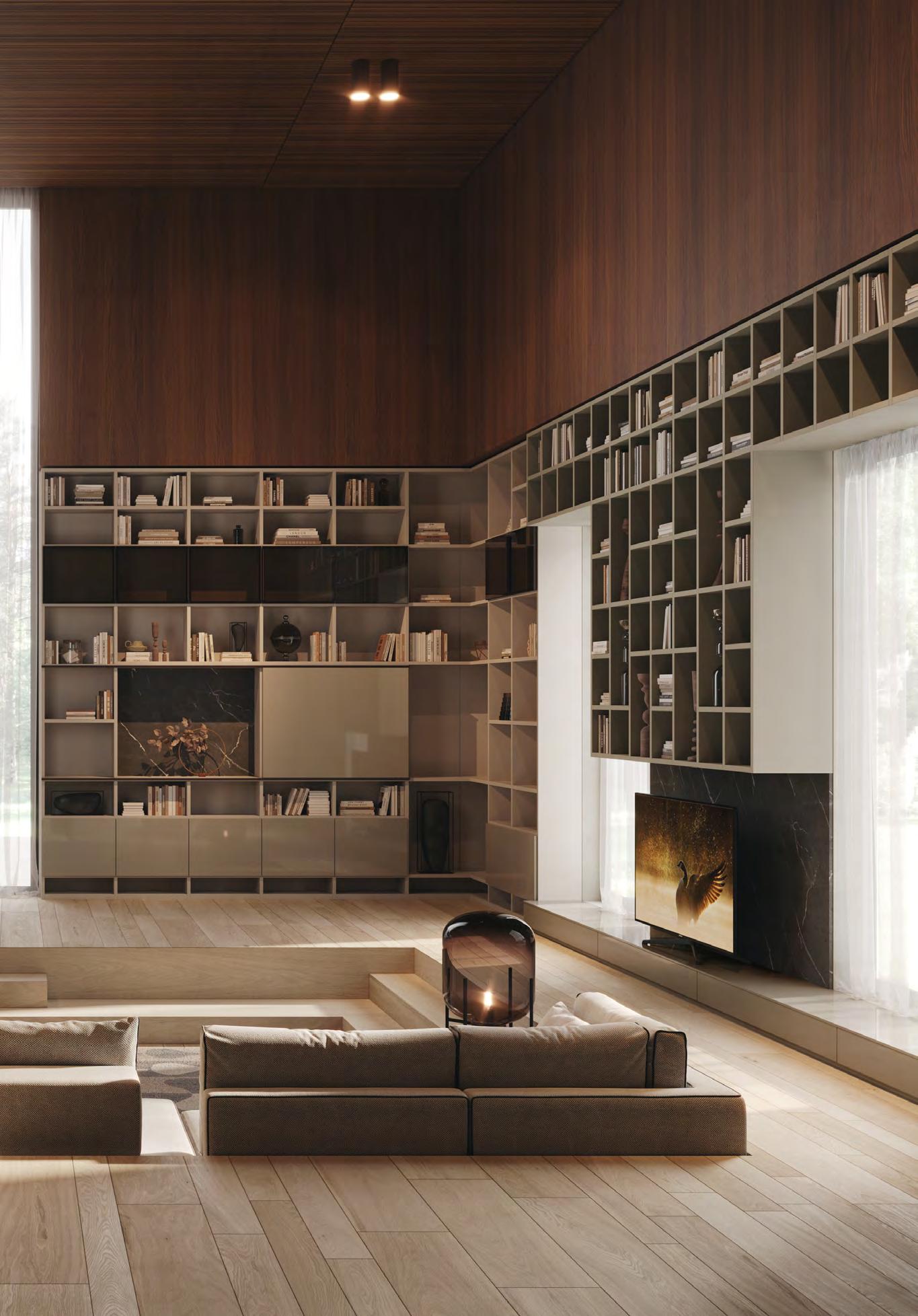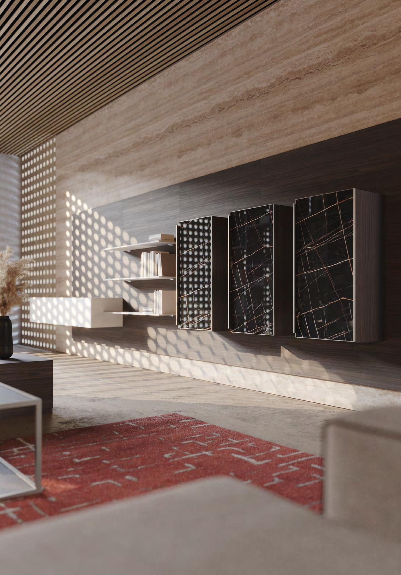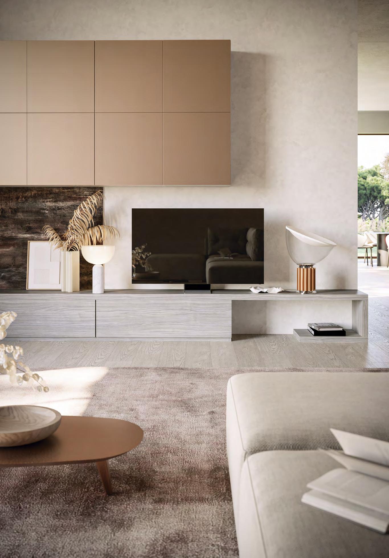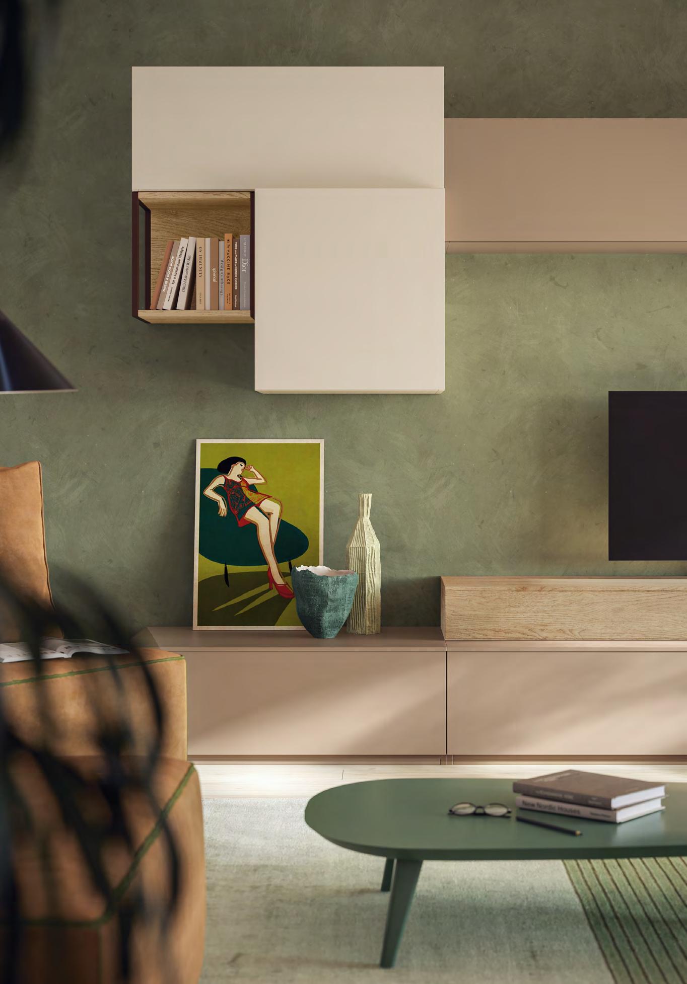 Ma il Living 2024 si impreziosisce soprattutto di finiture e colori: una palette di laccati più ispirata alla natura, che evoca sensazioni di tranquillità e pace; diverse nuove finiture vetro a scelta tra gli eleganti Canova e Sahara Noir effetto marmo, il Bronzo satinato dall’aspetto caldo e vellutato ed il cannettato Flutes Grigio scuro; tra i nuovi nobilitati introdotti spiccano invece Michelangelo e Marquinia che richiamano l’eleganza del marmo ed il Corten effetto ruggine; infine il nuovo color Rame introdotto per tutti gli accessori metallici che, affiancandosi ai preesistenti Brown e Champagne, aggiunge una nota di calore alle trame dei nostri vissuti.