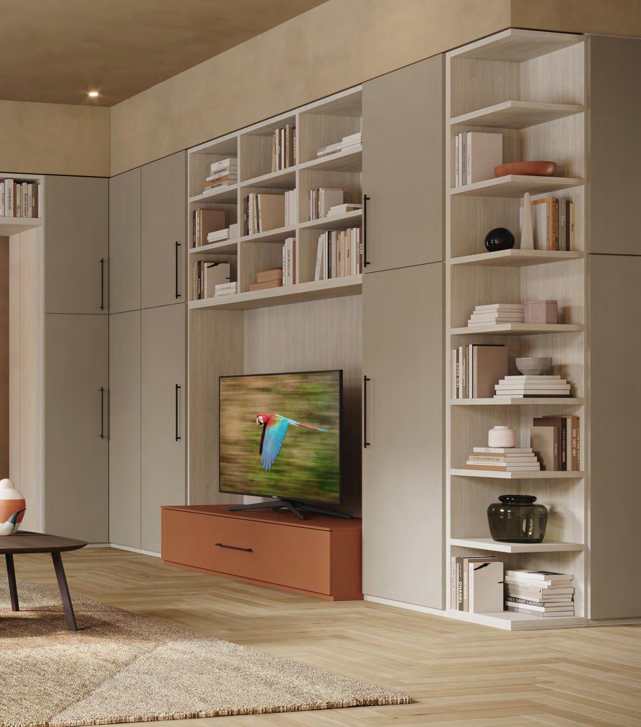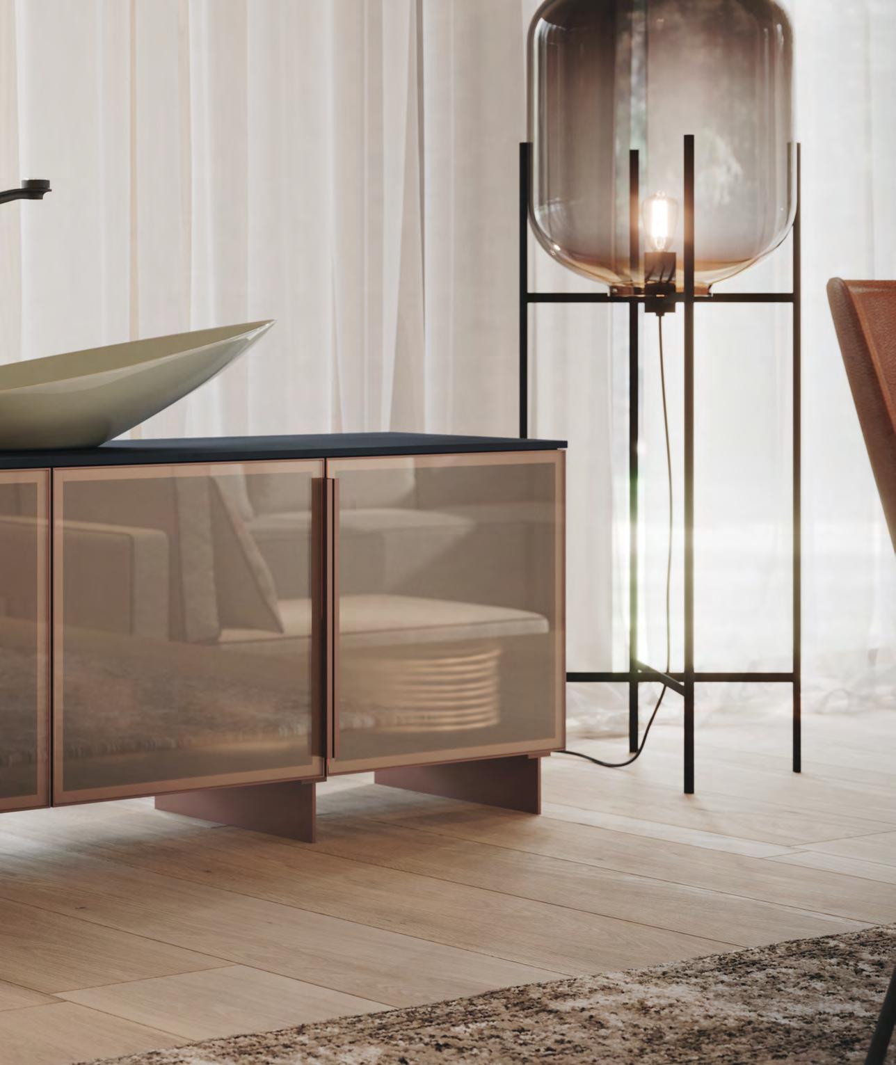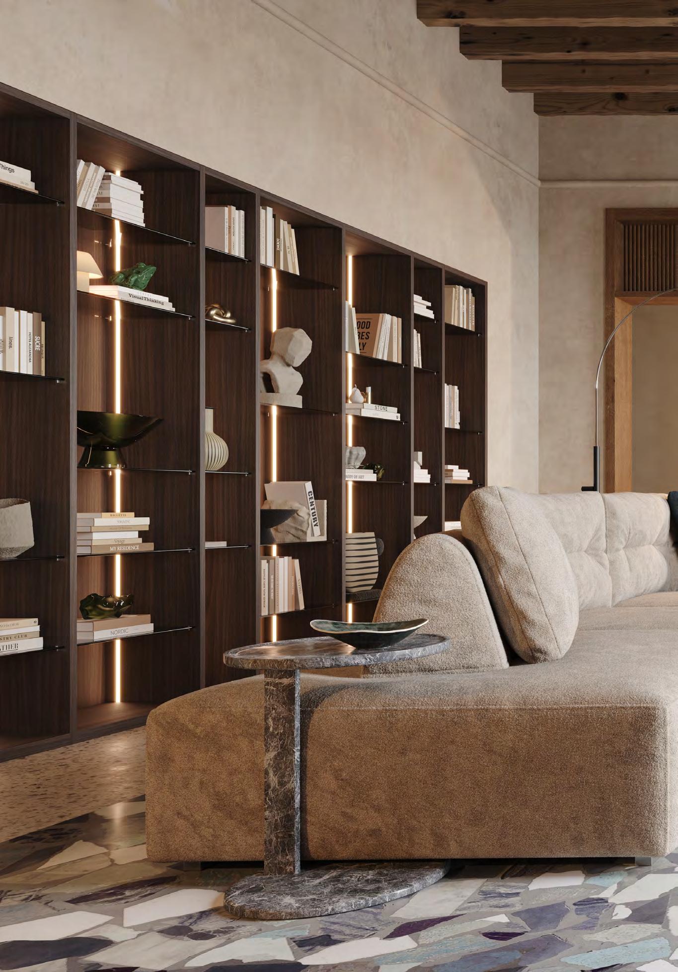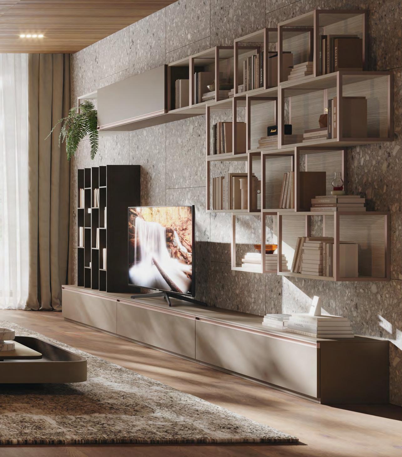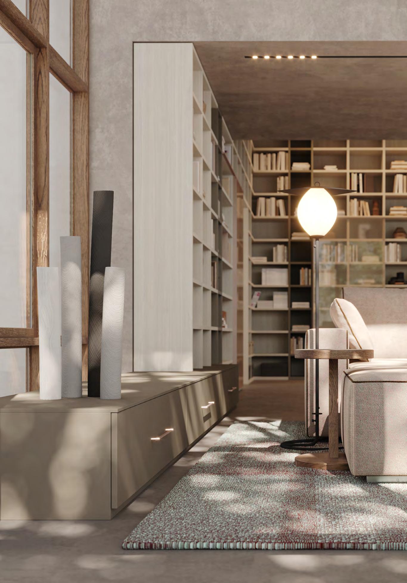 Ma il Living 2024 si impreziosisce soprattutto di finiture e colori: una palette di laccati più ispirata alla natura, che evoca sensazioni di tranquillità e pace; diverse nuove finiture vetro a scelta tra gli eleganti Canova e Sahara Noir effetto marmo, il Bronzo satinato dall’aspetto caldo e vellutato ed il cannettato Flutes Grigio scuro; tra i nuovi nobilitati introdotti spiccano invece Michelangelo e Marquinia che richiamano l’eleganza del marmo ed il Corten effetto ruggine; infine il nuovo color Rame introdotto per tutti gli accessori metallici che, affiancandosi ai preesistenti Brown e Champagne, aggiunge una nota di calore alle trame dei nostri vissuti.