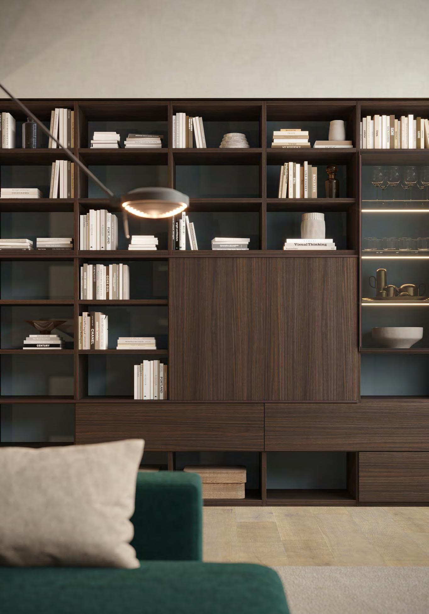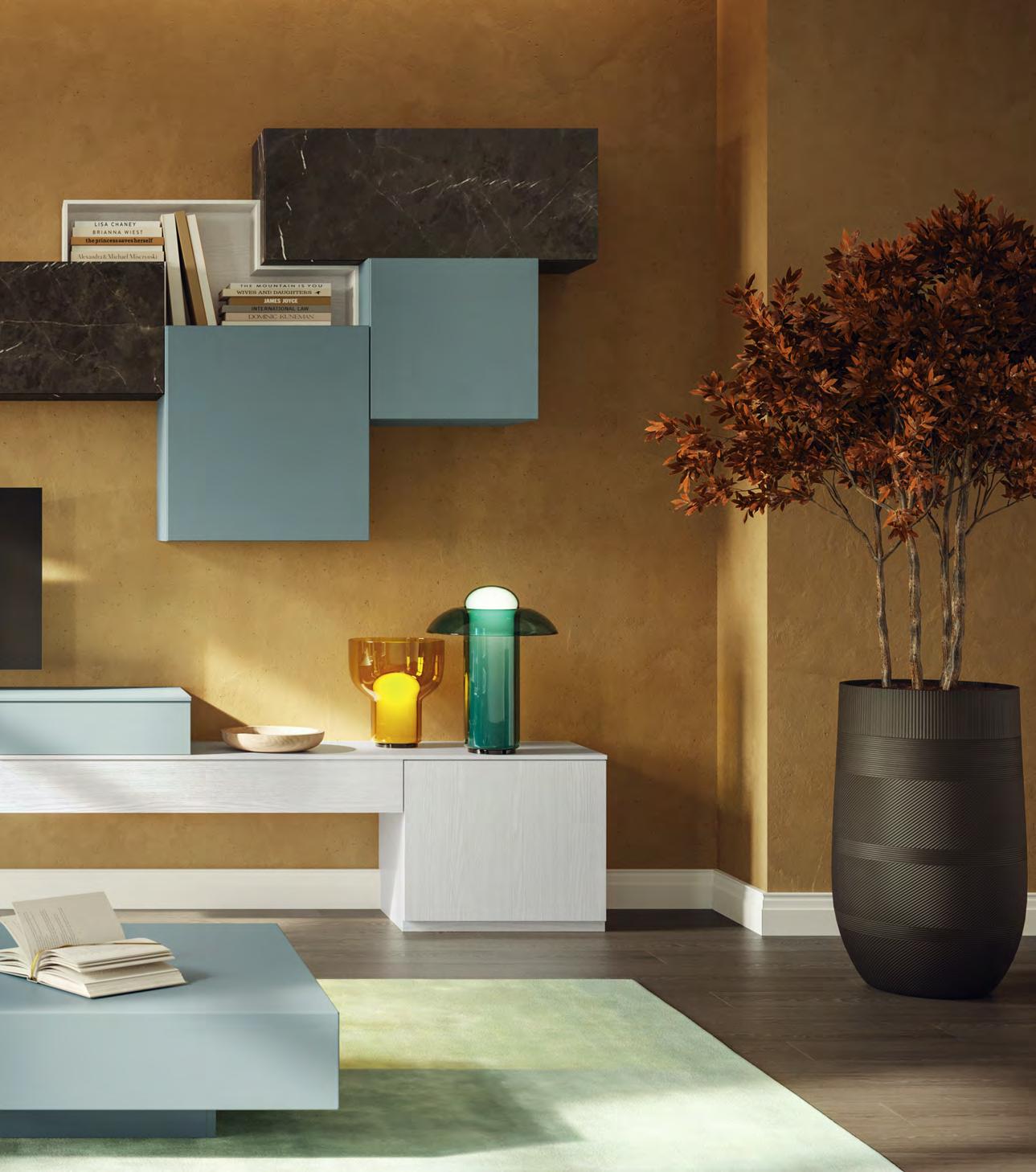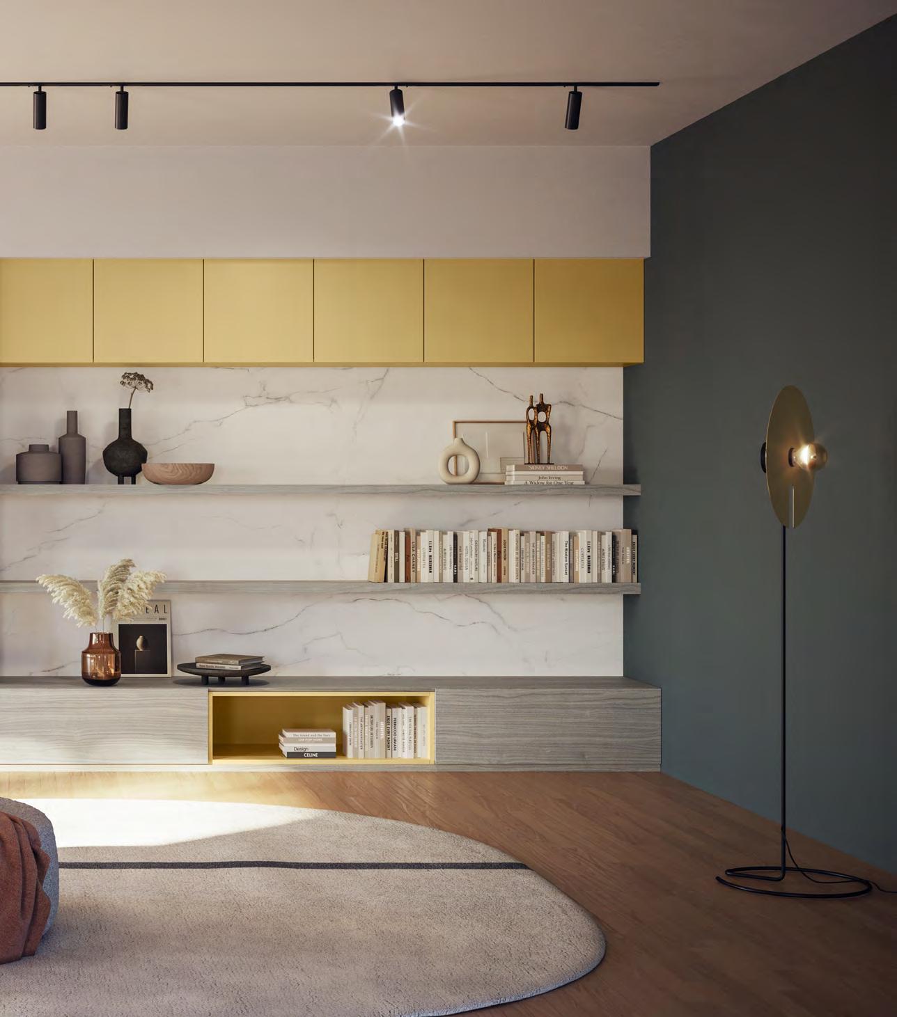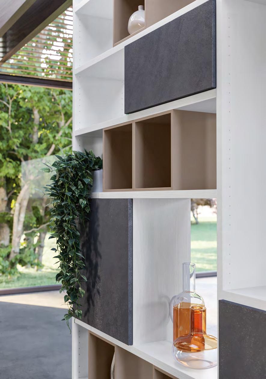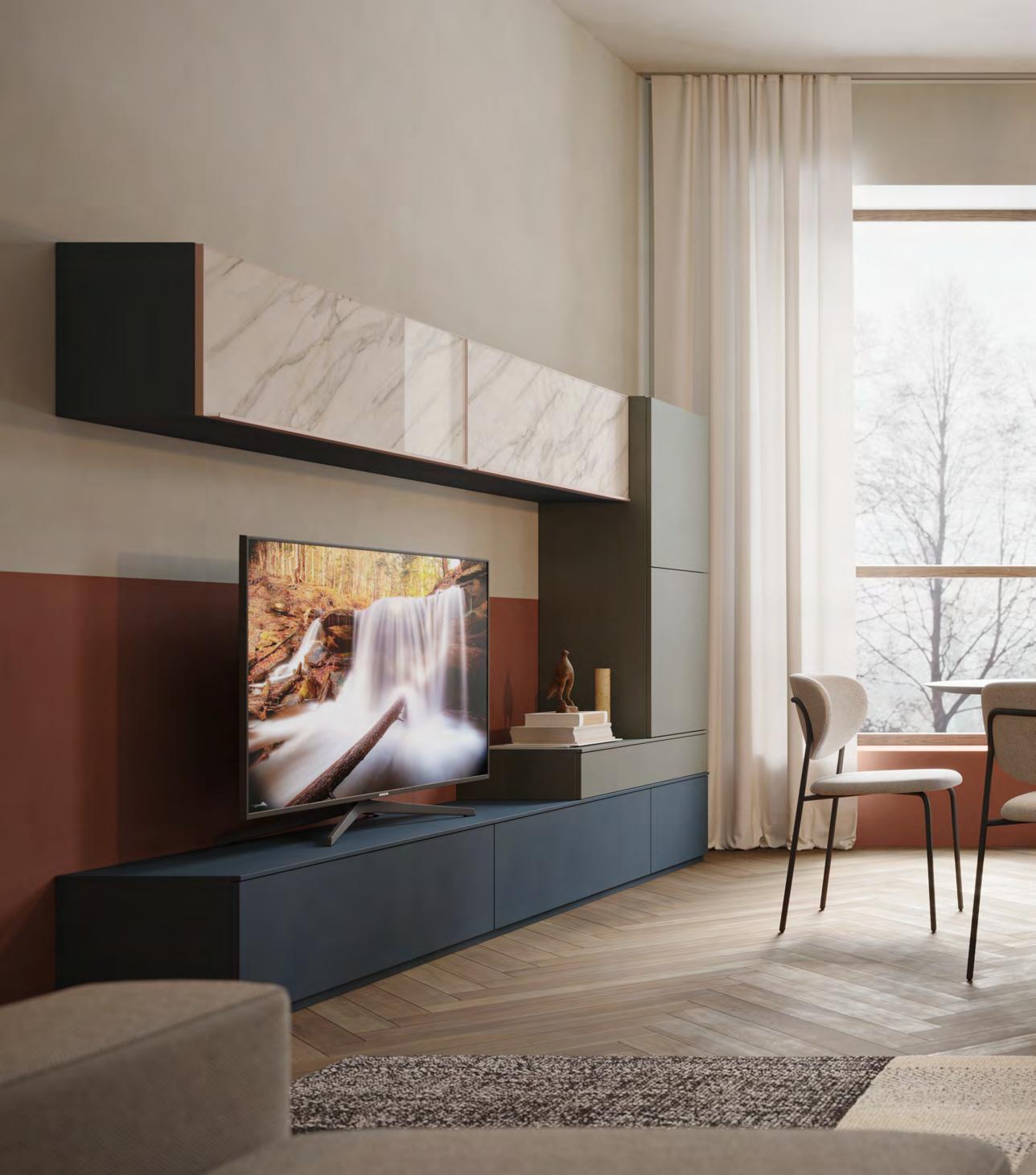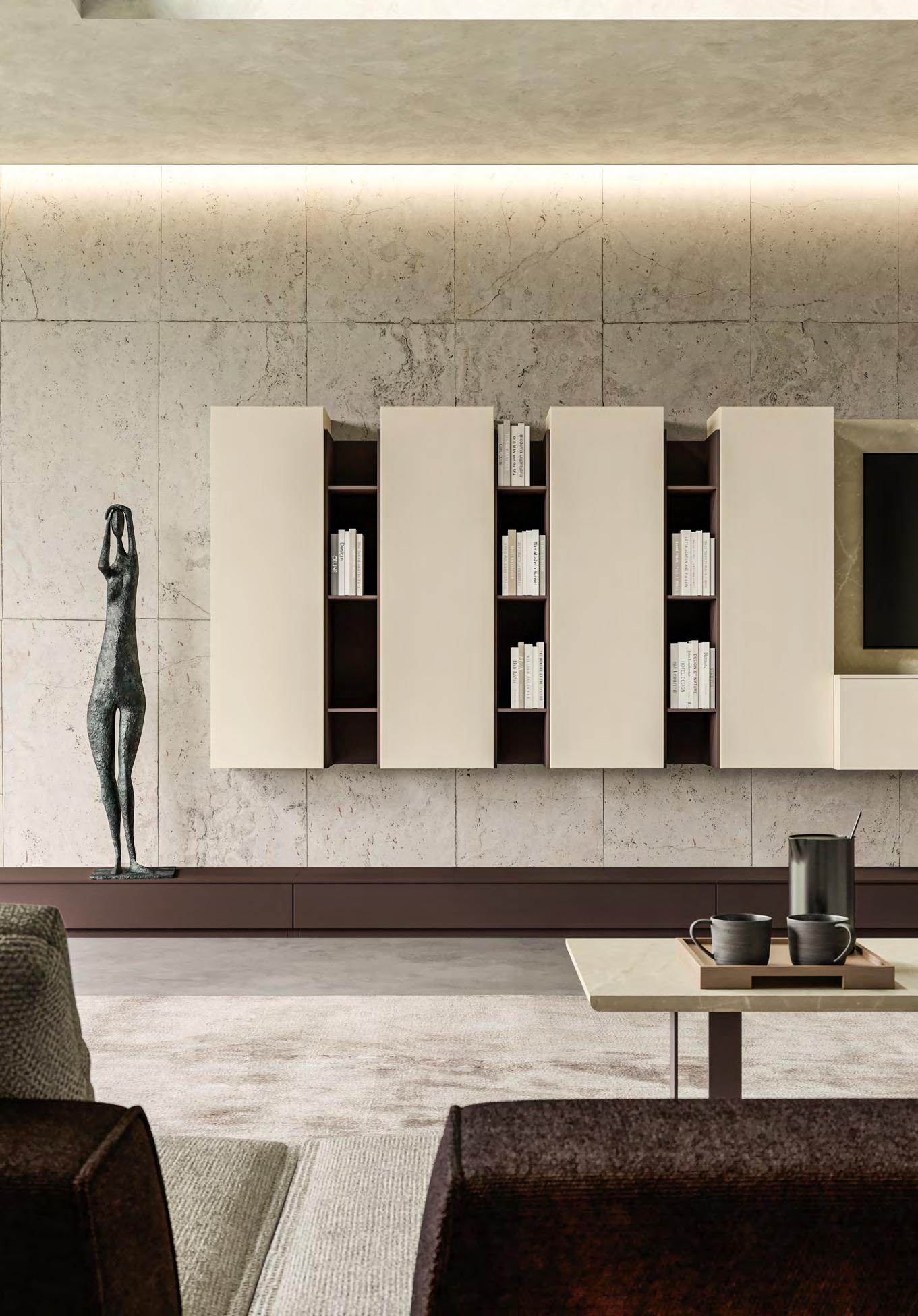 Ma il Living 2024 si impreziosisce soprattutto di finiture e colori: una palette di laccati più ispirata alla natura, che evoca sensazioni di tranquillità e pace; diverse nuove finiture vetro a scelta tra gli eleganti Canova e Sahara Noir effetto marmo, il Bronzo satinato dall’aspetto caldo e vellutato ed il cannettato Flutes Grigio scuro; tra i nuovi nobilitati introdotti spiccano invece Michelangelo e Marquinia che richiamano l’eleganza del marmo ed il Corten effetto ruggine; infine il nuovo color Rame introdotto per tutti gli accessori metallici che, affiancandosi ai preesistenti Brown e Champagne, aggiunge una nota di calore alle trame dei nostri vissuti.