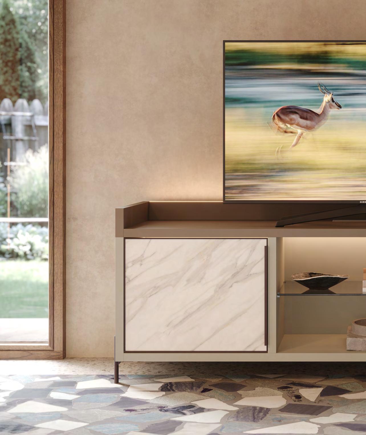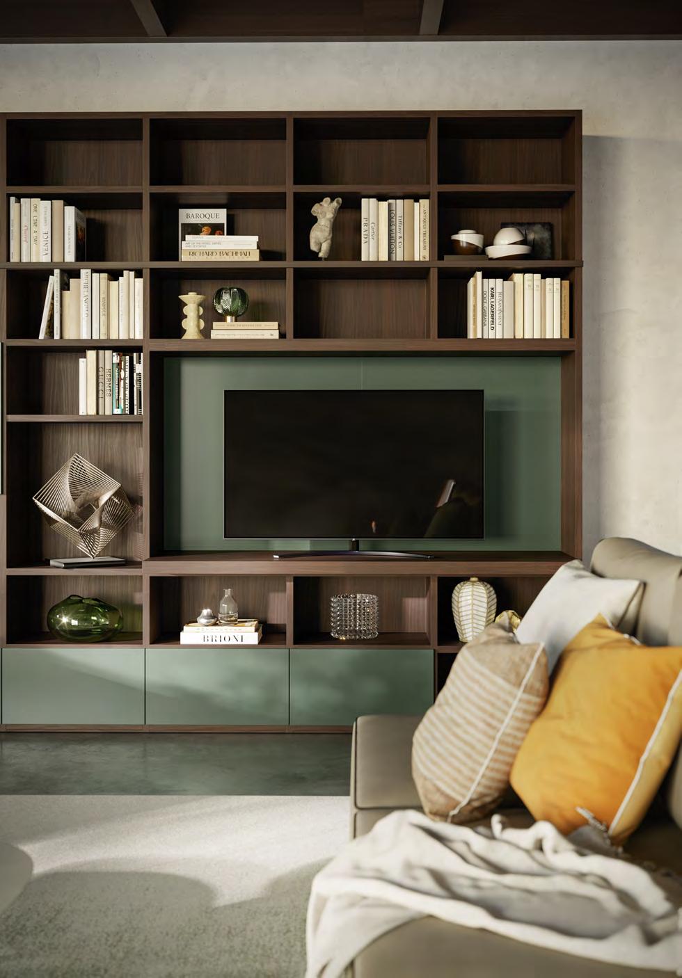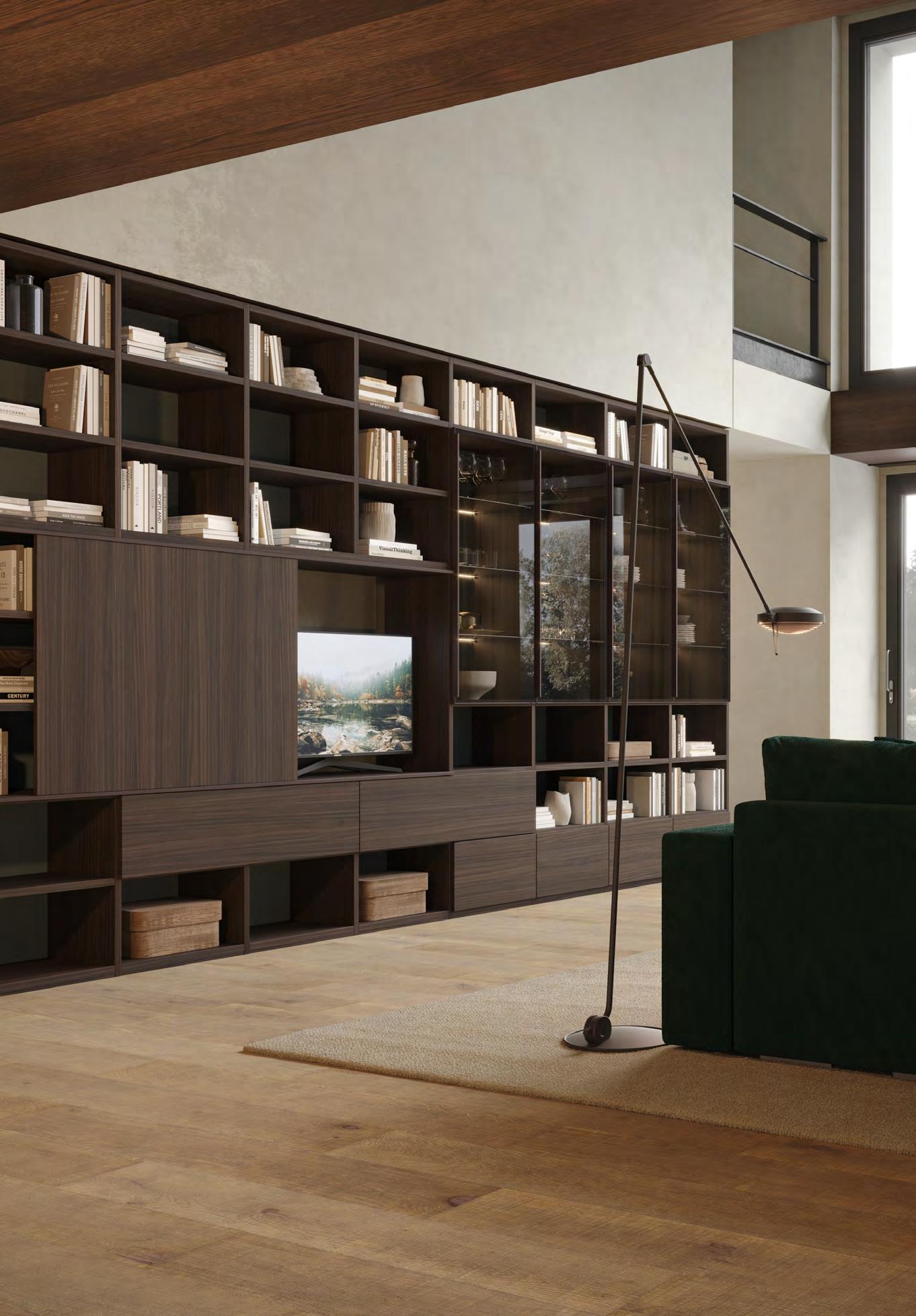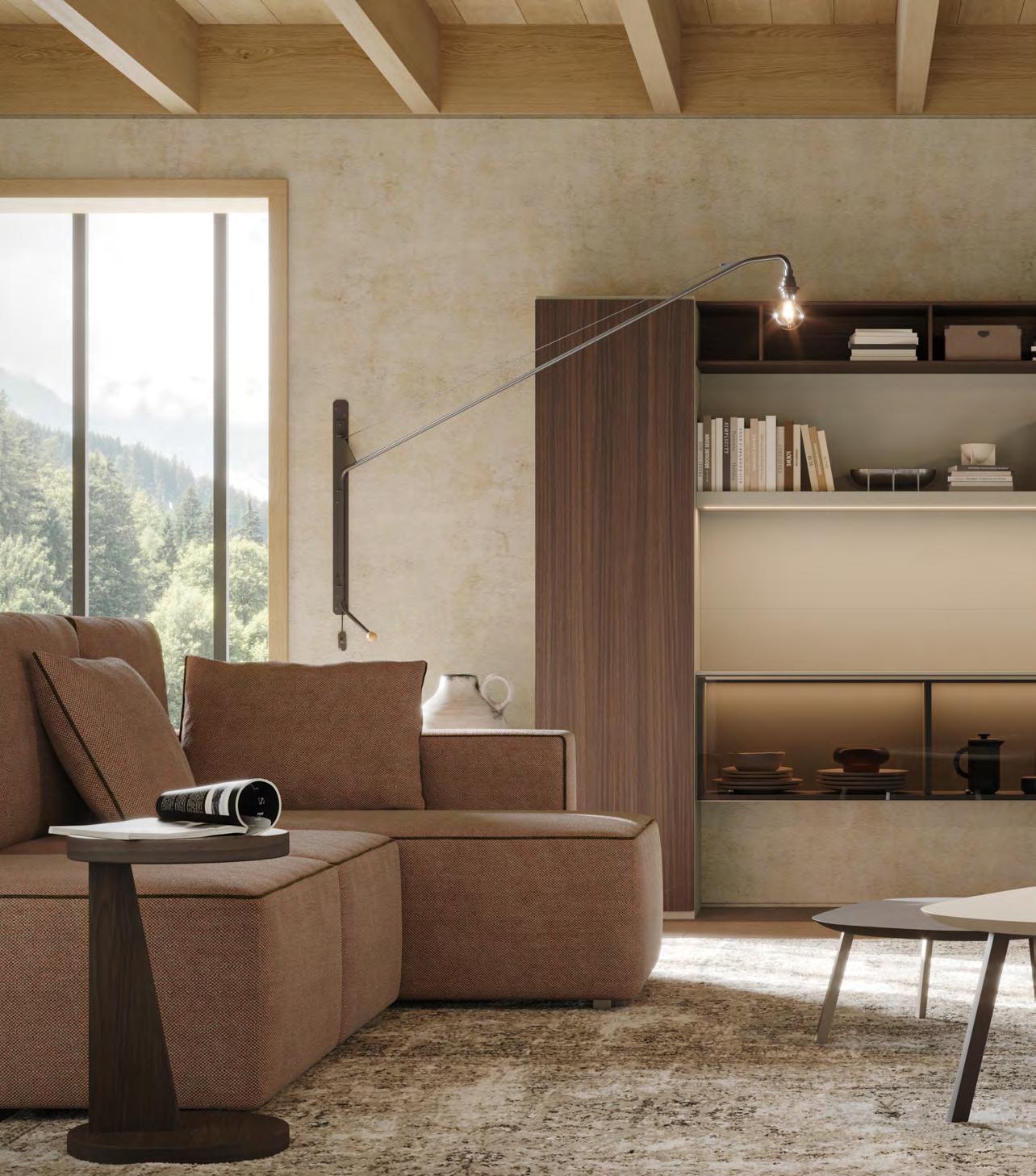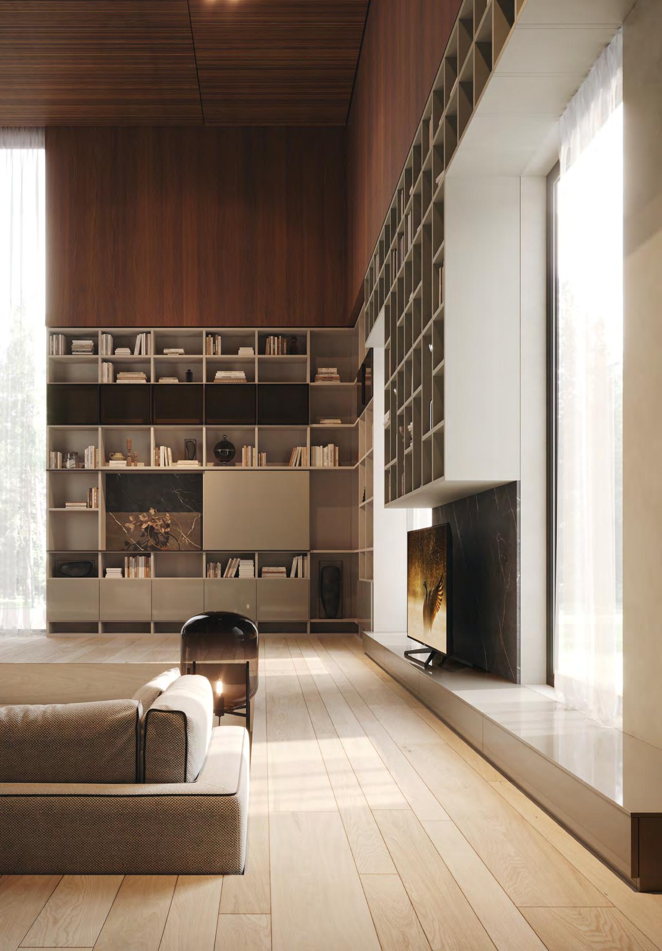 Ma il Living 2024 si impreziosisce soprattutto di finiture e colori: una palette di laccati più ispirata alla natura, che evoca sensazioni di tranquillità e pace; diverse nuove finiture vetro a scelta tra gli eleganti Canova e Sahara Noir effetto marmo, il Bronzo satinato dall’aspetto caldo e vellutato ed il cannettato Flutes Grigio scuro; tra i nuovi nobilitati introdotti spiccano invece Michelangelo e Marquinia che richiamano l’eleganza del marmo ed il Corten effetto ruggine; infine il nuovo color Rame introdotto per tutti gli accessori metallici che, affiancandosi ai preesistenti Brown e Champagne, aggiunge una nota di calore alle trame dei nostri vissuti.