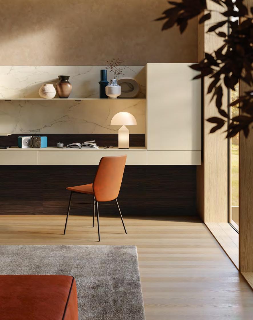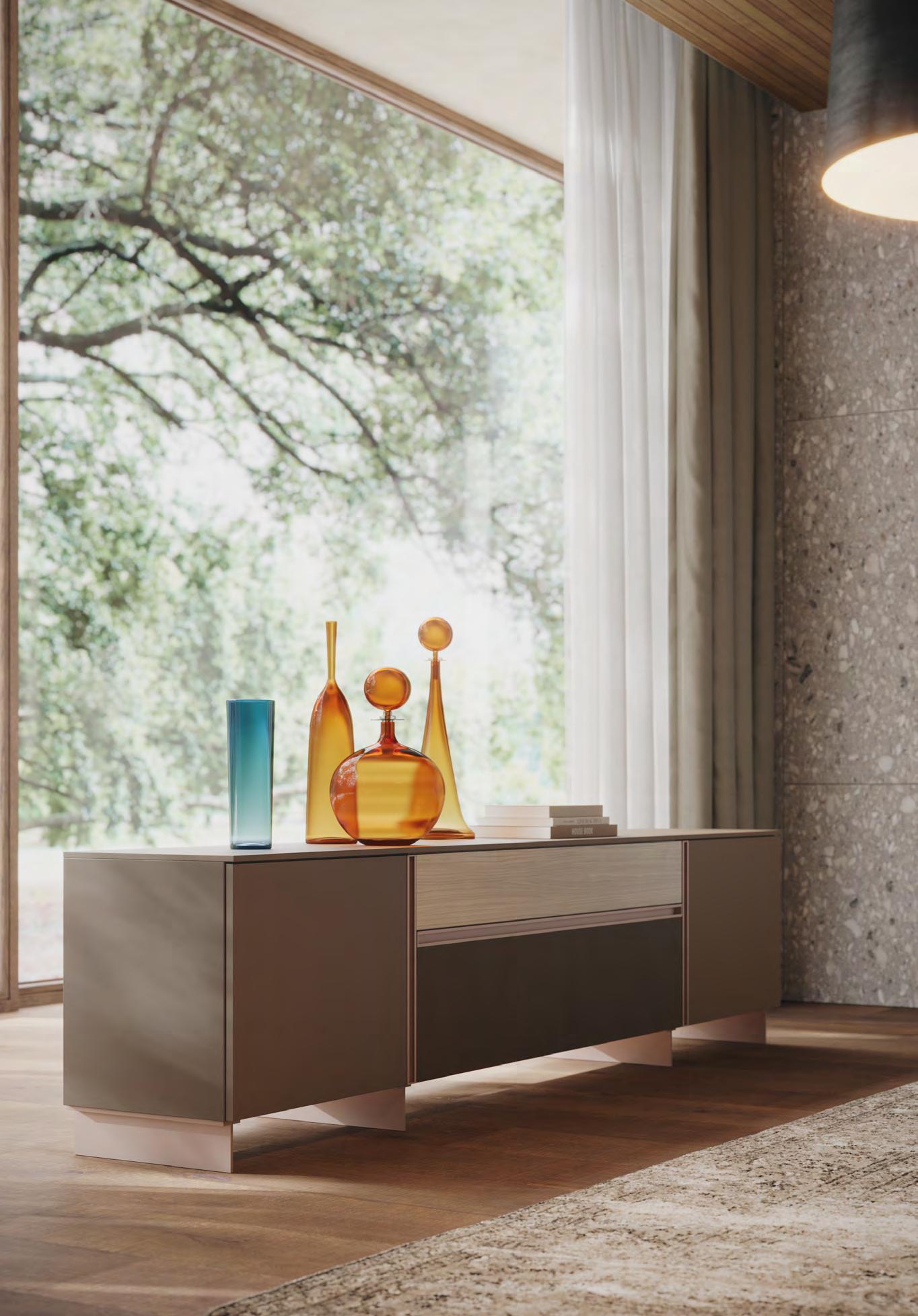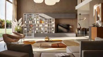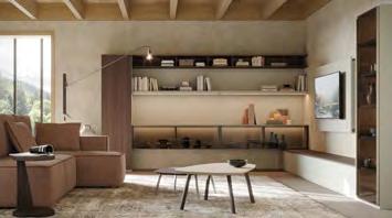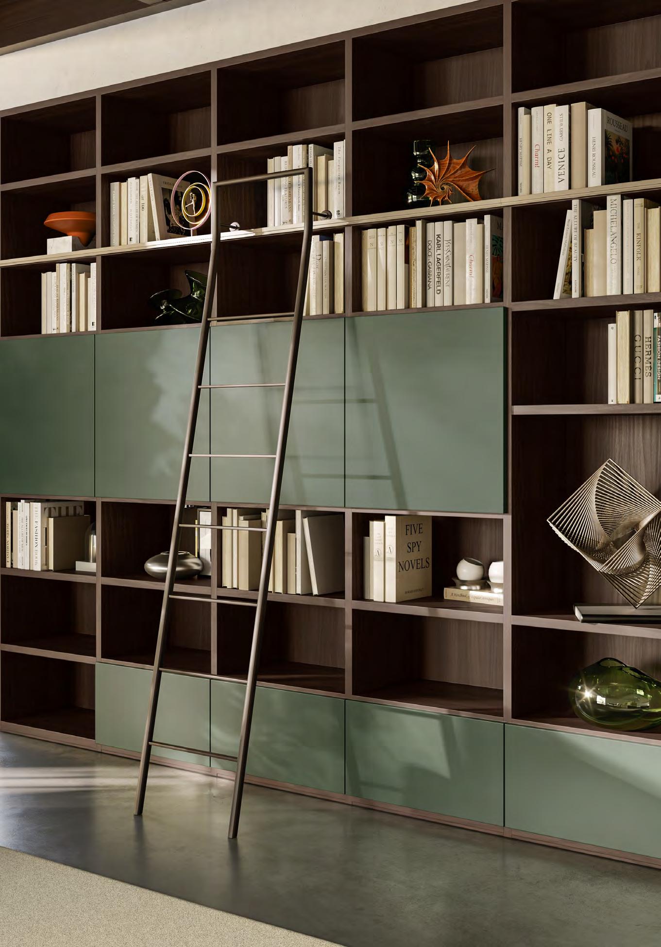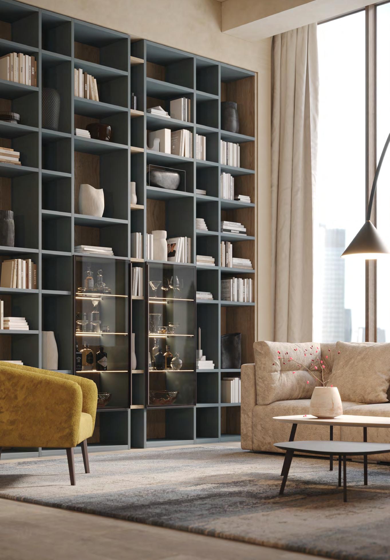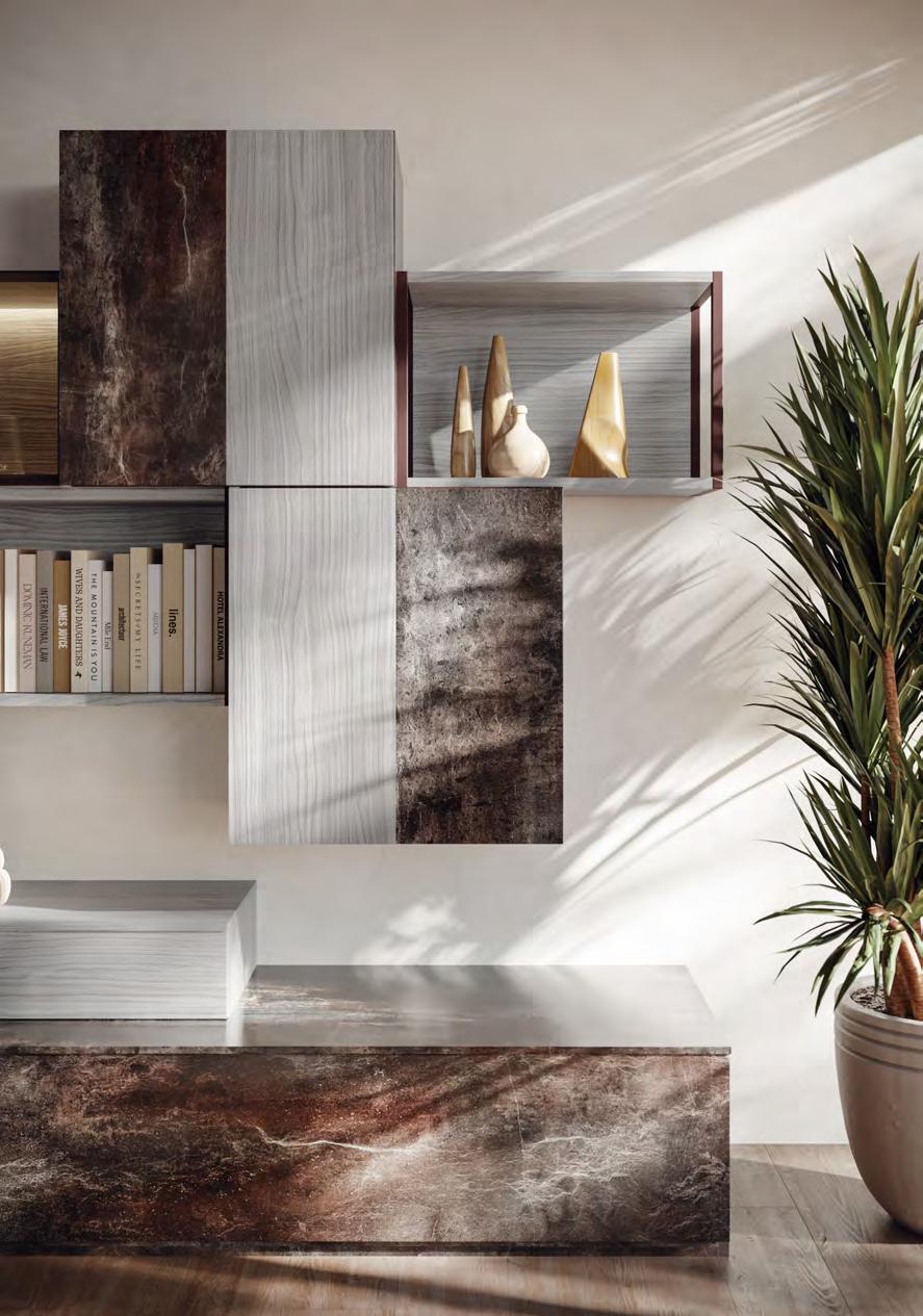 Ma il Living 2024 si impreziosisce soprattutto di finiture e colori: una palette di laccati più ispirata alla natura, che evoca sensazioni di tranquillità e pace; diverse nuove finiture vetro a scelta tra gli eleganti Canova e Sahara Noir effetto marmo, il Bronzo satinato dall’aspetto caldo e vellutato ed il cannettato Flutes Grigio scuro; tra i nuovi nobilitati introdotti spiccano invece Michelangelo e Marquinia che richiamano l’eleganza del marmo ed il Corten effetto ruggine; infine il nuovo color Rame introdotto per tutti gli accessori metallici che, affiancandosi ai preesistenti Brown e Champagne, aggiunge una nota di calore alle trame dei nostri vissuti.