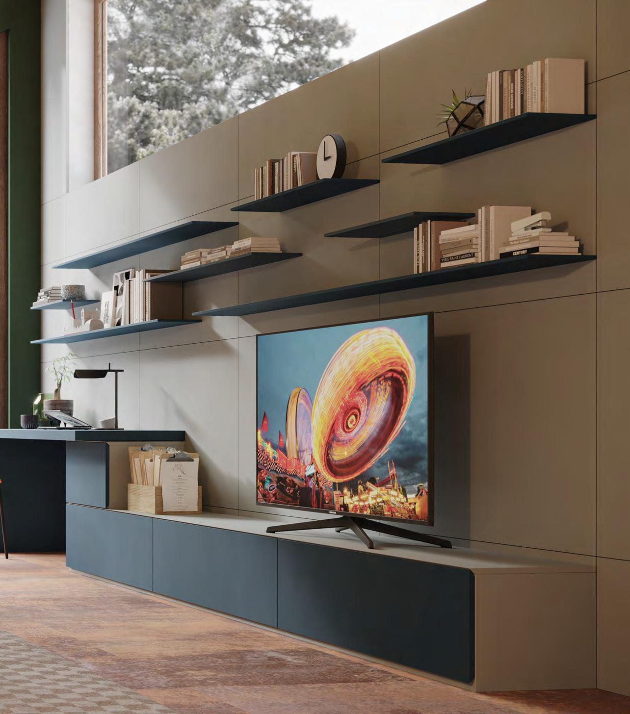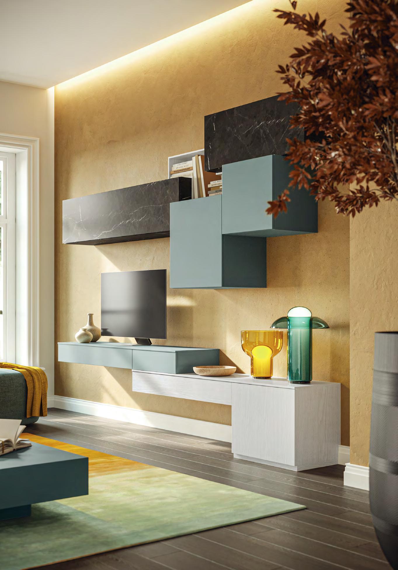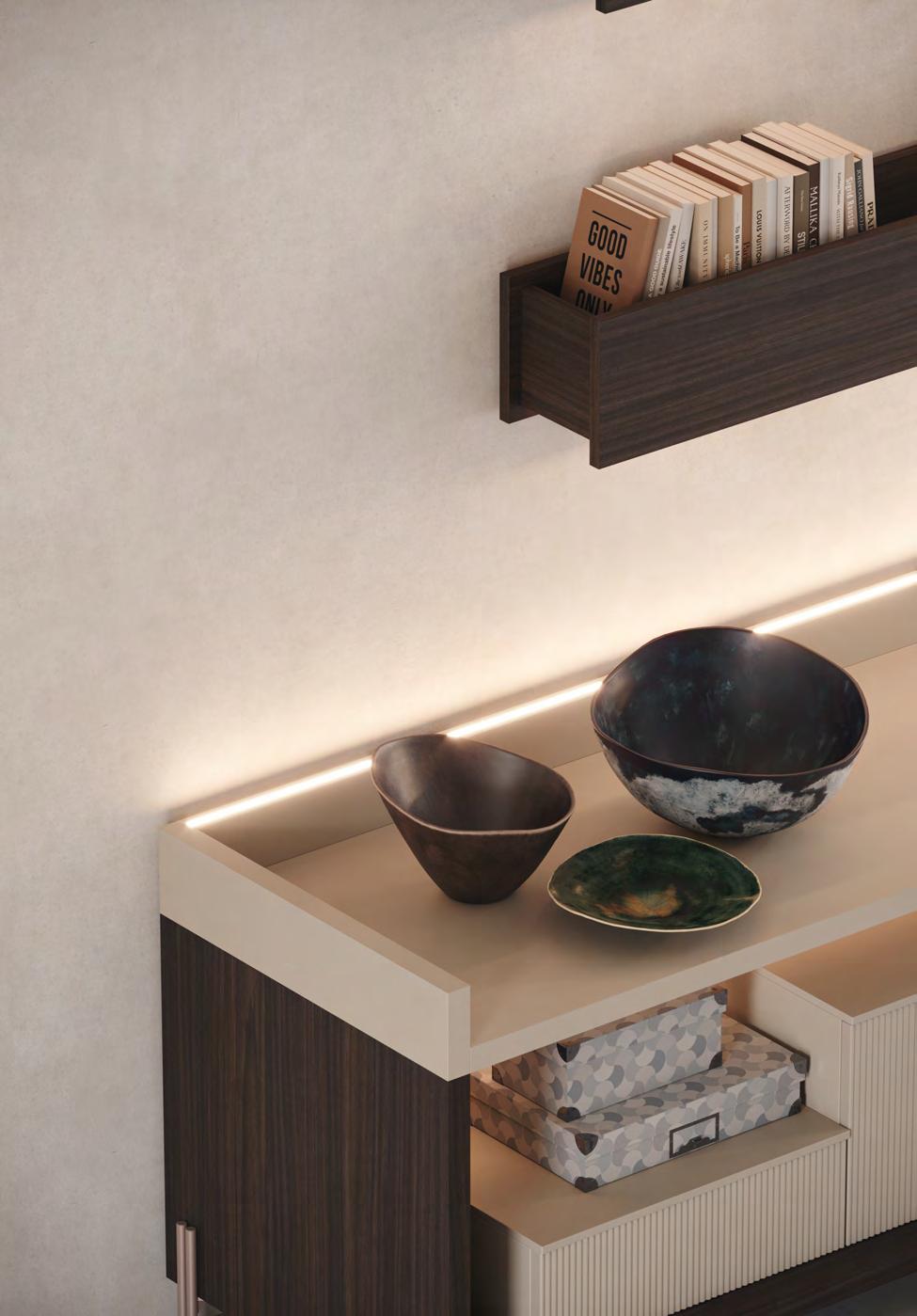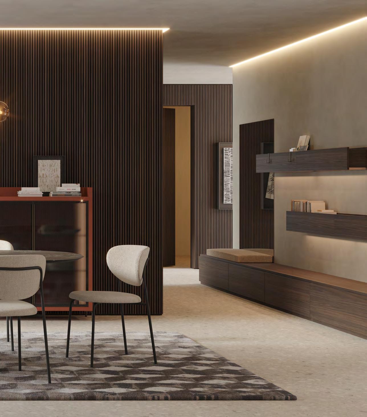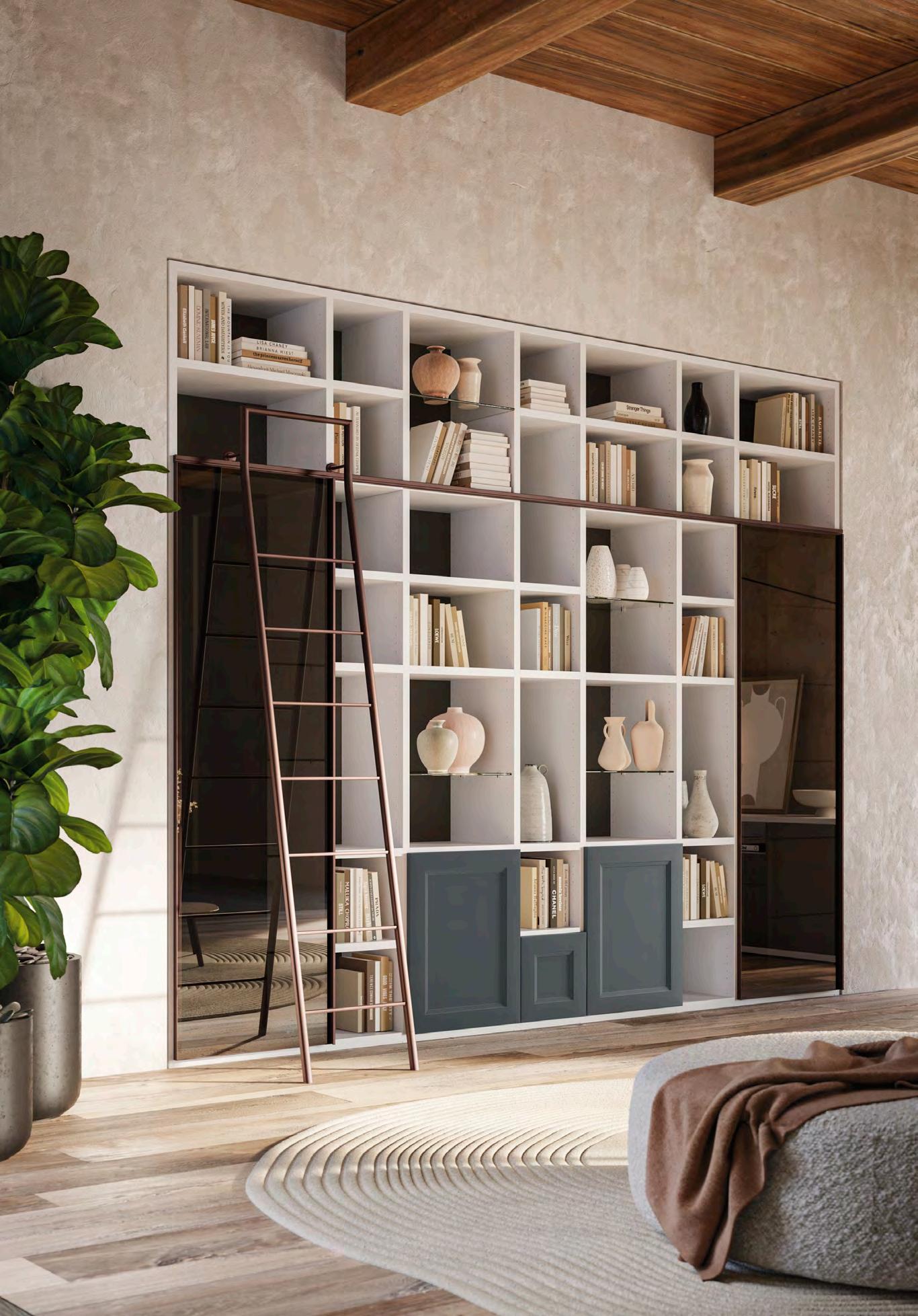 Ma il Living 2024 si impreziosisce soprattutto di finiture e colori: una palette di laccati più ispirata alla natura, che evoca sensazioni di tranquillità e pace; diverse nuove finiture vetro a scelta tra gli eleganti Canova e Sahara Noir effetto marmo, il Bronzo satinato dall’aspetto caldo e vellutato ed il cannettato Flutes Grigio scuro; tra i nuovi nobilitati introdotti spiccano invece Michelangelo e Marquinia che richiamano l’eleganza del marmo ed il Corten effetto ruggine; infine il nuovo color Rame introdotto per tutti gli accessori metallici che, affiancandosi ai preesistenti Brown e Champagne, aggiunge una nota di calore alle trame dei nostri vissuti.
