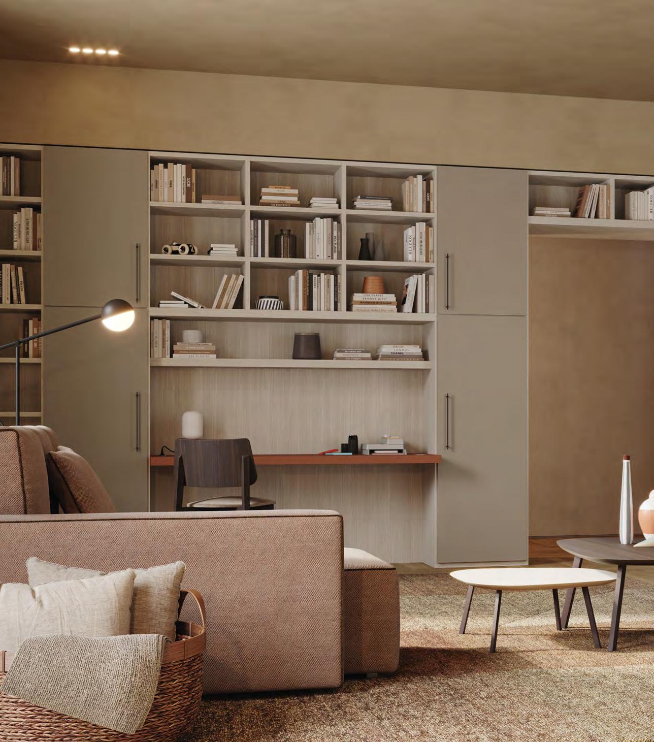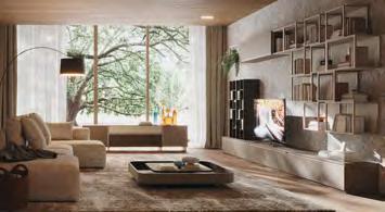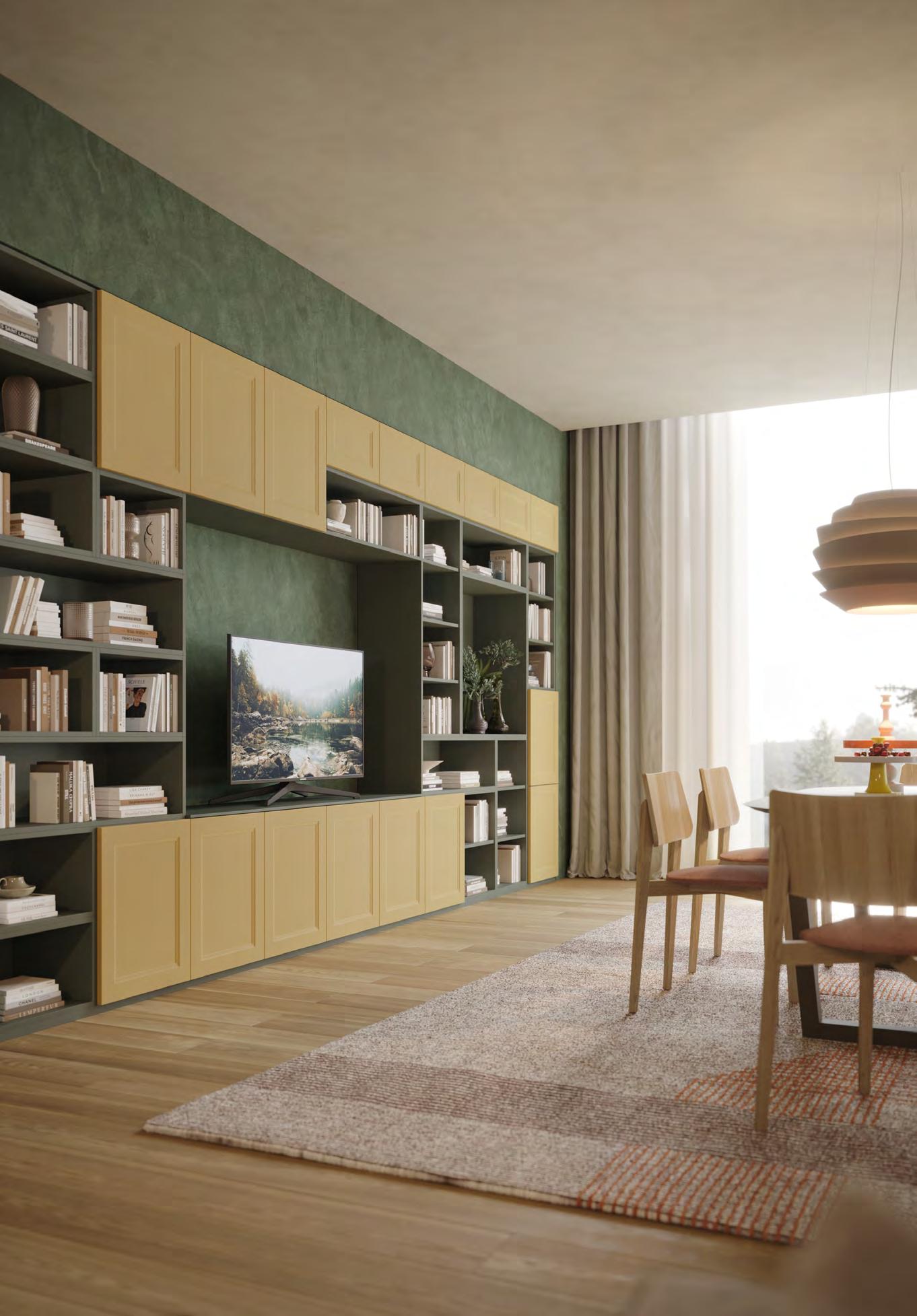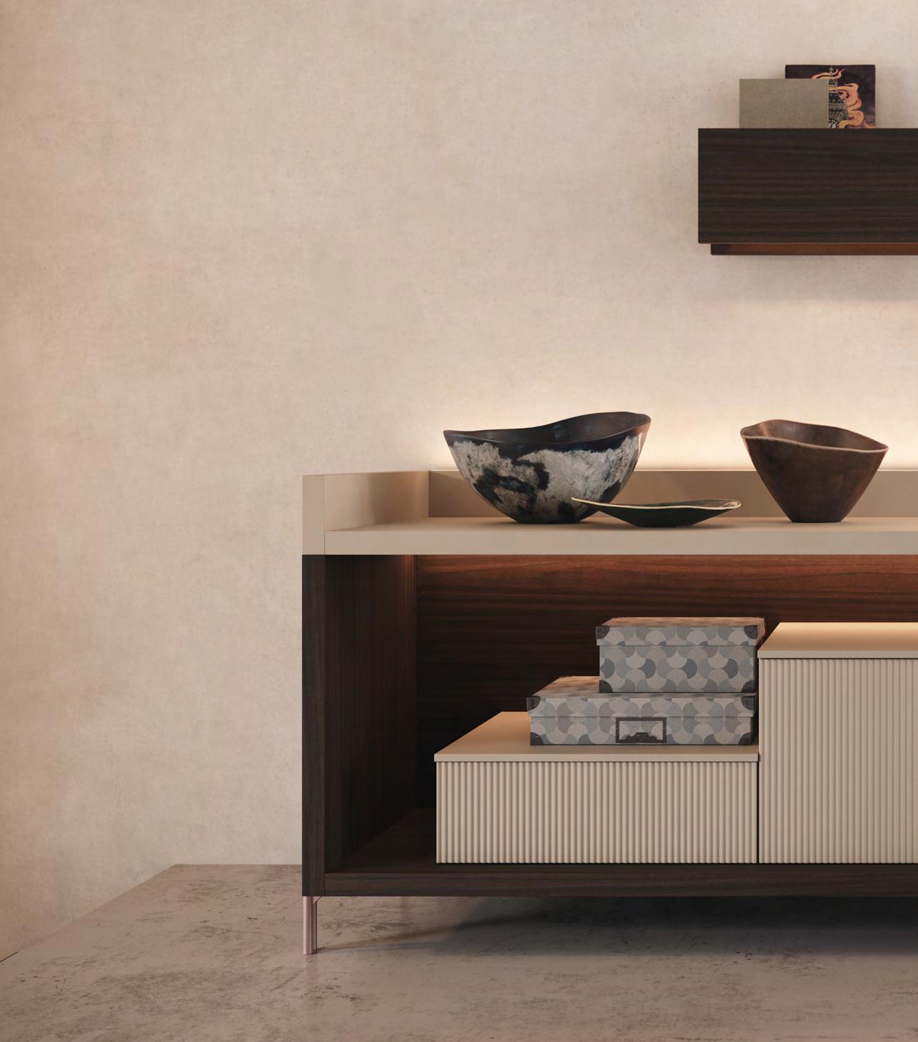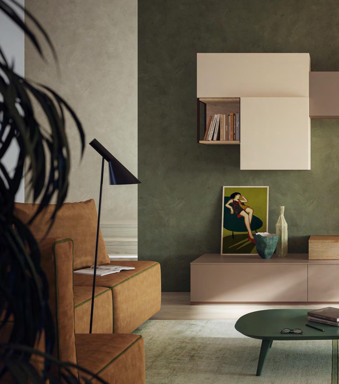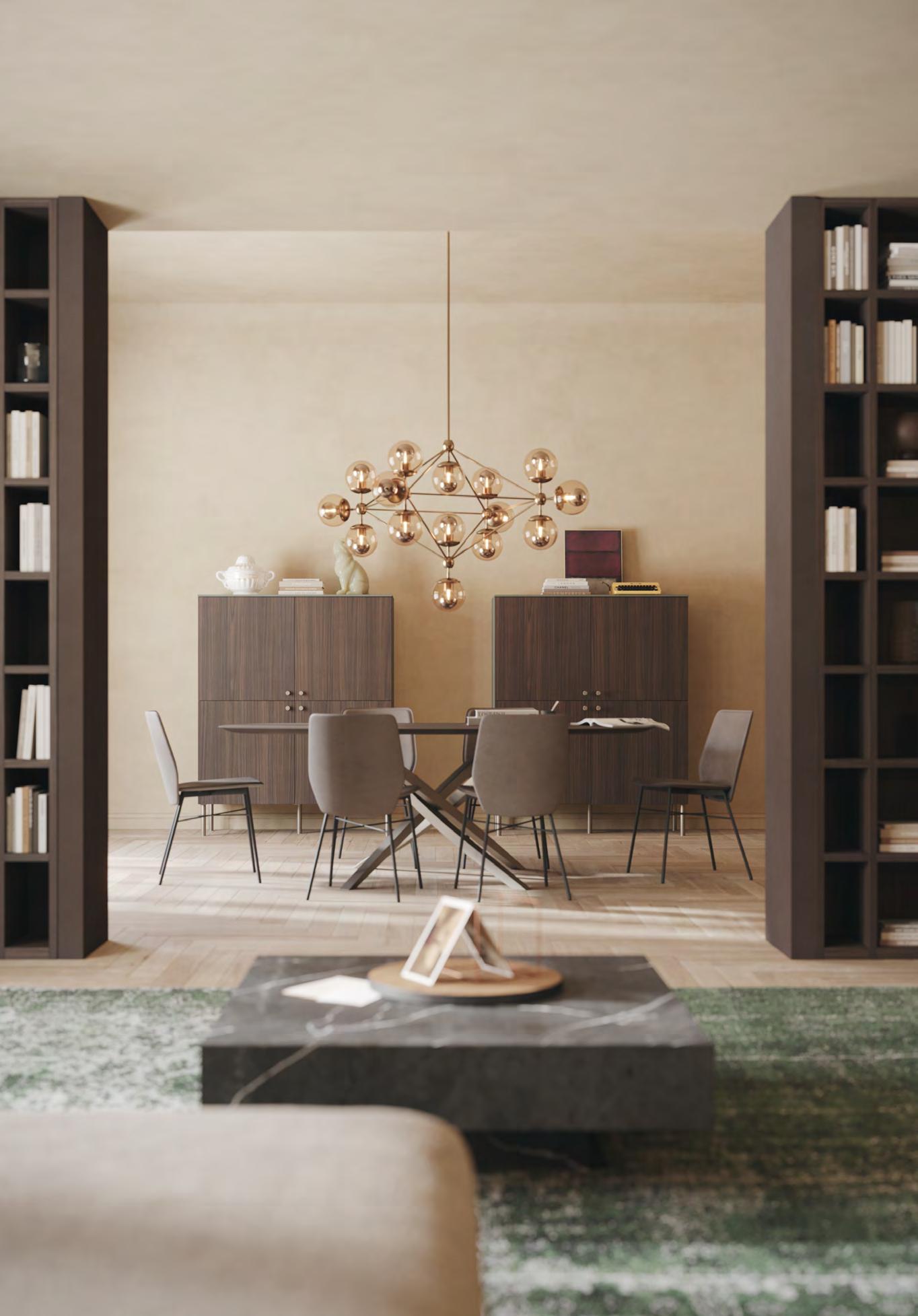 Ma il Living 2024 si impreziosisce soprattutto di finiture e colori: una palette di laccati più ispirata alla natura, che evoca sensazioni di tranquillità e pace; diverse nuove finiture vetro a scelta tra gli eleganti Canova e Sahara Noir effetto marmo, il Bronzo satinato dall’aspetto caldo e vellutato ed il cannettato Flutes Grigio scuro; tra i nuovi nobilitati introdotti spiccano invece Michelangelo e Marquinia che richiamano l’eleganza del marmo ed il Corten effetto ruggine; infine il nuovo color Rame introdotto per tutti gli accessori metallici che, affiancandosi ai preesistenti Brown e Champagne, aggiunge una nota di calore alle trame dei nostri vissuti.