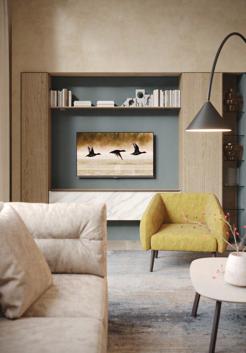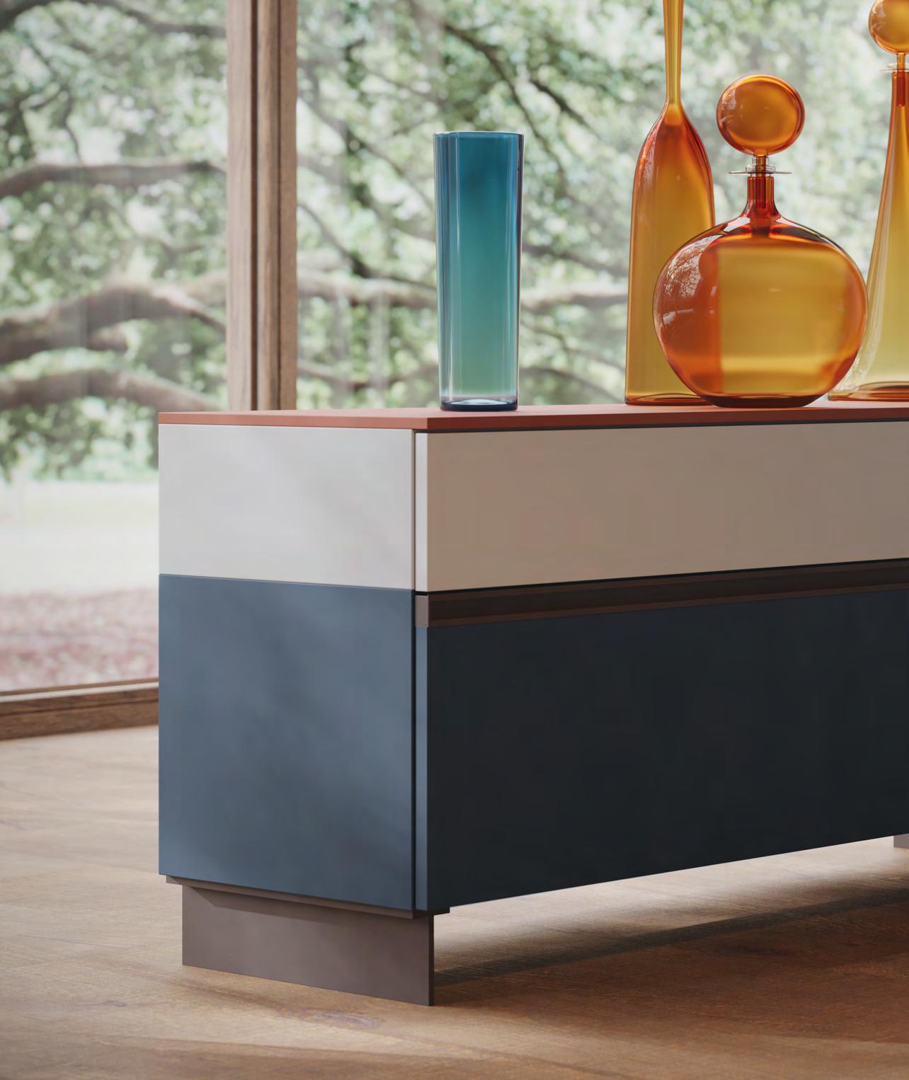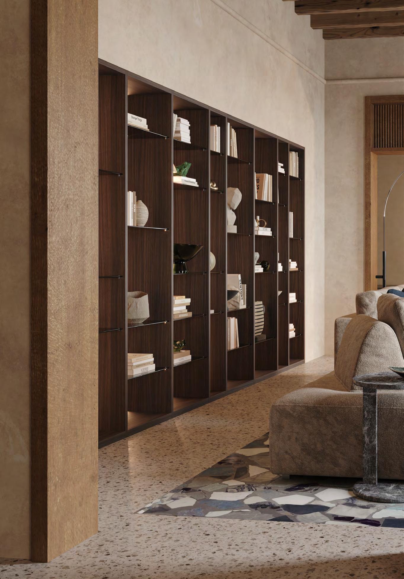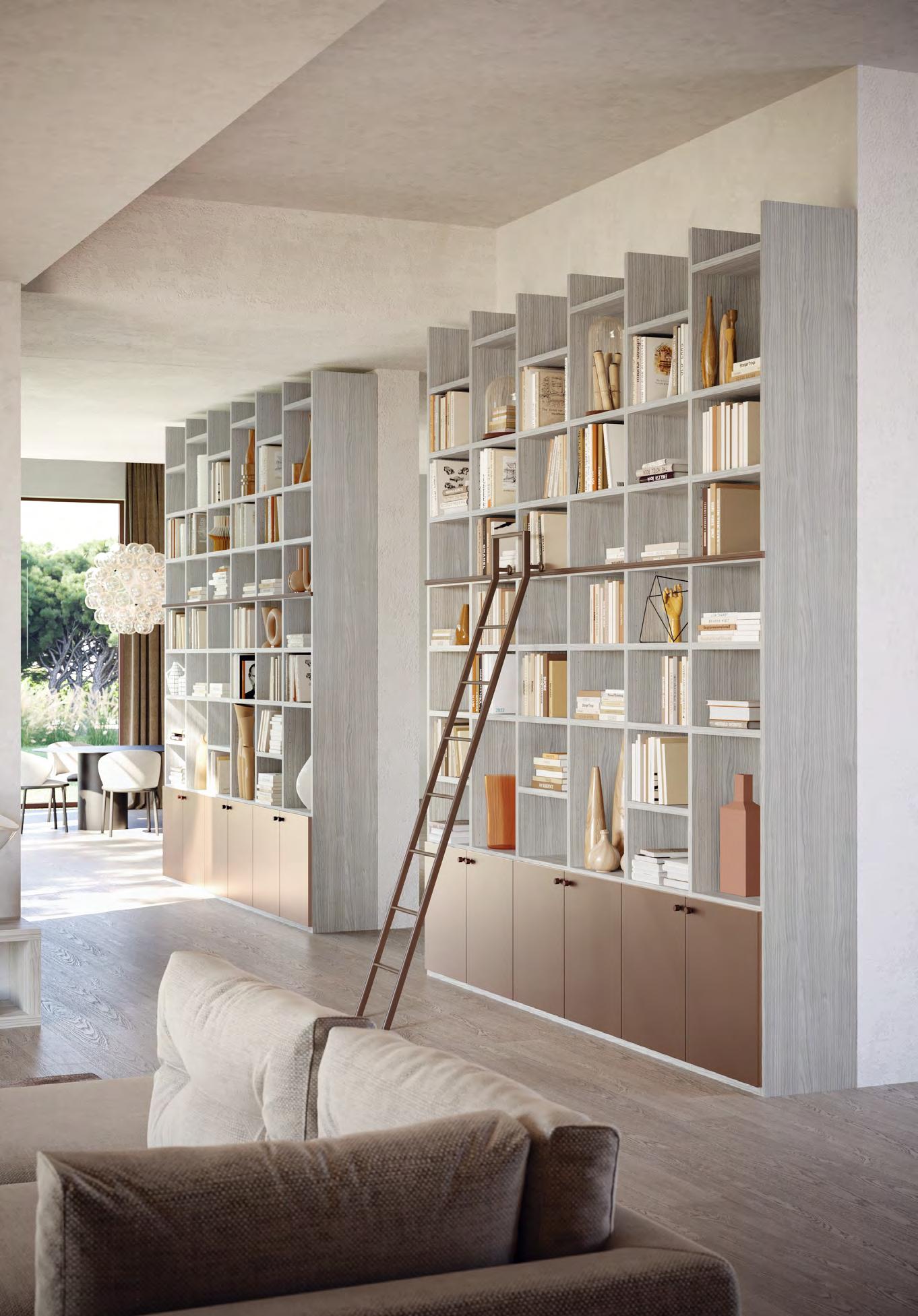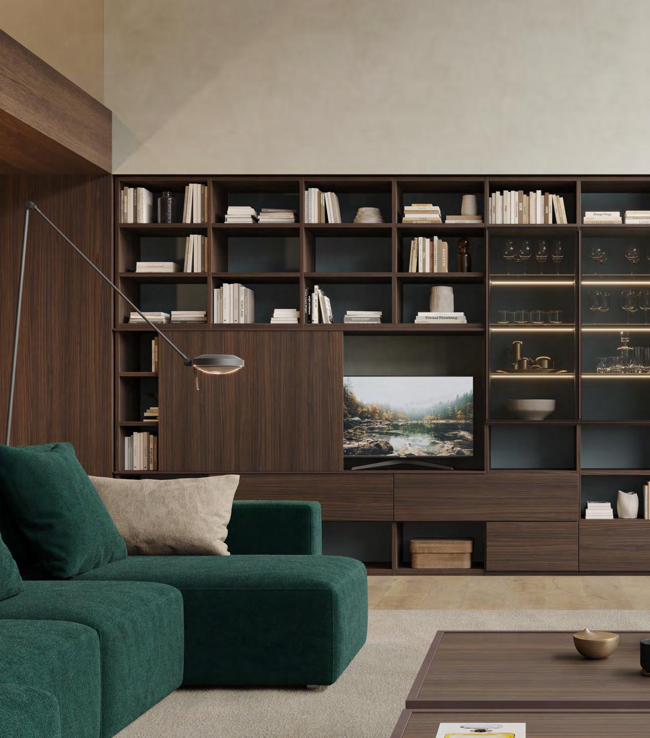 Ma il Living 2024 si impreziosisce soprattutto di finiture e colori: una palette di laccati più ispirata alla natura, che evoca sensazioni di tranquillità e pace; diverse nuove finiture vetro a scelta tra gli eleganti Canova e Sahara Noir effetto marmo, il Bronzo satinato dall’aspetto caldo e vellutato ed il cannettato Flutes Grigio scuro; tra i nuovi nobilitati introdotti spiccano invece Michelangelo e Marquinia che richiamano l’eleganza del marmo ed il Corten effetto ruggine; infine il nuovo color Rame introdotto per tutti gli accessori metallici che, affiancandosi ai preesistenti Brown e Champagne, aggiunge una nota di calore alle trame dei nostri vissuti.