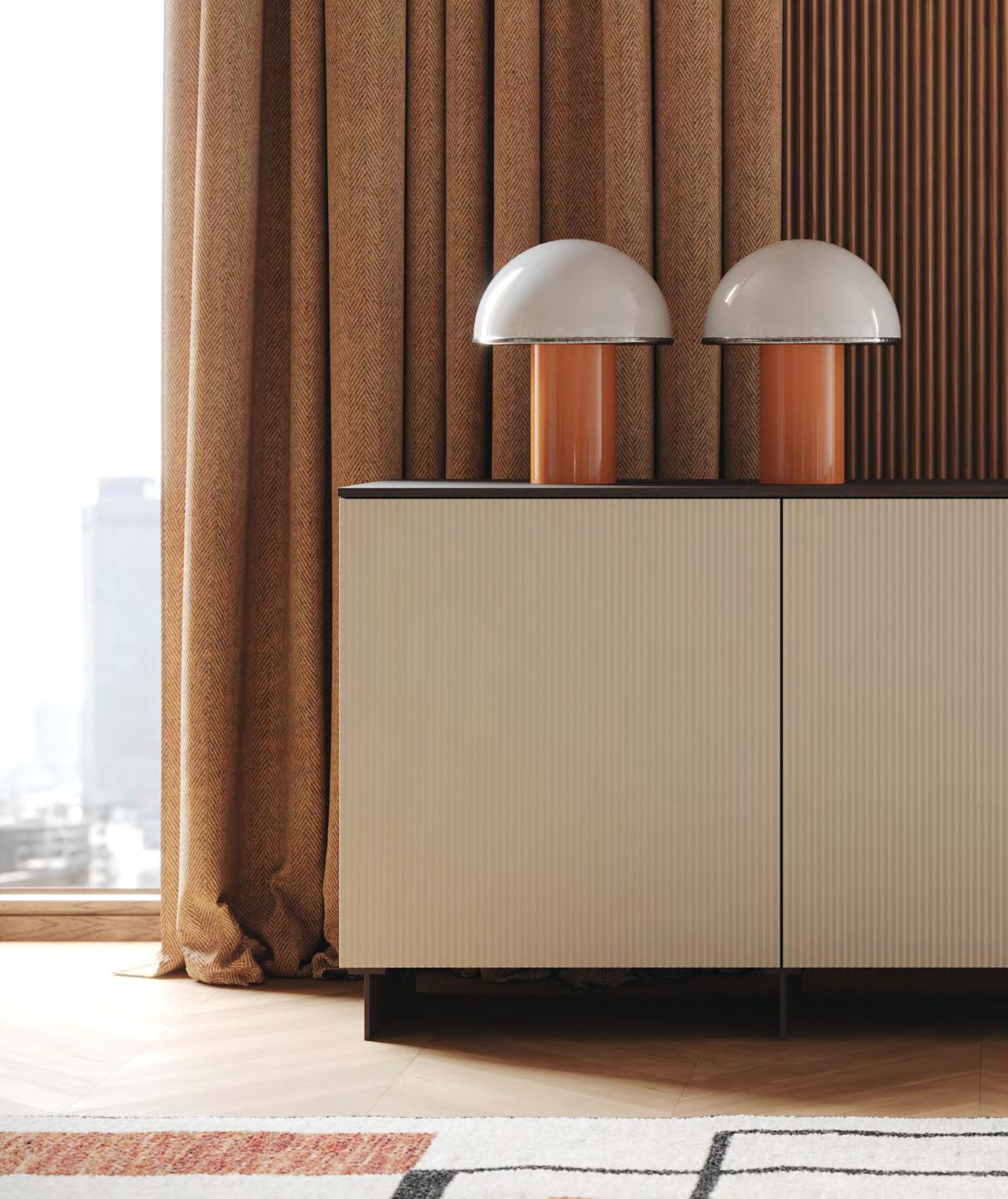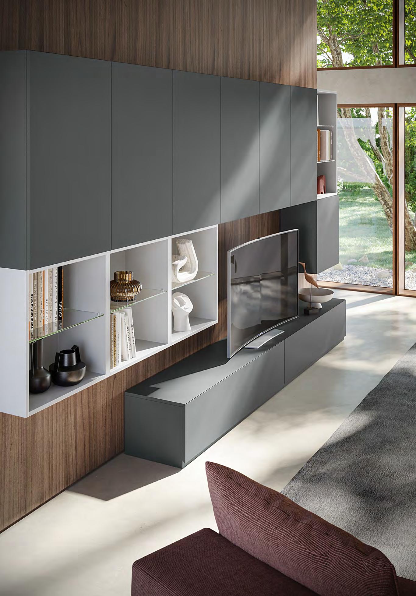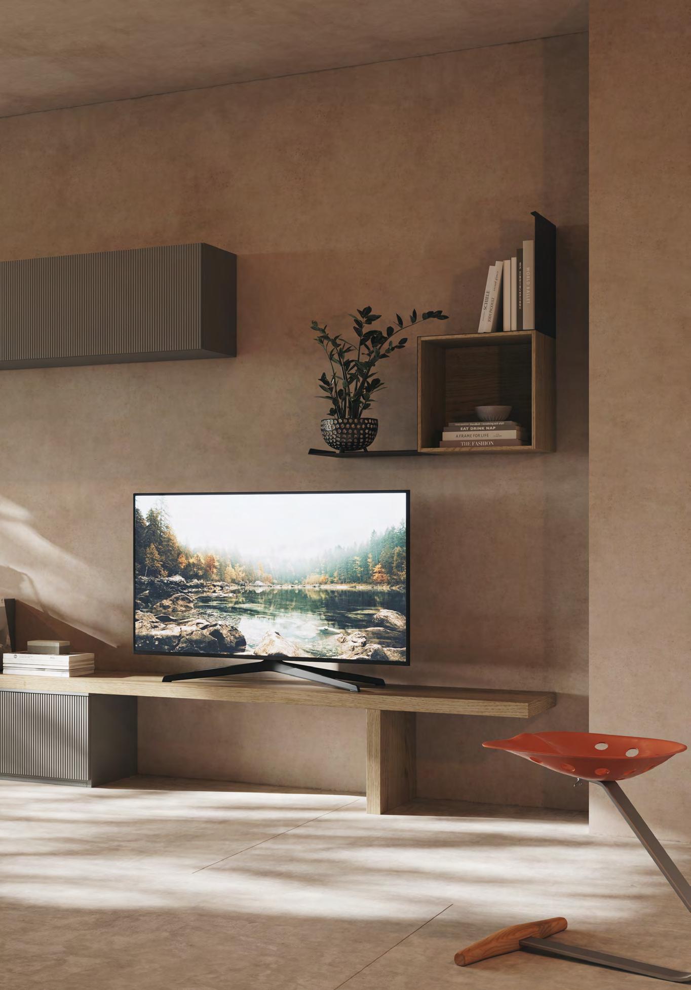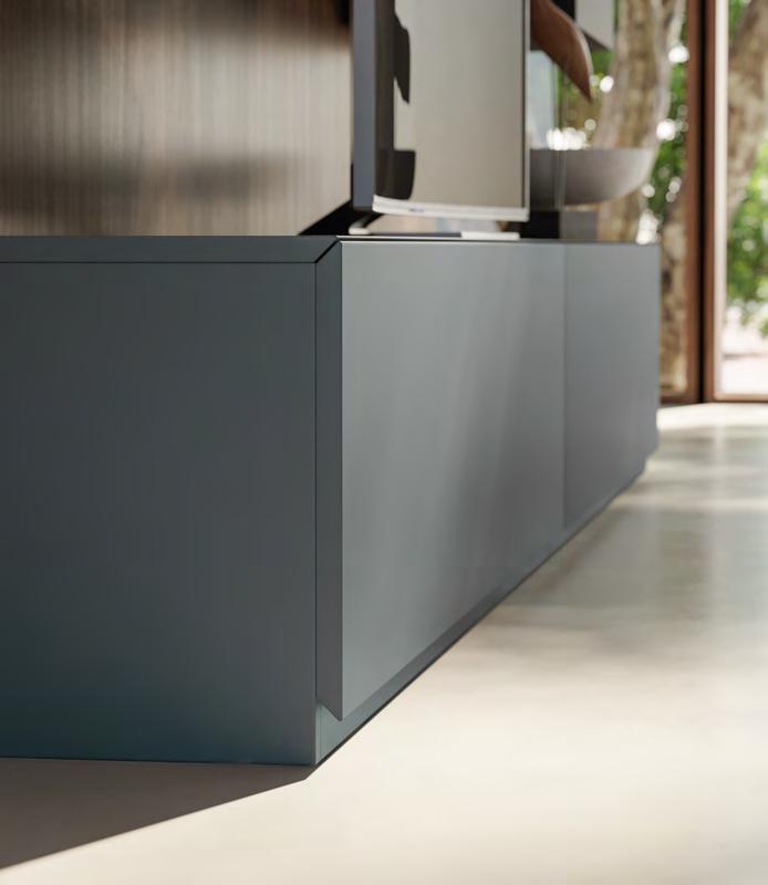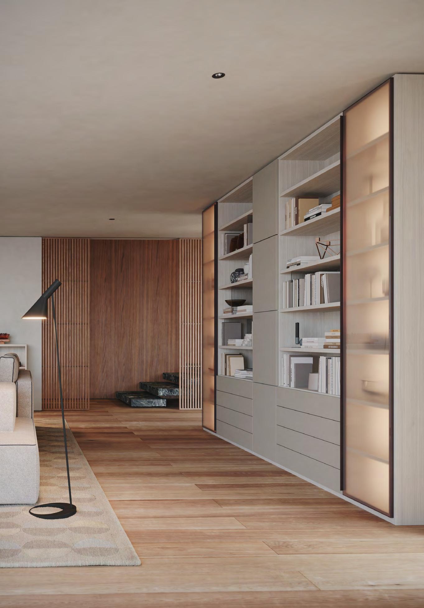 Ma il Living 2024 si impreziosisce soprattutto di finiture e colori: una palette di laccati più ispirata alla natura, che evoca sensazioni di tranquillità e pace; diverse nuove finiture vetro a scelta tra gli eleganti Canova e Sahara Noir effetto marmo, il Bronzo satinato dall’aspetto caldo e vellutato ed il cannettato Flutes Grigio scuro; tra i nuovi nobilitati introdotti spiccano invece Michelangelo e Marquinia che richiamano l’eleganza del marmo ed il Corten effetto ruggine; infine il nuovo color Rame introdotto per tutti gli accessori metallici che, affiancandosi ai preesistenti Brown e Champagne, aggiunge una nota di calore alle trame dei nostri vissuti.