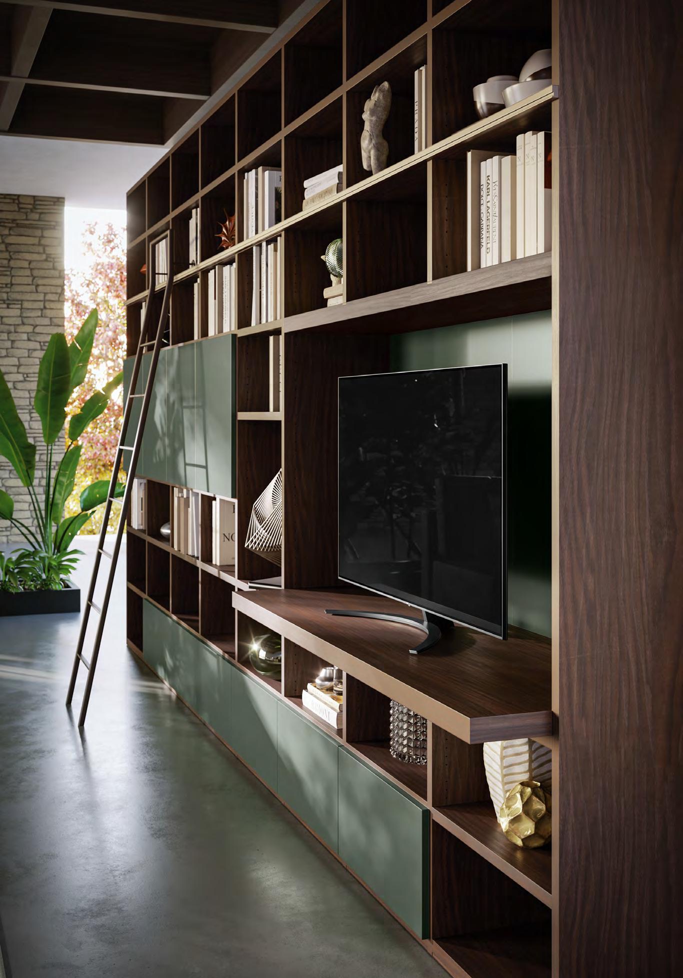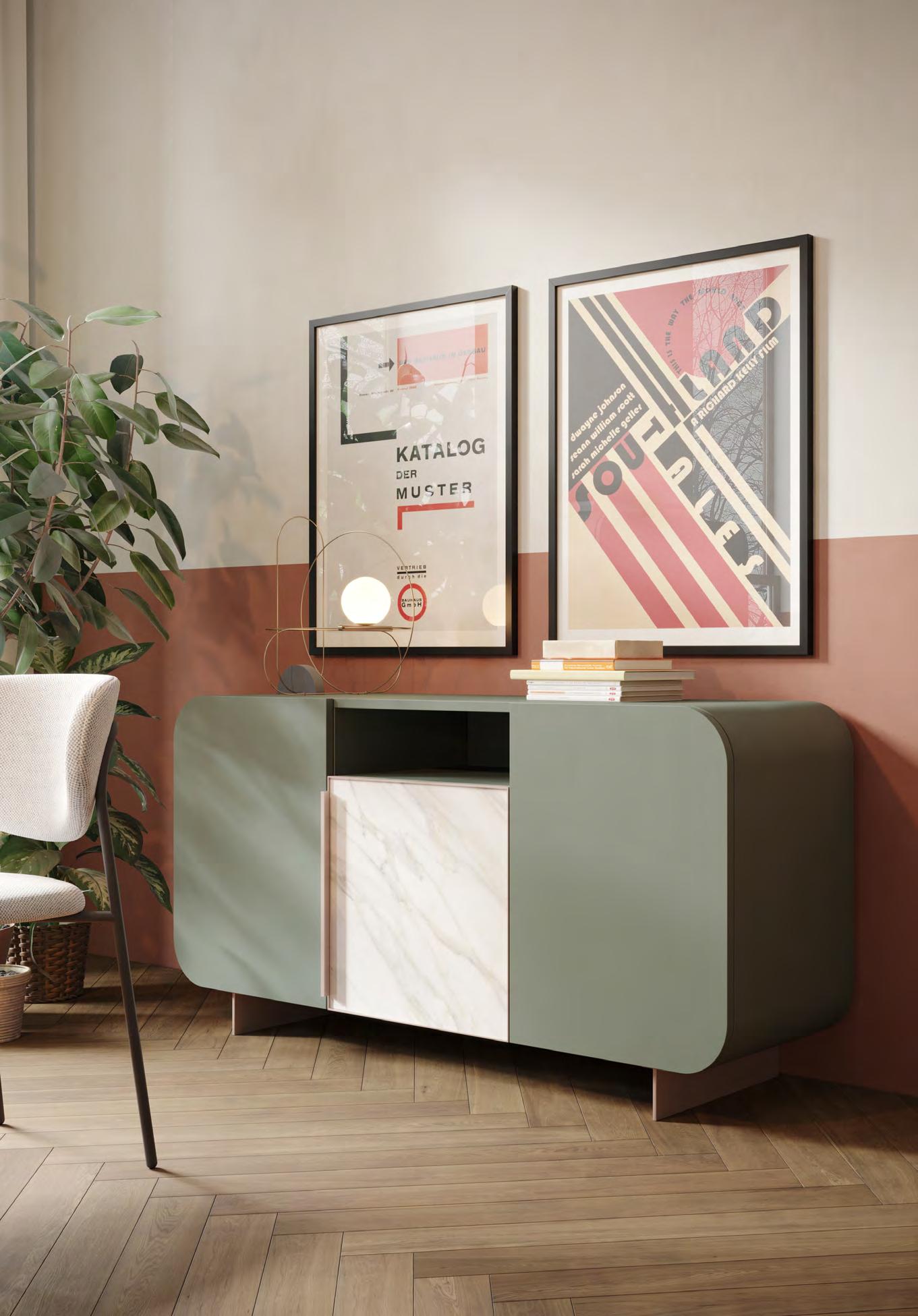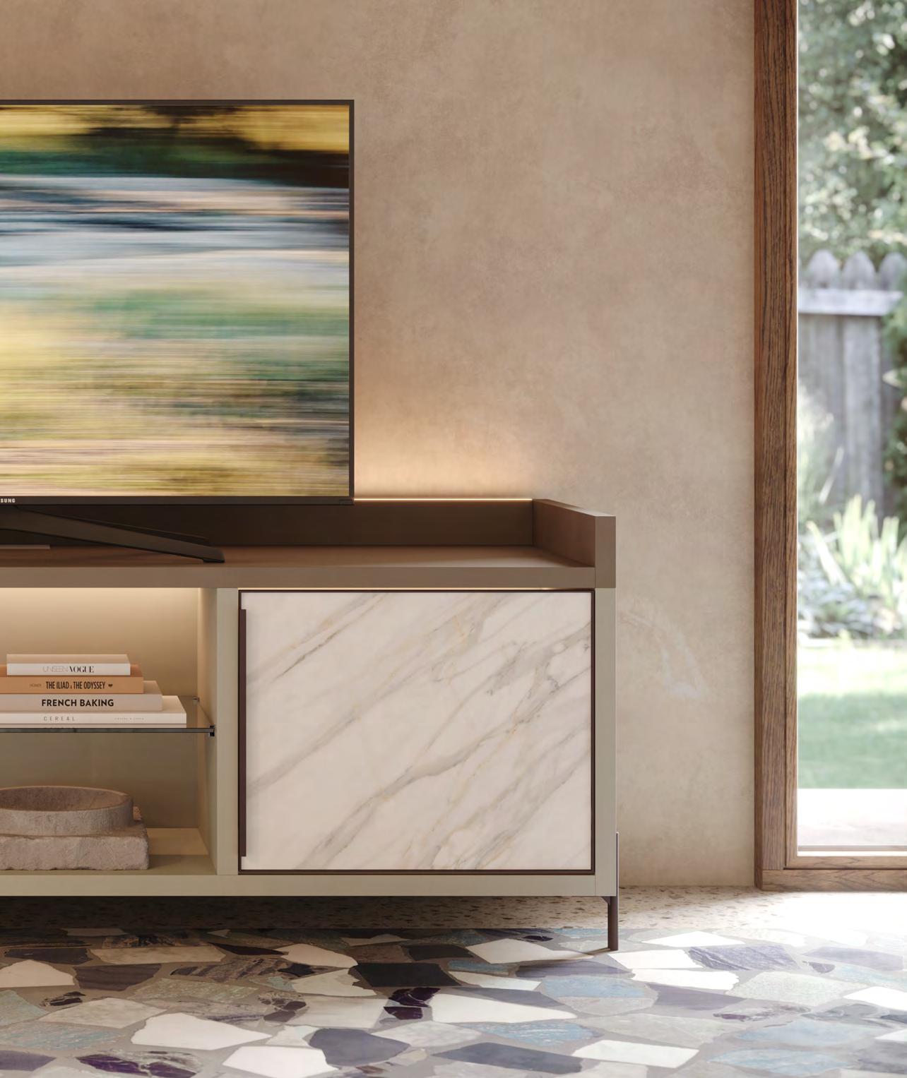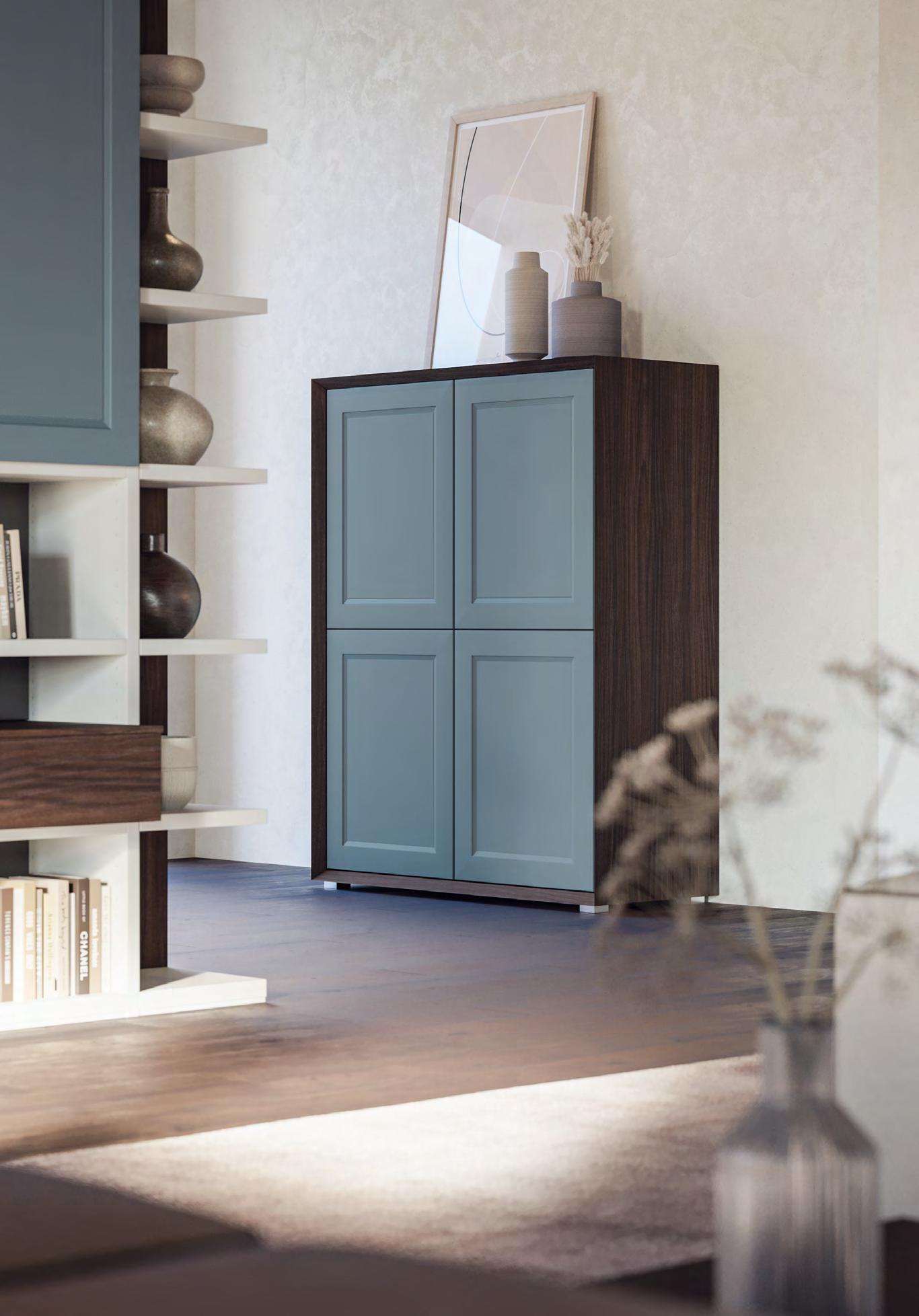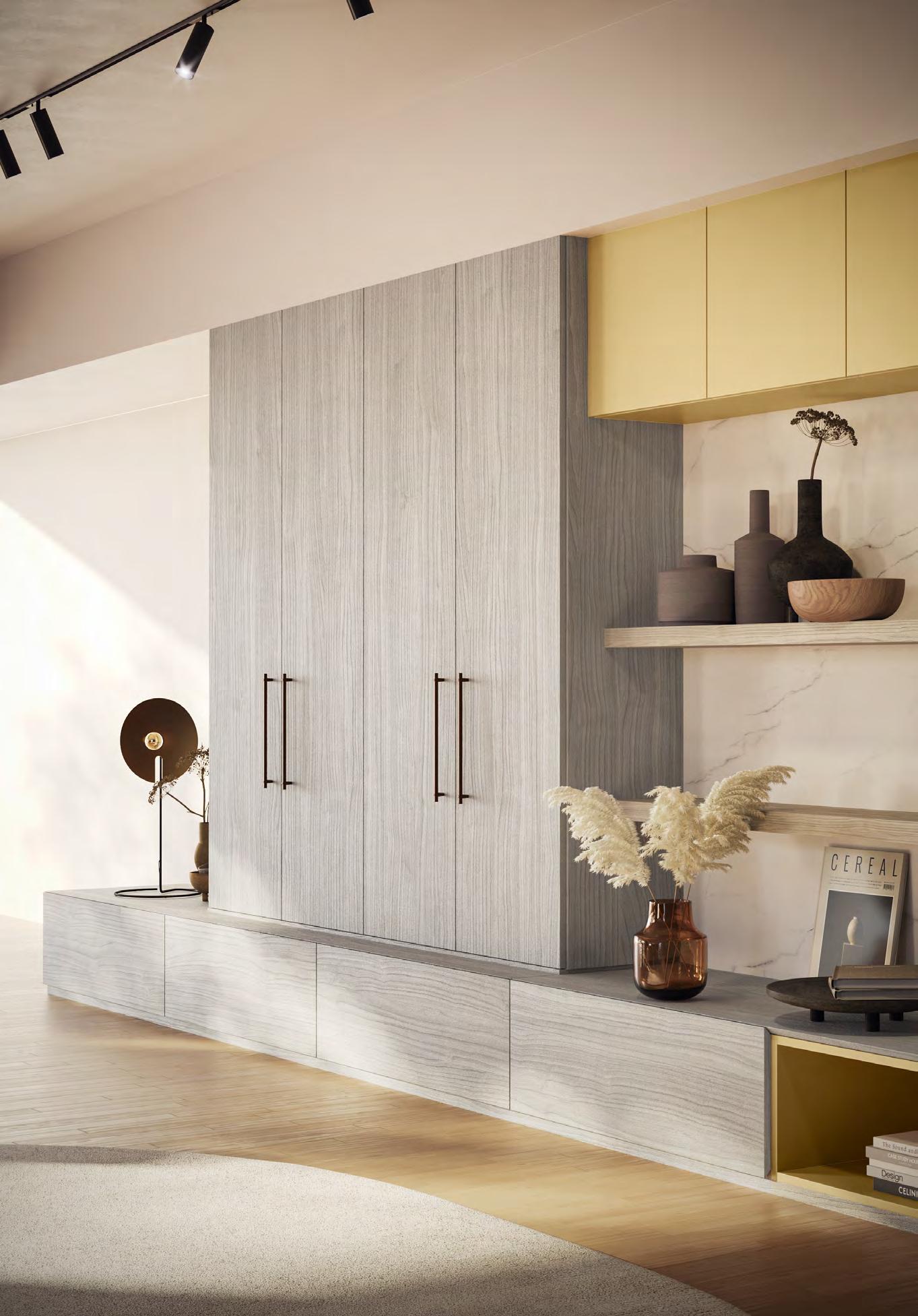 Ma il Living 2024 si impreziosisce soprattutto di finiture e colori: una palette di laccati più ispirata alla natura, che evoca sensazioni di tranquillità e pace; diverse nuove finiture vetro a scelta tra gli eleganti Canova e Sahara Noir effetto marmo, il Bronzo satinato dall’aspetto caldo e vellutato ed il cannettato Flutes Grigio scuro; tra i nuovi nobilitati introdotti spiccano invece Michelangelo e Marquinia che richiamano l’eleganza del marmo ed il Corten effetto ruggine; infine il nuovo color Rame introdotto per tutti gli accessori metallici che, affiancandosi ai preesistenti Brown e Champagne, aggiunge una nota di calore alle trame dei nostri vissuti.