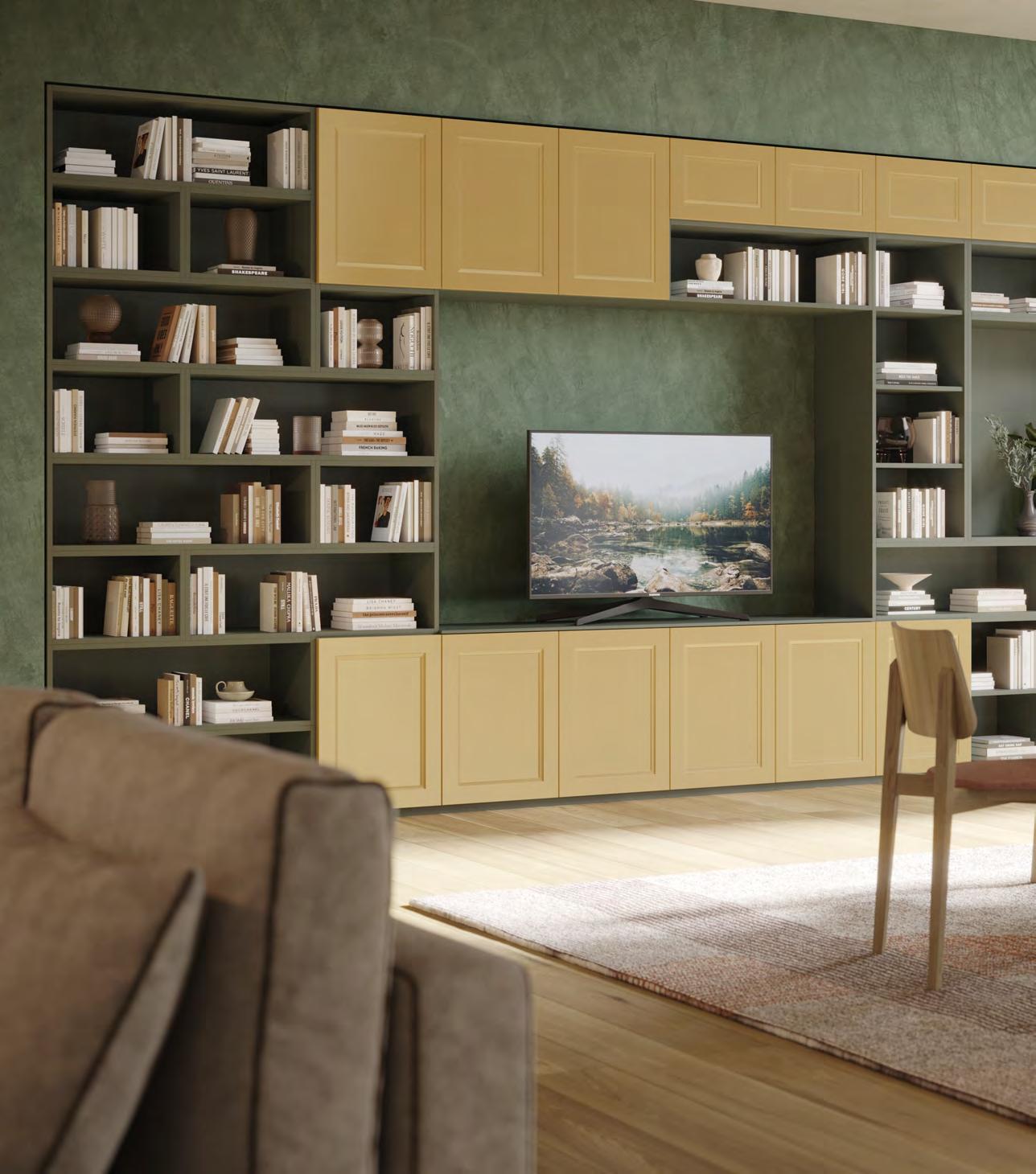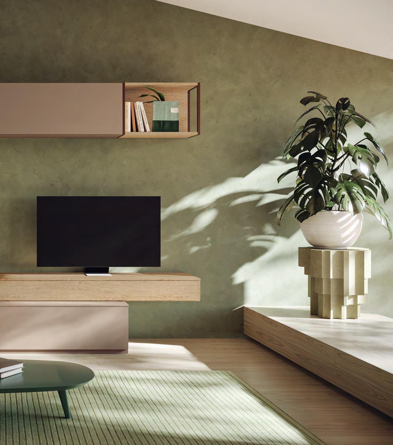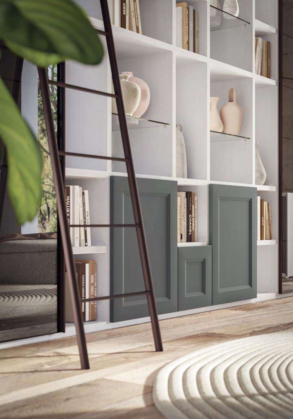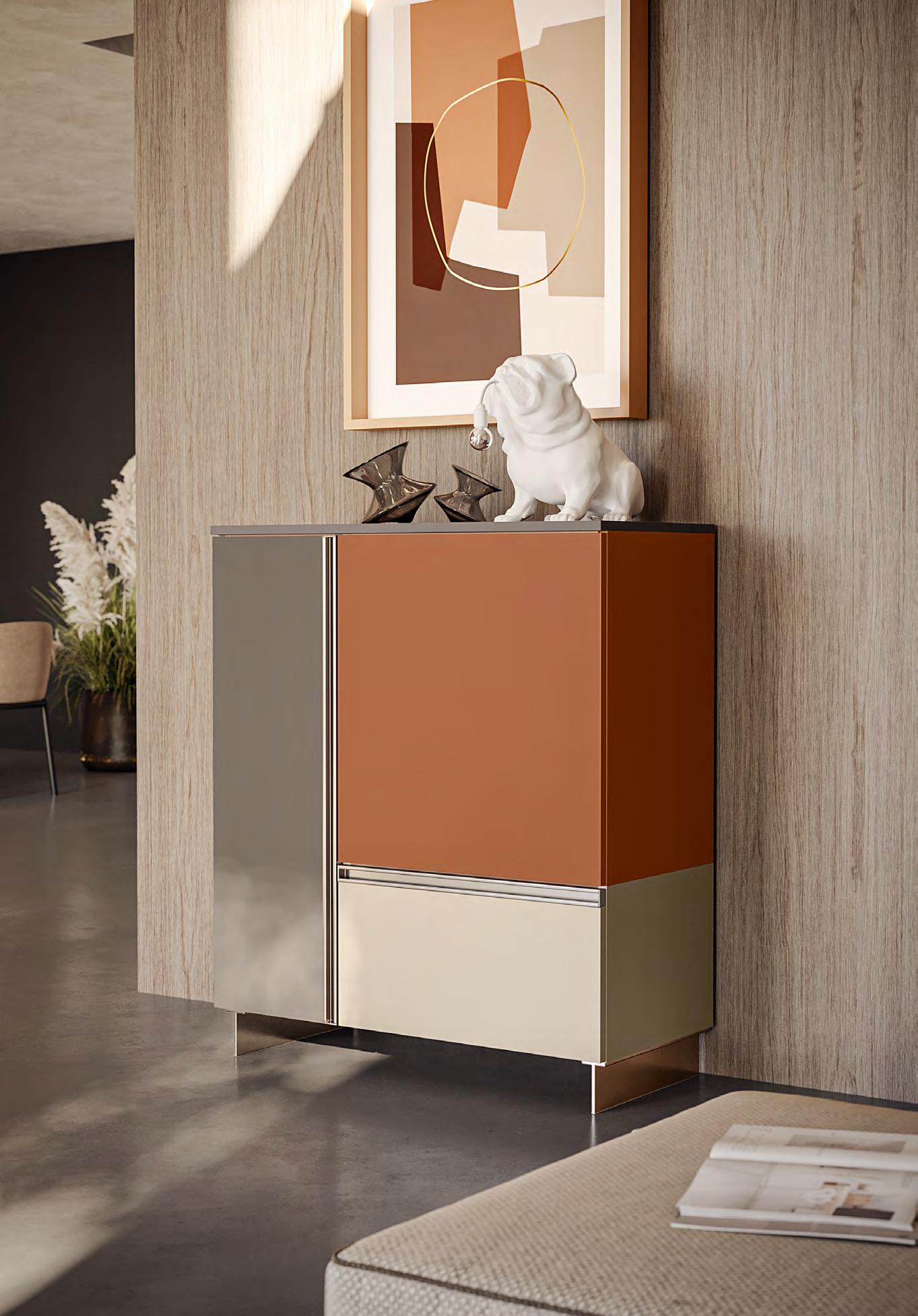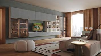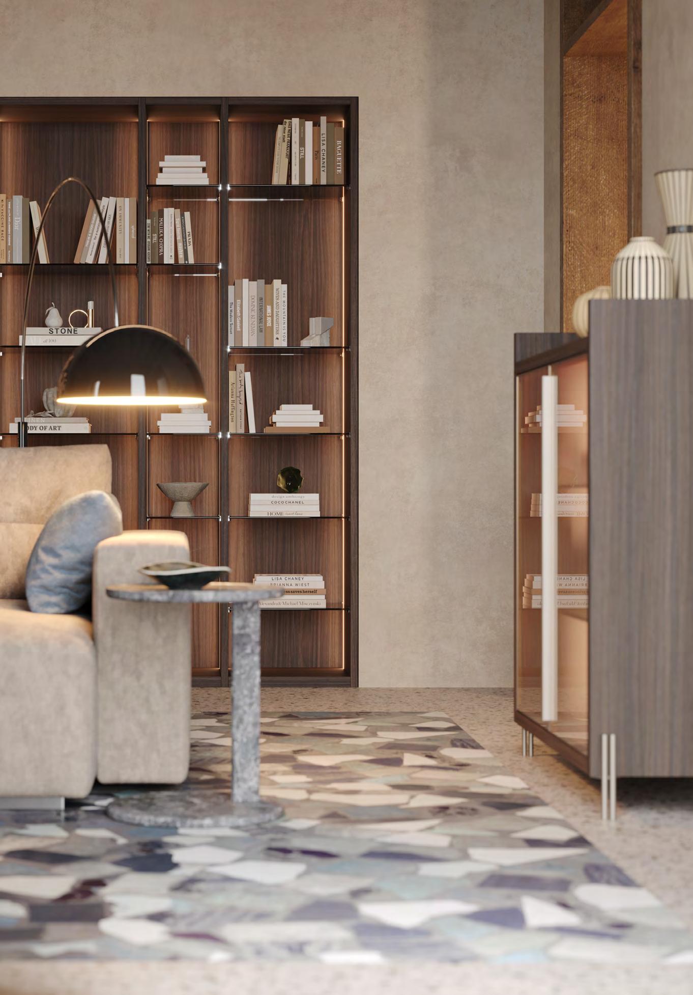 Ma il Living 2024 si impreziosisce soprattutto di finiture e colori: una palette di laccati più ispirata alla natura, che evoca sensazioni di tranquillità e pace; diverse nuove finiture vetro a scelta tra gli eleganti Canova e Sahara Noir effetto marmo, il Bronzo satinato dall’aspetto caldo e vellutato ed il cannettato Flutes Grigio scuro; tra i nuovi nobilitati introdotti spiccano invece Michelangelo e Marquinia che richiamano l’eleganza del marmo ed il Corten effetto ruggine; infine il nuovo color Rame introdotto per tutti gli accessori metallici che, affiancandosi ai preesistenti Brown e Champagne, aggiunge una nota di calore alle trame dei nostri vissuti.