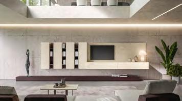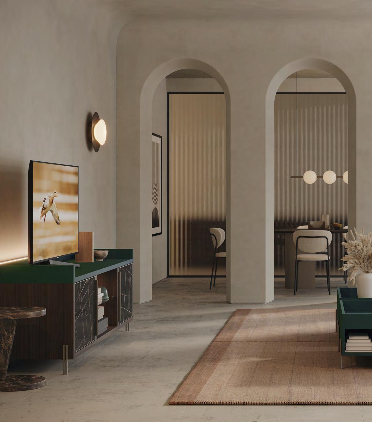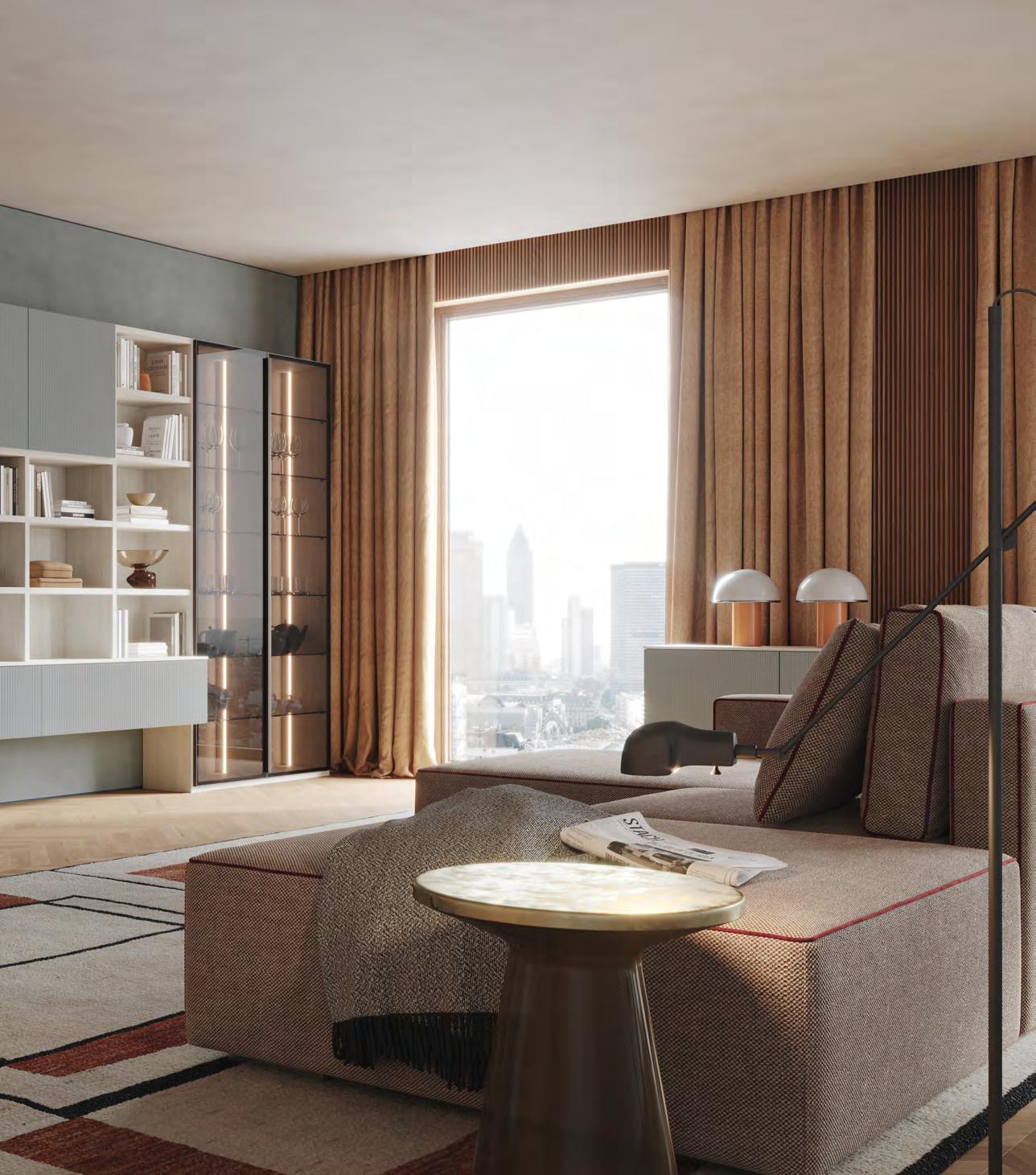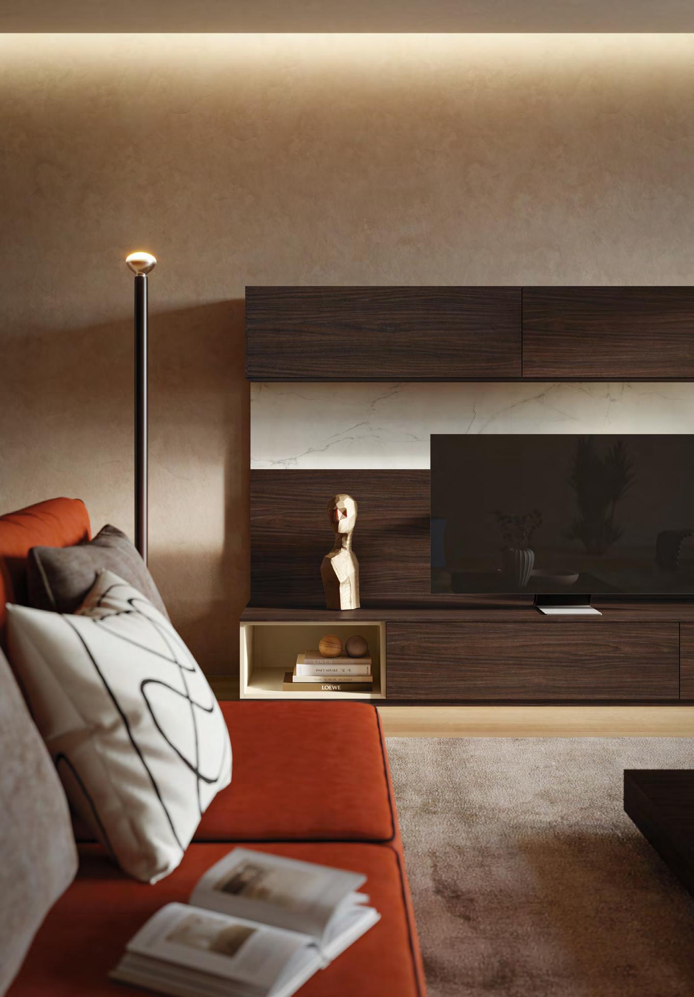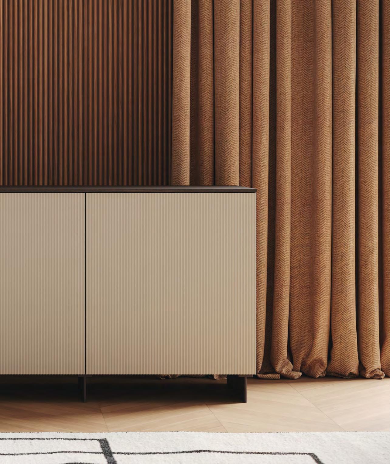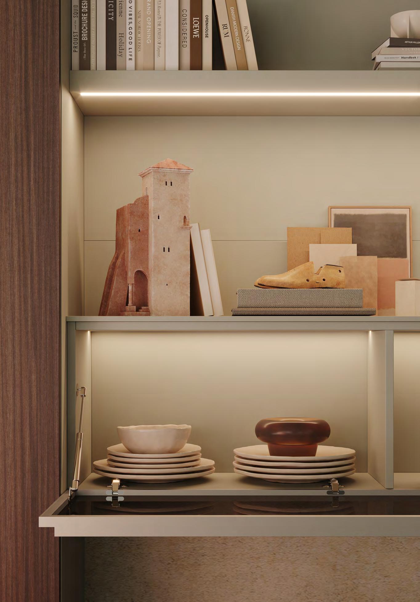Ma il Living 2024 si impreziosisce soprattutto di finiture e colori: una palette di laccati più ispirata alla natura, che evoca sensazioni di tranquillità e pace; diverse nuove finiture vetro a scelta tra gli eleganti Canova e Sahara Noir effetto marmo, il Bronzo satinato dall’aspetto caldo e vellutato ed il cannettato Flutes Grigio scuro; tra i nuovi nobilitati introdotti spiccano invece Michelangelo e Marquinia che richiamano l’eleganza del marmo ed il Corten effetto ruggine; infine il nuovo color Rame introdotto per tutti gli accessori metallici che, affiancandosi ai preesistenti Brown e Champagne, aggiunge una nota di calore alle trame dei nostri vissuti.