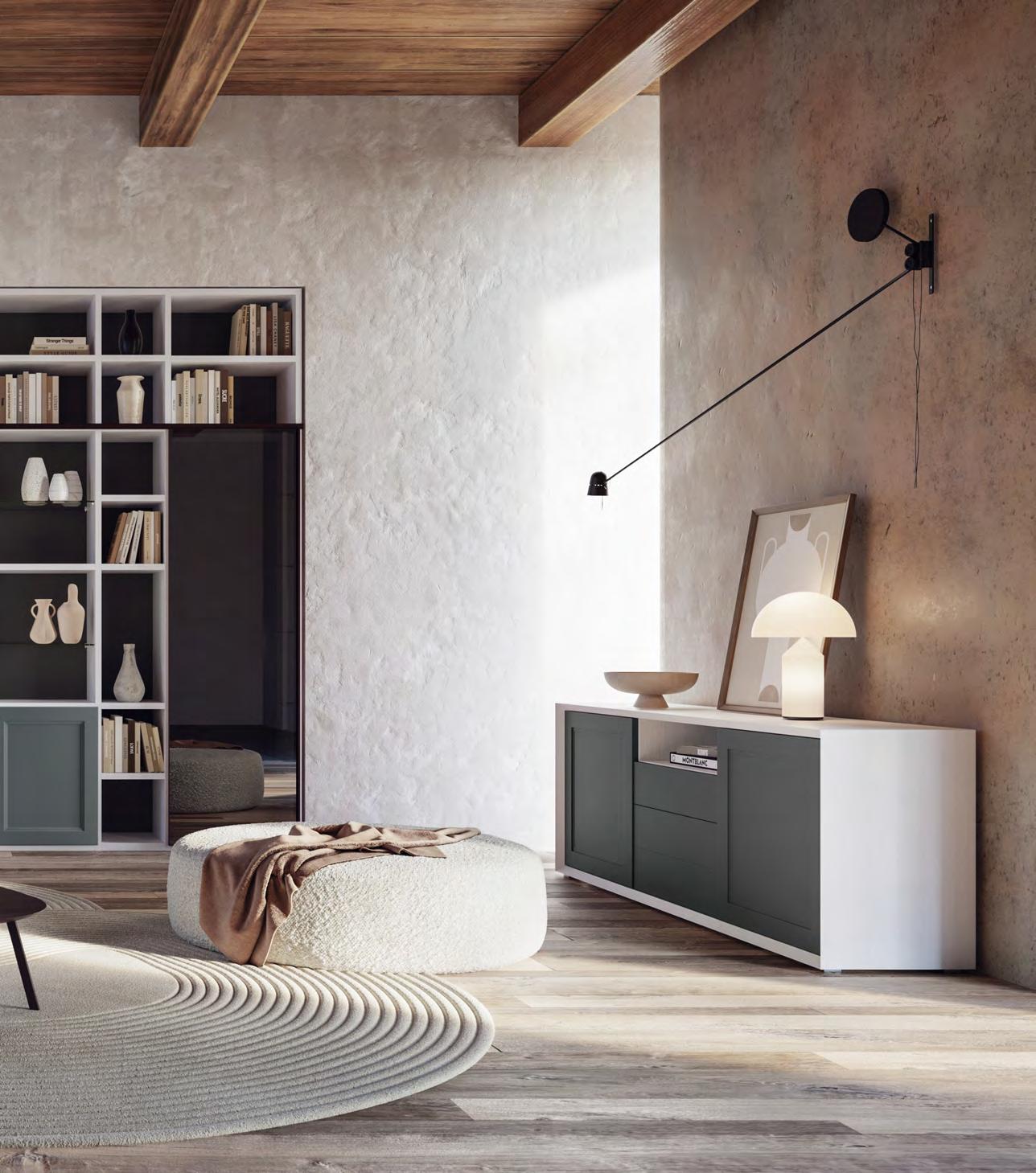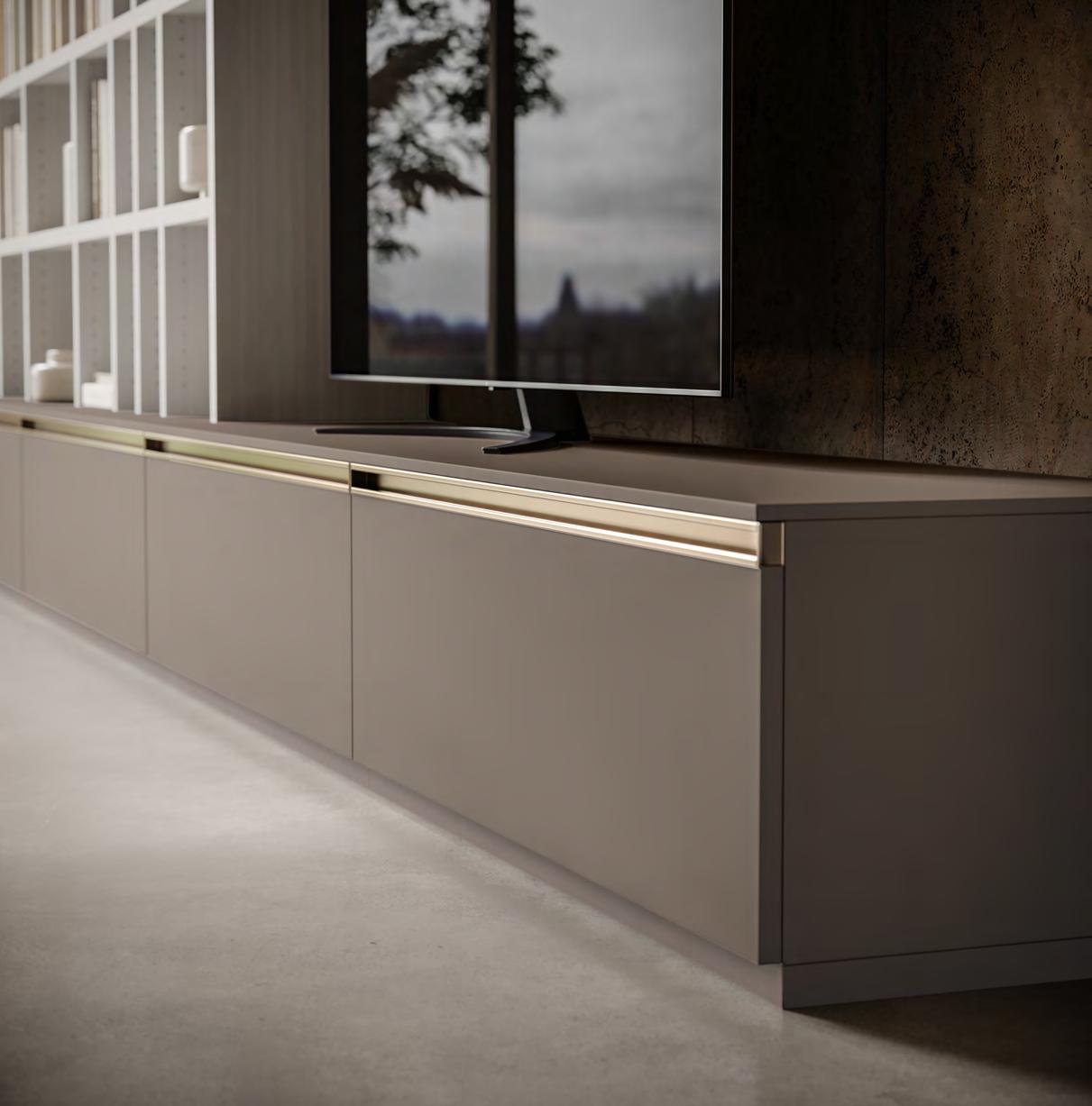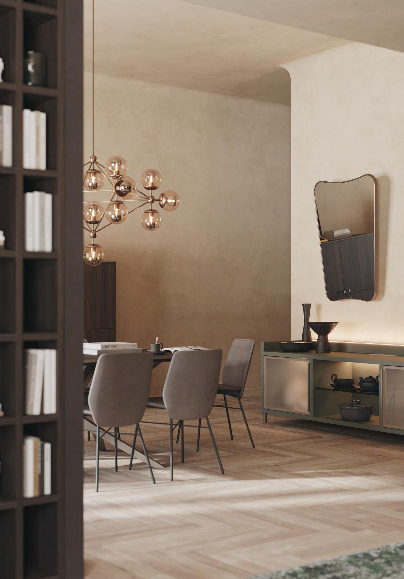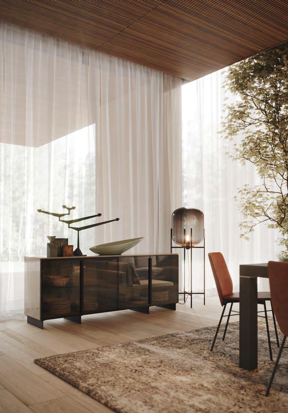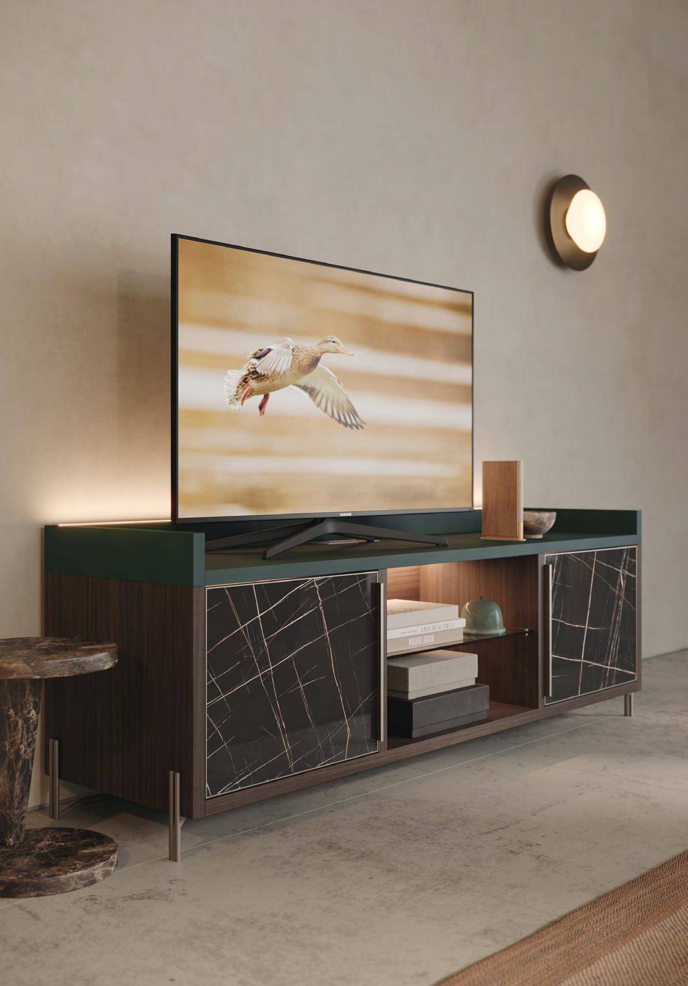 Ma il Living 2024 si impreziosisce soprattutto di finiture e colori: una palette di laccati più ispirata alla natura, che evoca sensazioni di tranquillità e pace; diverse nuove finiture vetro a scelta tra gli eleganti Canova e Sahara Noir effetto marmo, il Bronzo satinato dall’aspetto caldo e vellutato ed il cannettato Flutes Grigio scuro; tra i nuovi nobilitati introdotti spiccano invece Michelangelo e Marquinia che richiamano l’eleganza del marmo ed il Corten effetto ruggine; infine il nuovo color Rame introdotto per tutti gli accessori metallici che, affiancandosi ai preesistenti Brown e Champagne, aggiunge una nota di calore alle trame dei nostri vissuti.