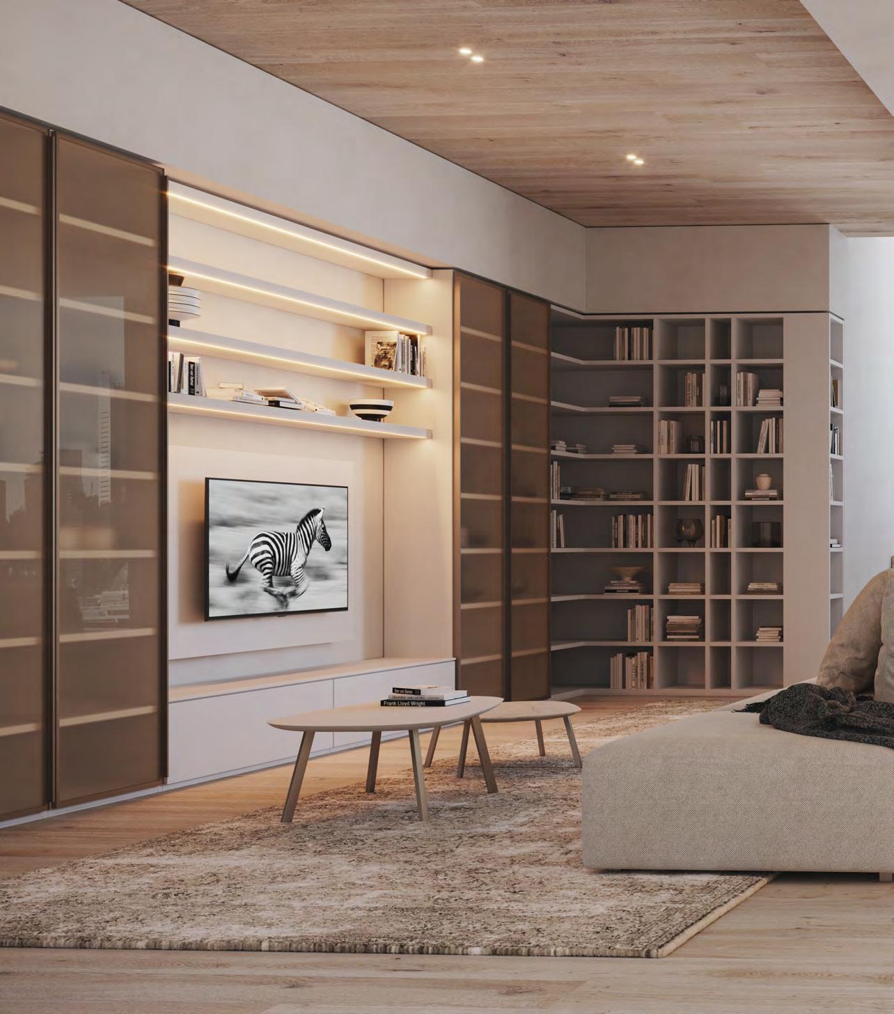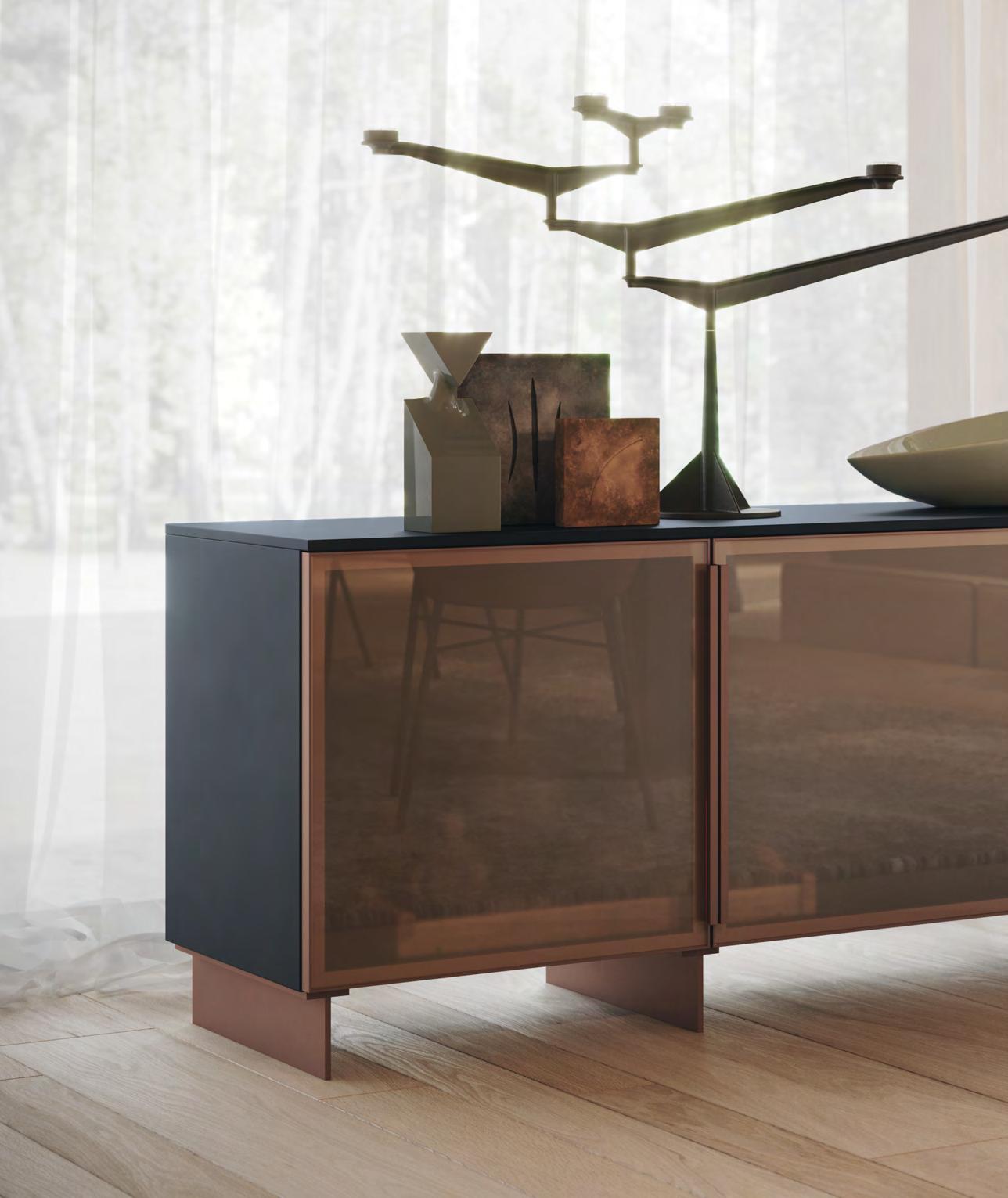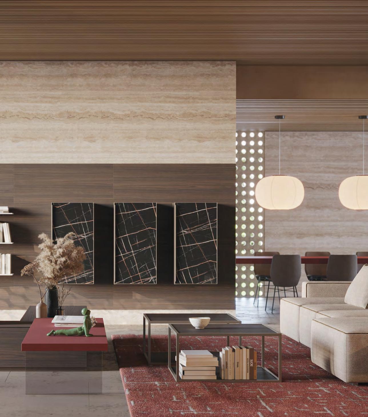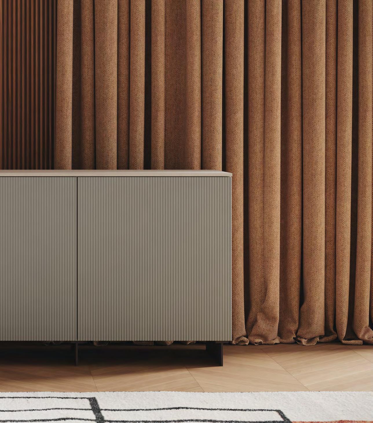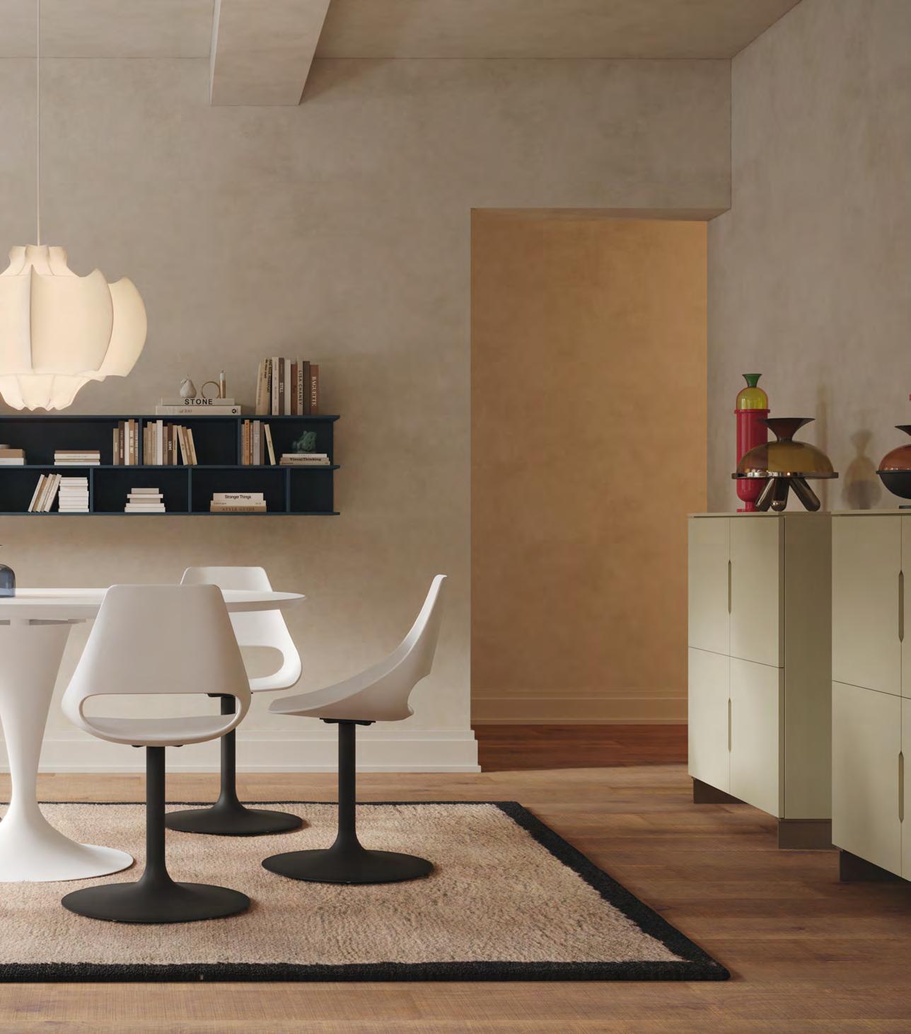 Ma il Living 2024 si impreziosisce soprattutto di finiture e colori: una palette di laccati più ispirata alla natura, che evoca sensazioni di tranquillità e pace; diverse nuove finiture vetro a scelta tra gli eleganti Canova e Sahara Noir effetto marmo, il Bronzo satinato dall’aspetto caldo e vellutato ed il cannettato Flutes Grigio scuro; tra i nuovi nobilitati introdotti spiccano invece Michelangelo e Marquinia che richiamano l’eleganza del marmo ed il Corten effetto ruggine; infine il nuovo color Rame introdotto per tutti gli accessori metallici che, affiancandosi ai preesistenti Brown e Champagne, aggiunge una nota di calore alle trame dei nostri vissuti.